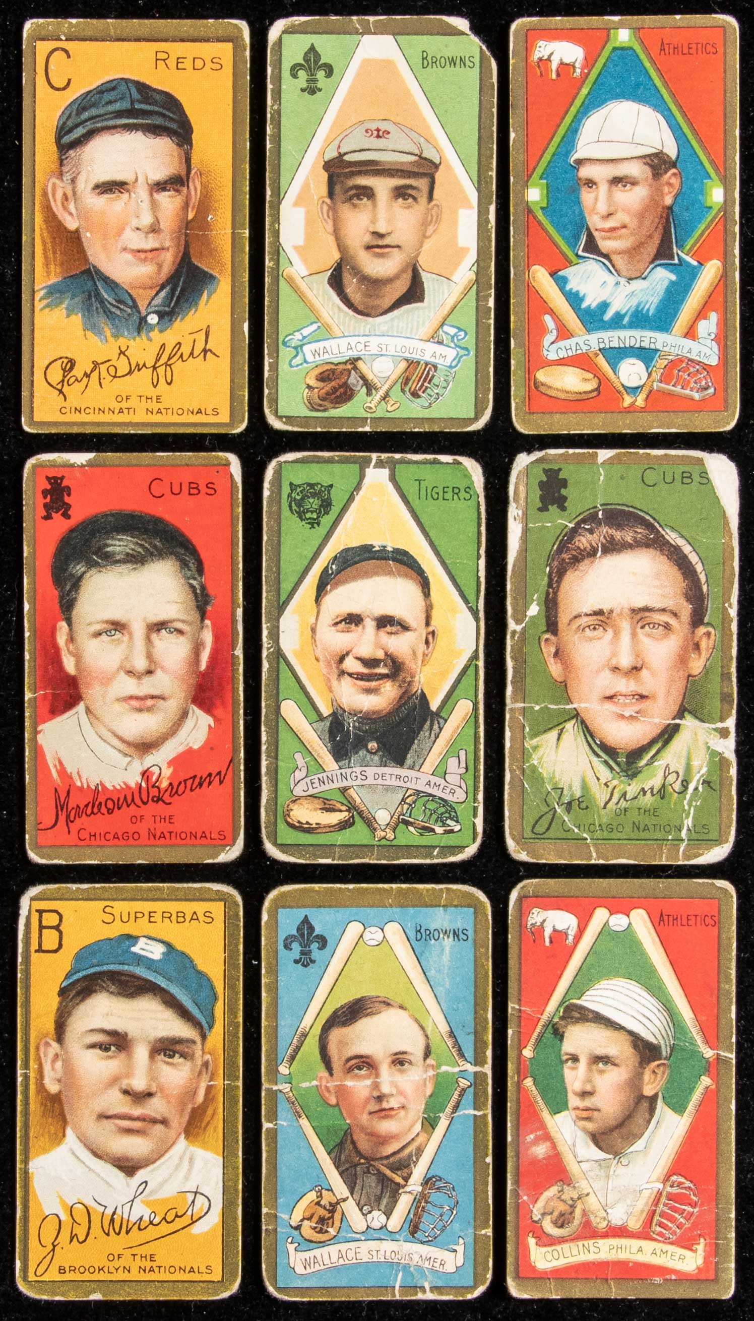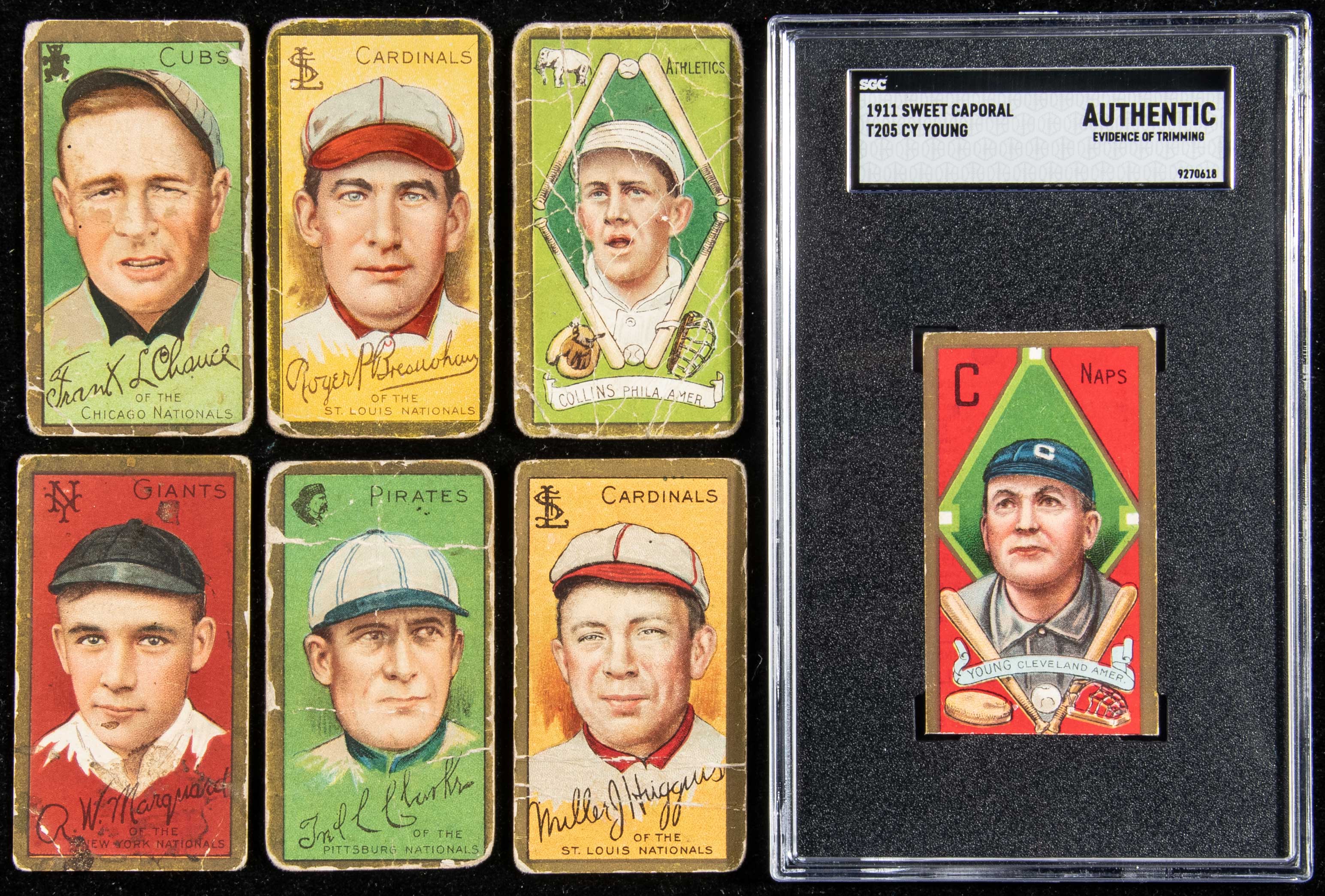 Description:1911 T-205 Gold Border partial set - (150) different with (16) Hall of Famers including Cy Young. Sizable lot of cards from the popular Gold Border series representing a solid start to a set with (150) of the (208) cards (not factoring additional variations/errors/etc.) represented. Mostly Piedmont, Sweet Caporal, and Polar Bear backs with a handful of others mixed in. All have been well loved with overall grade falling toward lower end of the scale and average card around FR/GD. General range runs PR to VG and there are a portion which would not qualify for a number grade due to even more substantial flaws. The Cy Young card has the lower edge trimmed off (and is in an SGC Authentic holder). Notables include Bender (GD), Bresnahan (mouth closed) (FR/GD-GD), Brown (American Beauty) (FR/GD-GD), Chance (PR/FR), Clarke (PR), Collins (mouth closed) (FR), Collins (mouth open) (PR), Griffith (FR/GD-GD), Huggins (FR), Jennings (PR), Marquard (FR), Tinker (PR), Wallace (cap) (PR), Wallace (no cap) (FR), and Wheat (FR). An expanded listing is available upon request: Avg. FR/GD