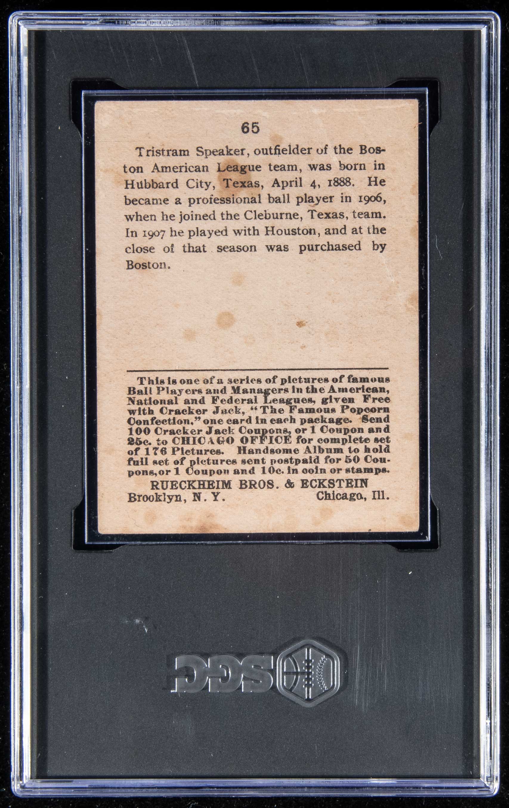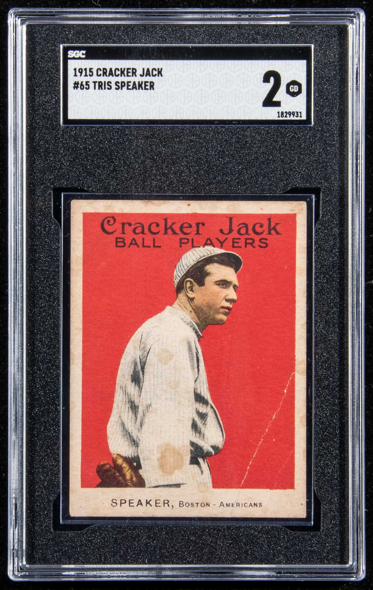 1915 Cracker Jack #65 Tris Speaker (SGC 2 GD). Vivid red background hosting a well registered likeness. There are a pair of creases to lower right and the expected spotting/stains: SGC 2 GD