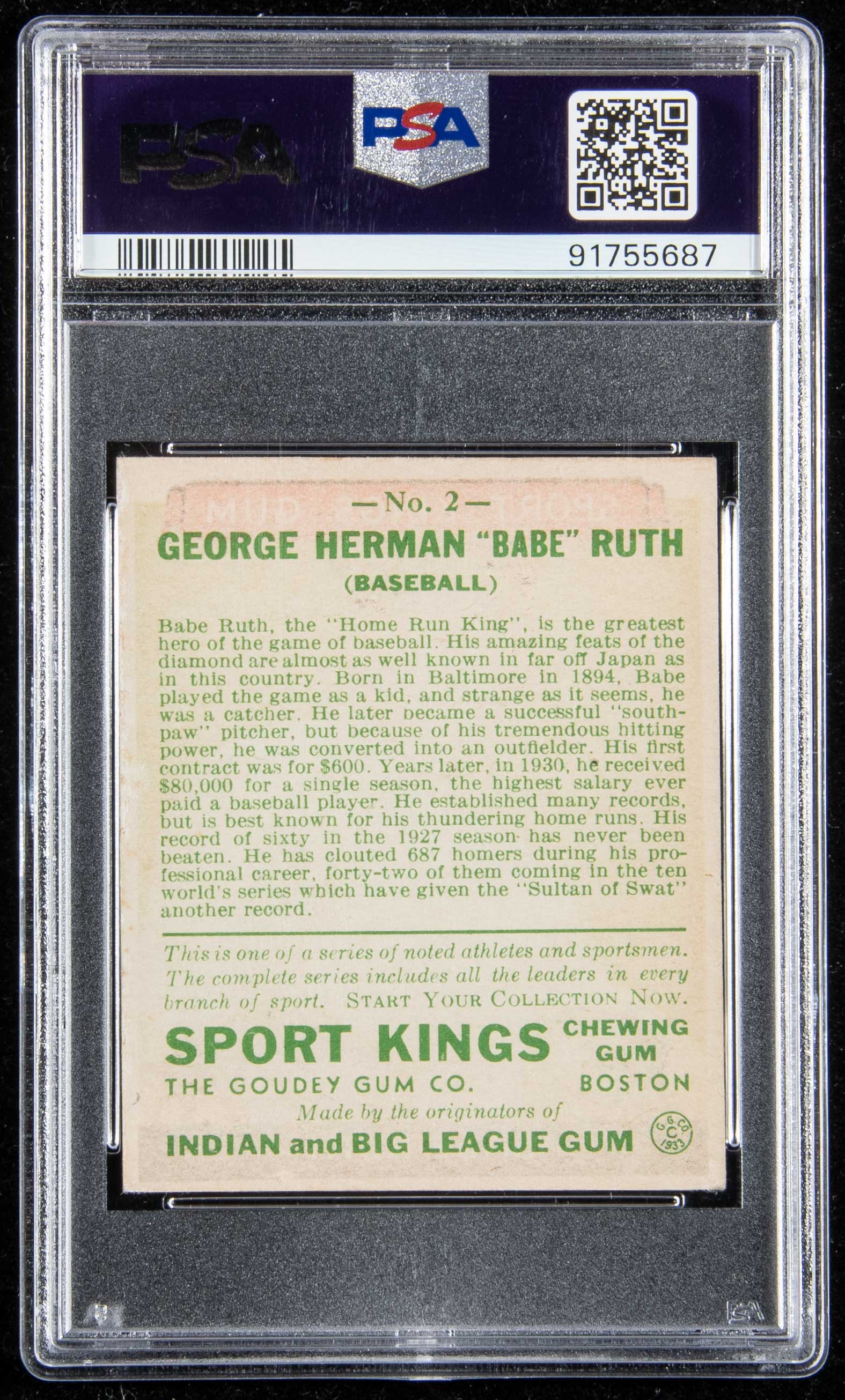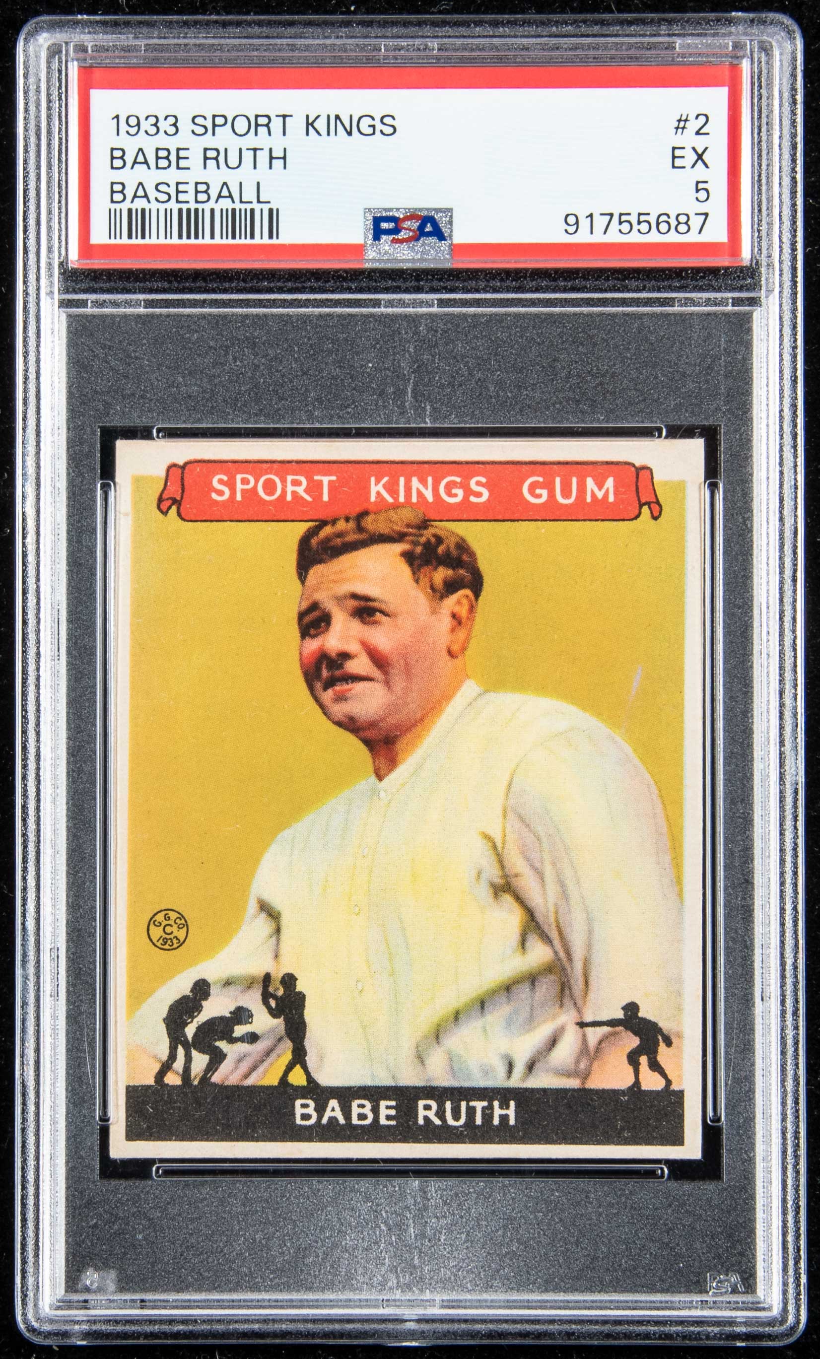 Description:Fine 1933 Goudey Sport Kings #2 Babe Ruth (PSA 5 EX). Outstanding example of one the more desirable cards produced in the period showing Ruth at the height of his career. Well centered with crisp registration and bold color. Corners and edges are sharp with magnification needed to see the slight touch of evident wear. Recently graded after having long been one of the centerpieces of the same private collection for at least two decades: PSA EX 5