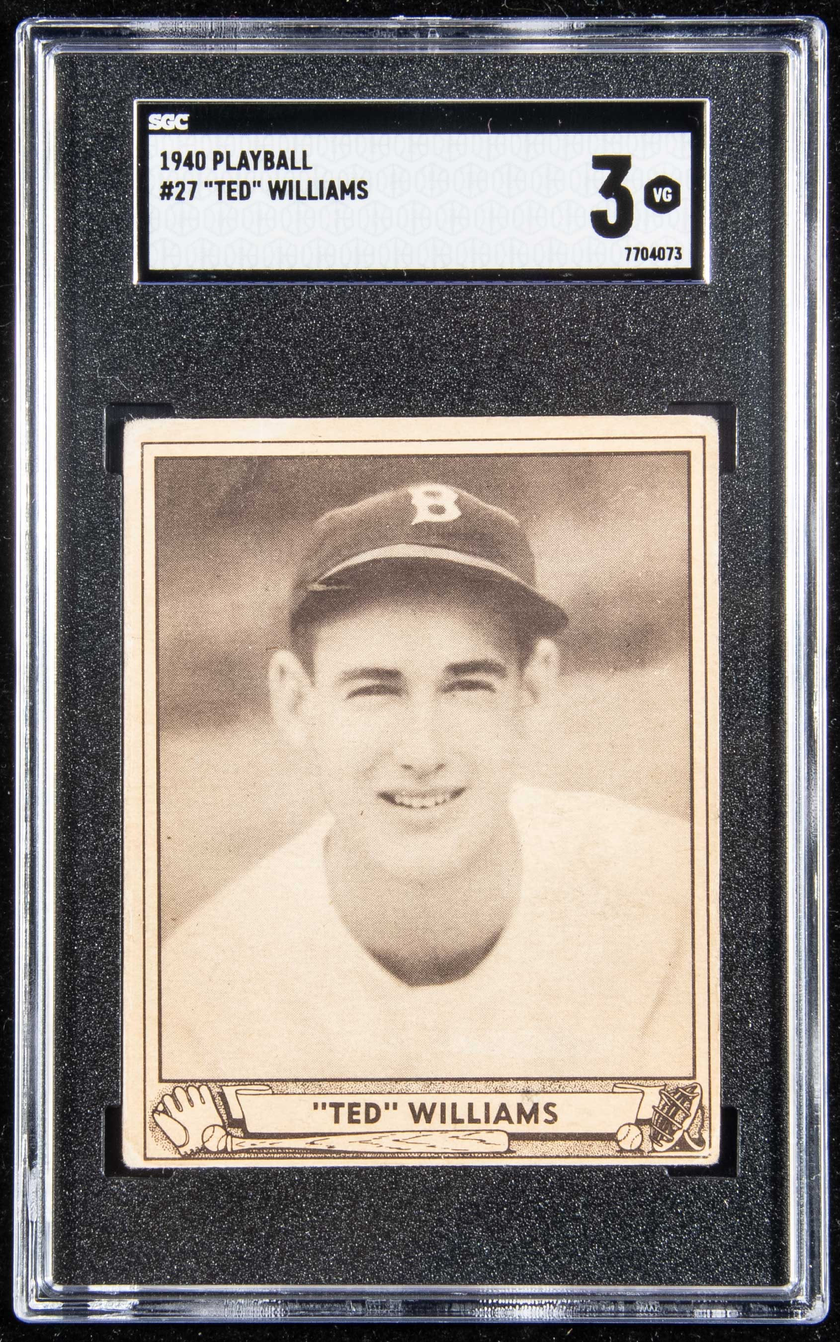 1940 Play Ball #27 Ted Williams (SGC 3 VG). Key card with centering that favors the lower edge and some mild general wear: SGC 3 VG
