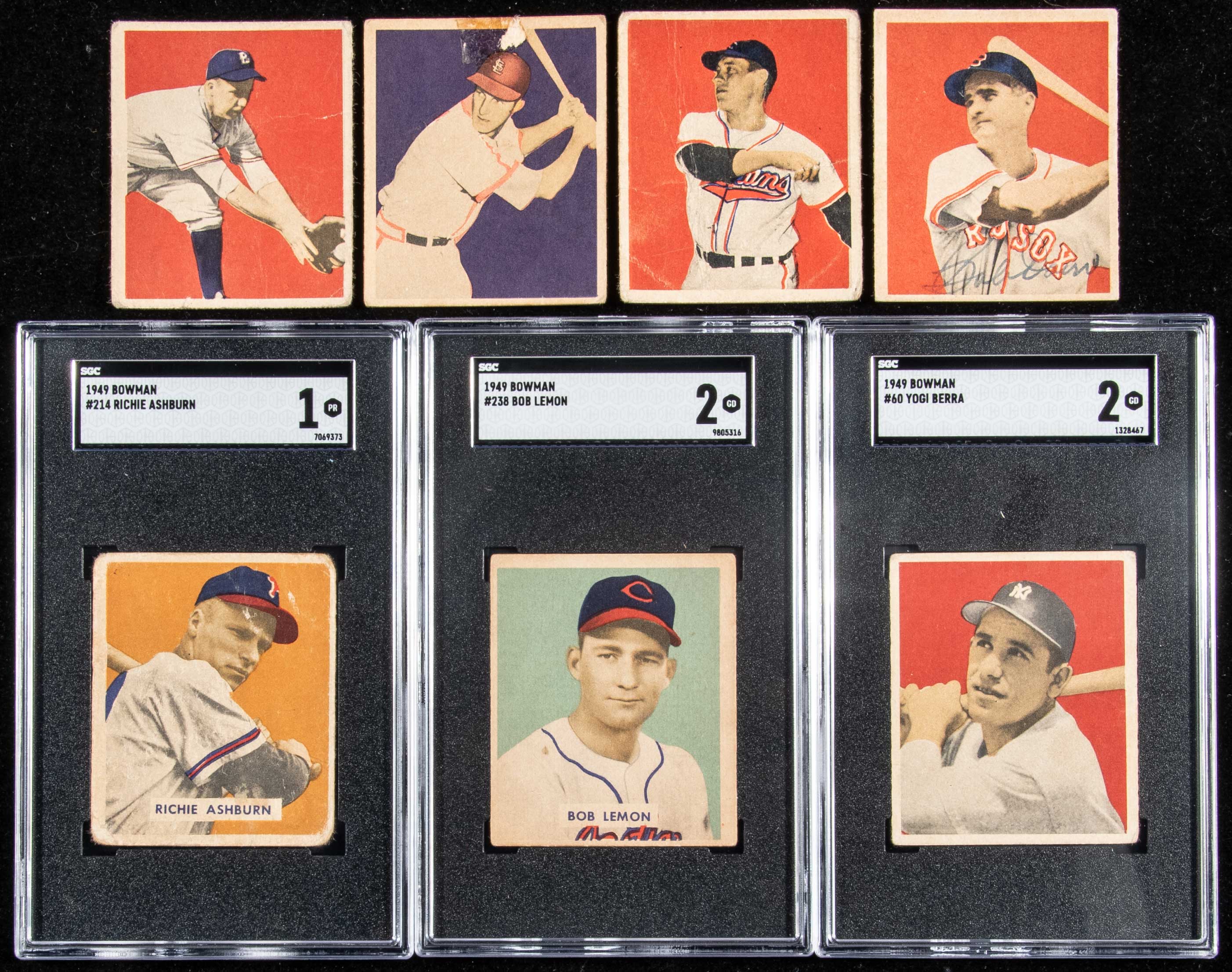 Description:1949 Bowman Baseball near complete set (230 of 240 cards). Near complete set in varied condition however the bulk of cards grade VG or lesser and GD should be considered the average (with a portion lesser). There are a handful of nicer VG/EX and EX cards mixed in. Missing #3, 50 Robinson, 72, 76, 84 Campanella, 138, 147, 224 Paige, 226 Snider, and 233 Doby. Keys: #23 Doerr (VG, autographed in ink, 7 out of 10), 24 Musial (PR), 26 Kell (VG-VG/EX), 27 Feller (FR/GD), 289 Kiner (PR/FR, hand cut), 33 Spahn (PR), 36 Reese FR/GD), 46 Roberts (FR), 60 Berra (SGC 2 GD), 65 Slaughter (FR/GD-GD), 70 Furillo (FR/GD), 85 Mize NOF (VG), 98 Rizzuto NOF (PR), 100 Hodges (FR), 110 Wynn (GD), 111 Schoendienst (GD/VG), 175 Appling (VG), 210 Gordon (GD), 214 Ashburn (SGC 1 PR), and 238 Lemon (SGC 2 GD): Average GD