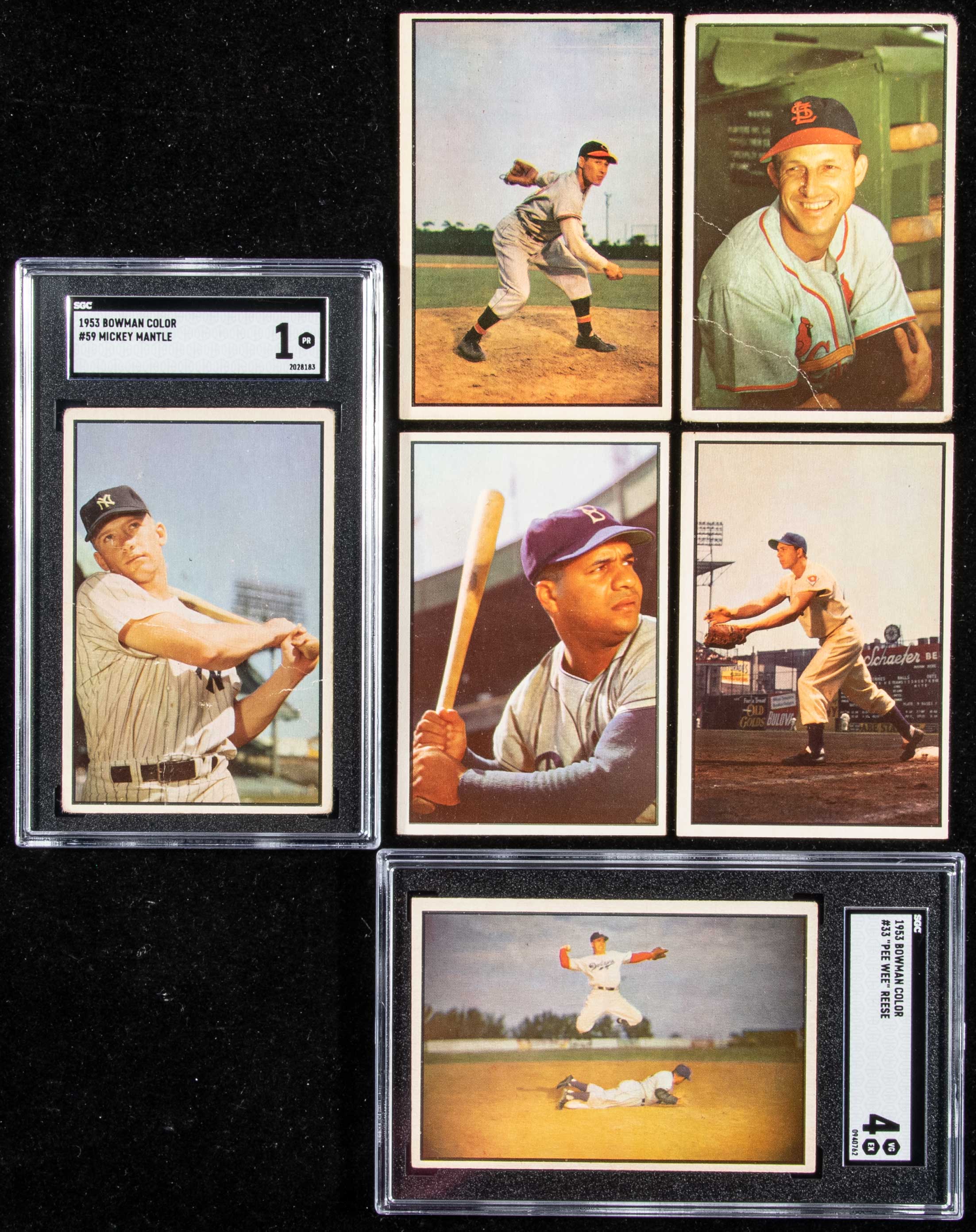 Description:1953 Bowman Color near complete set (159 of 160 cards). Average VG-VG/EX condition with GD-EX general range and there are a small number which grade lesser. Keys: #9 Rizzuto (pencil writing on back), 10 Ashburn (EX/MT), 18 Fox (VG/EX), 32 Musial (FR/GD), 33 Reese (SGC 4 VG EX), 40 Doby (VG/EX), 46 Campanella (VG), 51 Irvin (EX), 59 Mantle (SGC 1 PR), 80 Kiner (VG/EX), 92 Hodges (EX), 93 Rizzuto/Martin (EX), 97 Mathews (VG), 99 Spahn (VG/EX-EX), 114 Feller (EX), 117 Snider (VG), 118 Martin (FR/GD-GD), 121 Berra (VG/EX), 146 Wynn (EX), 153 Ford (GD/VG). Missing #44 Mantle/Berra/Bauer.