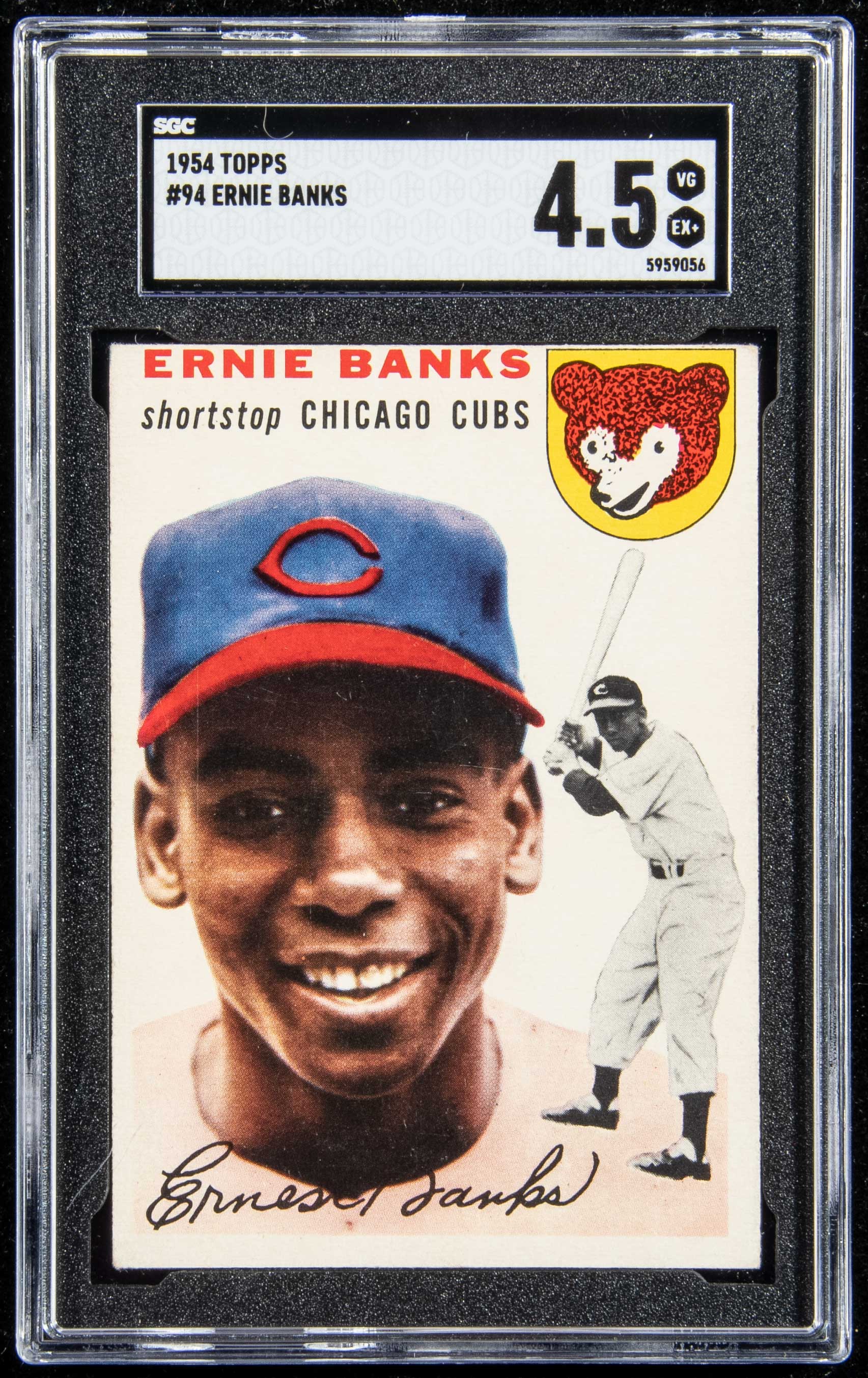 1954 Topps #94 Ernie Banks Rookie (SGC4.5 VG-EX+). Key card from this widely collected series showing Banks in his first year with the Cubs. Typical centering for this card and there is the slightest touch of wear: SGC 4.5 VG EX+
