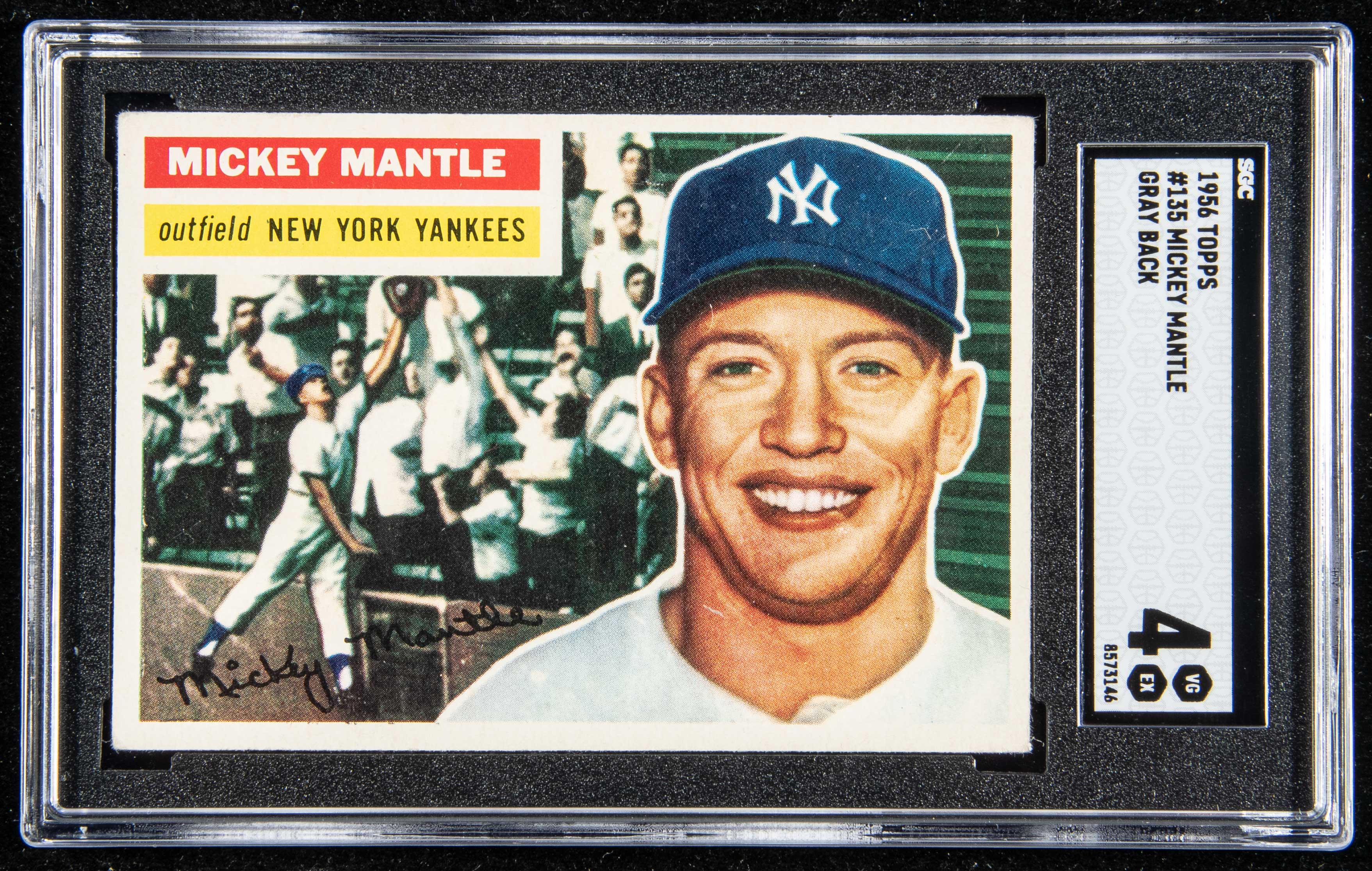 1956 Topps #135 Mickey Mantle (Gray back) (SGC 4 VG). Near perfectly centered with the slightest touch to corners: SGC 4 VG EX
