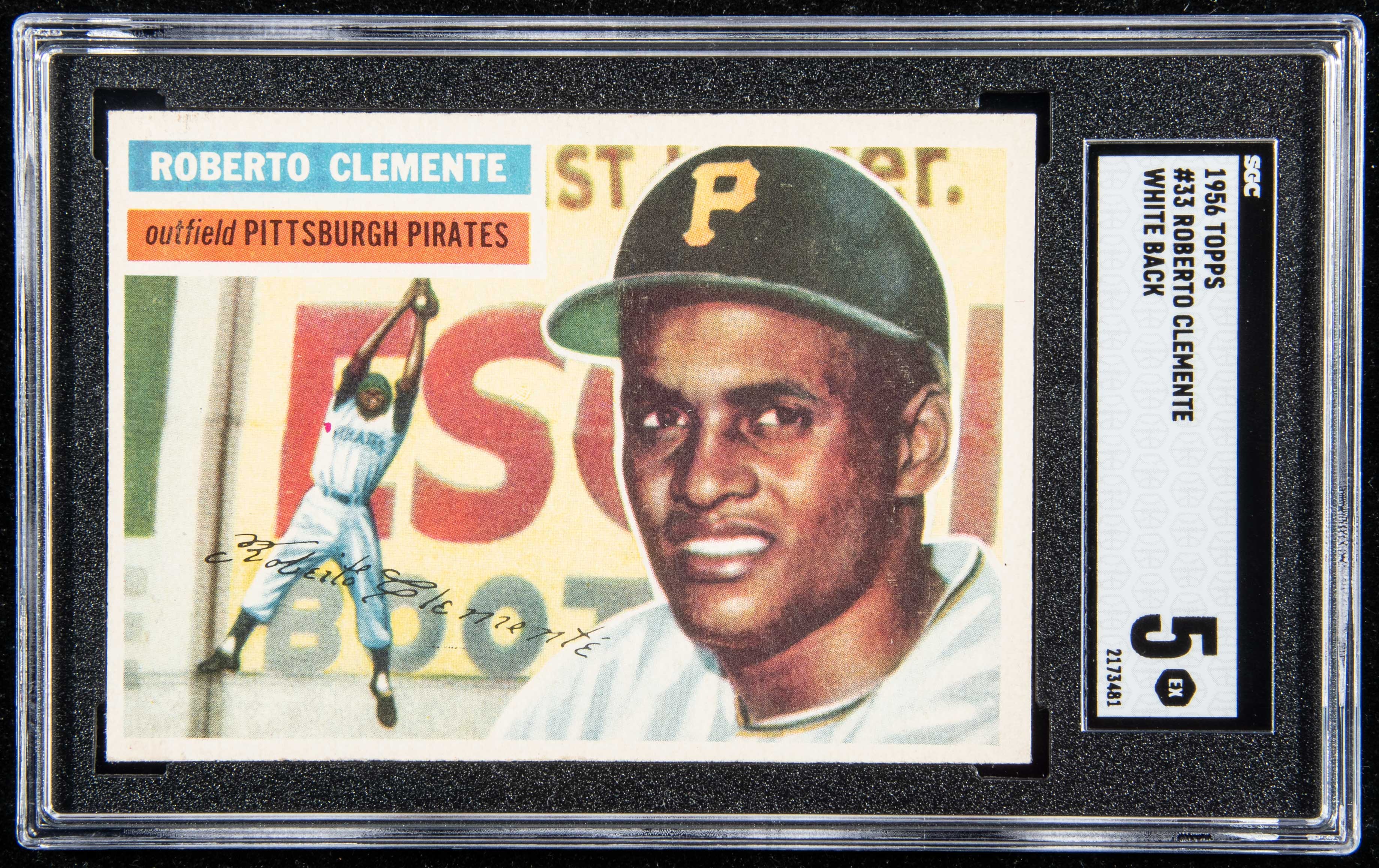 1956 Topps #33 Roberto Clemente (White back) (SGC 5 EX). Clemente's second year card in very strong condition with little mentionable wear: SGC 5 EX