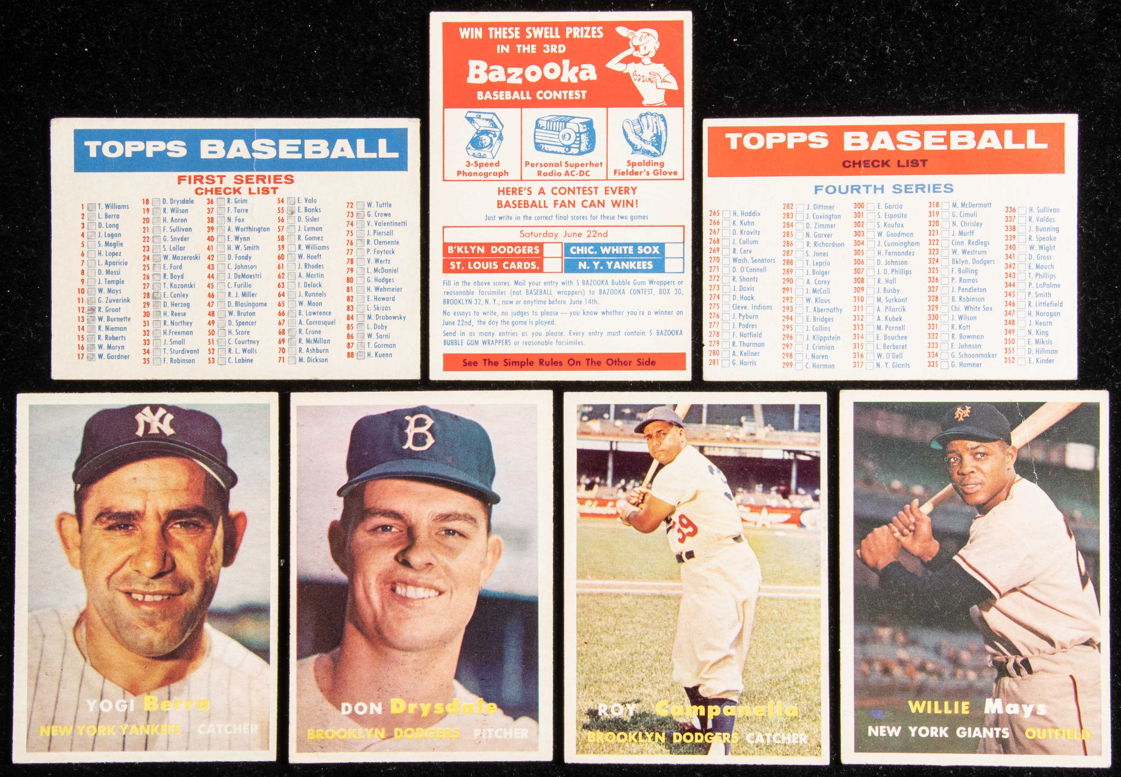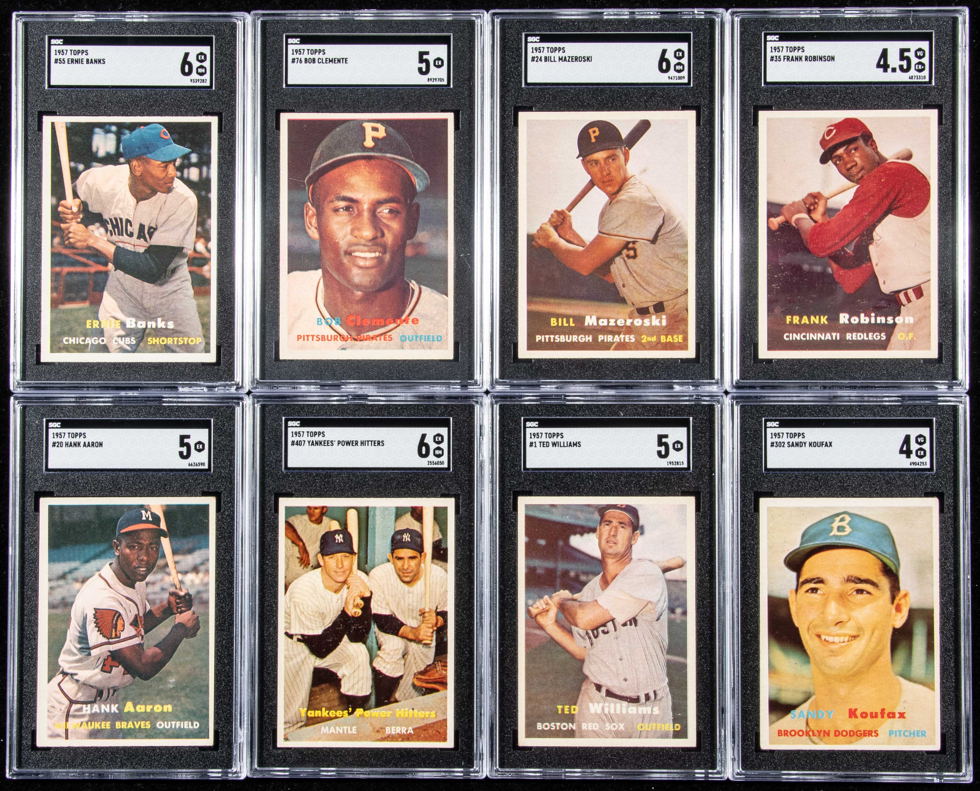 1957 Topps Baseball near complete set (406 of 407 cards) plus contest and (2) checklist cards (409 total). Very nice mid-grade set in average VG/EX-EX overall condition with GD-EX/MT general range. Missing #95 Mantle. Keys: #1 Williams (SGC 5 EX), 2 Berra (EX/MT), 10 Mays (GD), 18 Drysdale (EX-EX/MT OC), 20 Aaron (SGC 5 EX), 24 Mazeroski (SGC 6 EX NM), 25 Ford (EX OC), 30 Reese (EX), 35 Robinson (SGC 4.5 VG EX+), 55 Banks (SGC 6 EX NM), 62 Martin (EX), 70 Ashburn (VG), 76 Clemente (SGC 5 EX), 80 Hodges (EX/MT), 85 Doby (EX/MT), 90 Spahn (EX/MT), 125 Kaline (EX), 170 Snider (VG), 210 Campanella (EX/MT OC), 215 Slaughter (EX/MT), 250 Mathews (VG), 286 Richardson (GD), 302 Koufax (SGC 4 VG EX), 312 Kubek (GD/VG-VG), 328 Robinson (VG), 338 Bunning (EX), 400 Sluggers (EX/MT), and 407 Mantle/Berra (SGC 6 EX/NM). Also includes June 22nd Contest (VG), Checklist 1/2 Bazooka (FR), and Checklist 4/5 Bazooka (FR/GD): Avg. VG/EX-EX