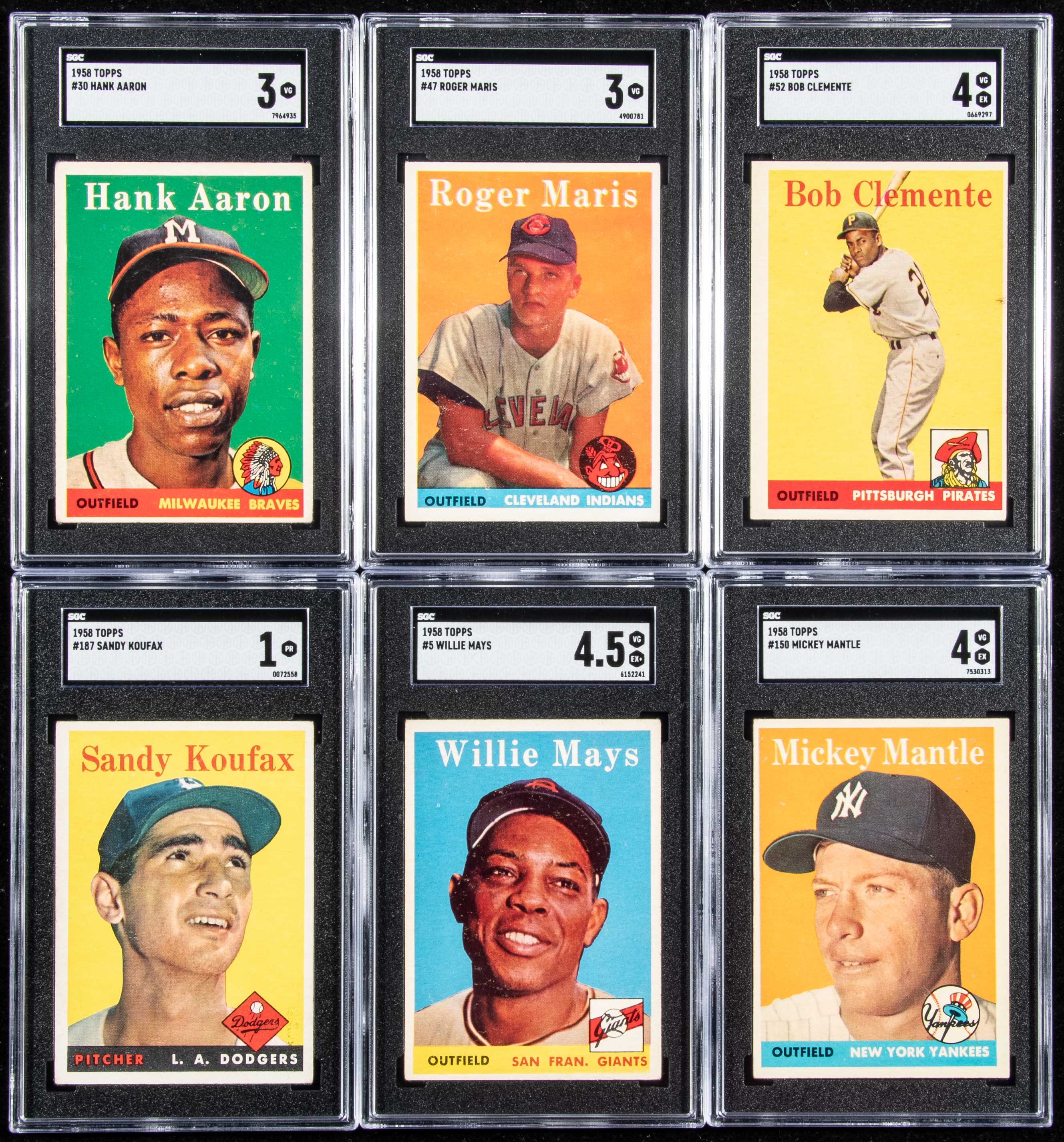 1958 Topps Baseball complete set (494 cards) with SGC graded stars. Average VG-VG/EX condition with GD-EX general range and there are a handful lesser and a few better mixed in. Keys: #1 Williams (GD), 5 Mays (SGC 4.5 VG EX+), 25 Drysdale (VG/EX), 30 Aaron (SGC 3 VG), 47 Maris (SGC 3 VG), 52 Clemente (SGC 4 VG EX), 70 Kaline yellow (EX), 88 Snider (FR), 150 Mantle (SGC 4 VG EX), 187 Koufax (SGC 1 PR with VG/EX eye appeal, we are not aware of the issue which lowered grade to a 1), 285 Robinson (GD/VG), 288 Killebrew (VG/EX), 307 Robinson (EX, light wax on front), 310 Banks (VG/EX-EX), 320 Ford (EX/MT OC), 343 Cepeda (EX), 370 Berra (VG), 375 Reese (EX/MT OC), 418 Mantle/Aaron (VG), 436 Mays/Snider (GD), 440 Mathews (VG/EX), 476 Musial (EX-EX/MT), 485 Williams (VG), 486 Mays (EX), 487 Mantle (EX-EX/MT OC), and 488 Aaron (VG/EX): Avg. VG-VG/EX