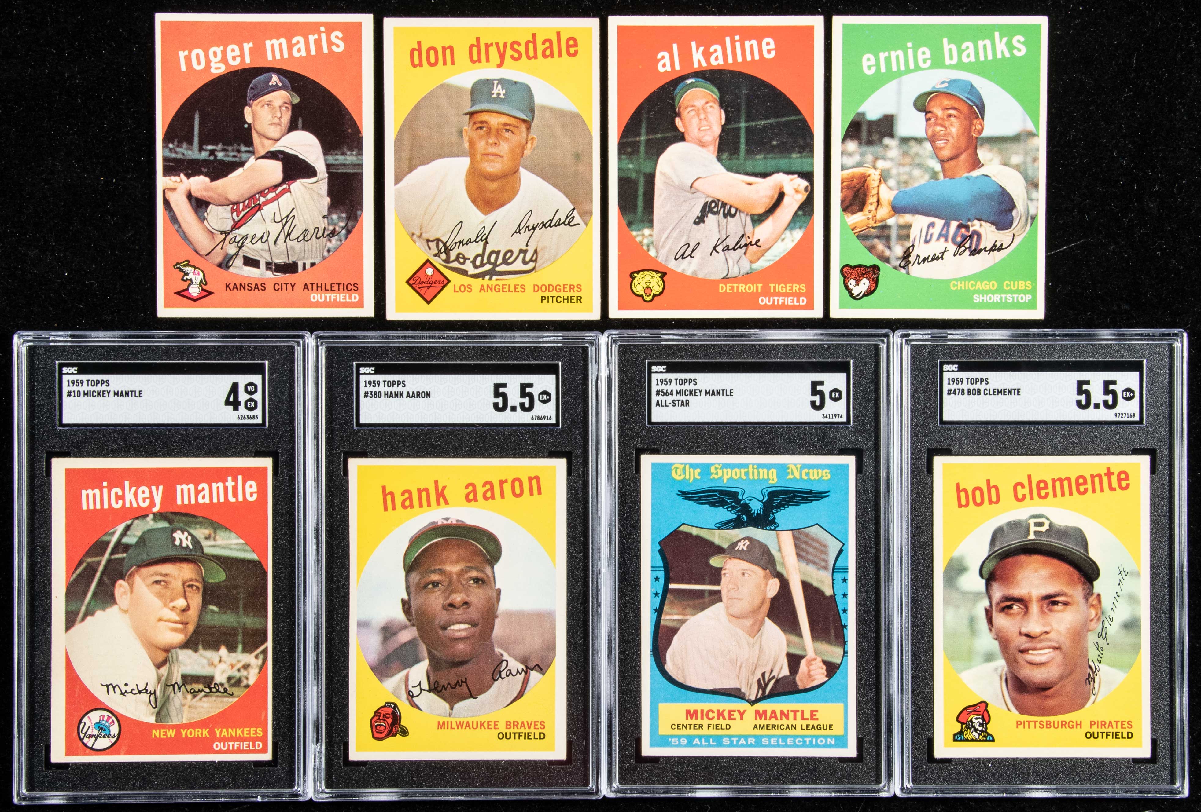 1959 Topps Baseball near complete set (571 of 572 cards). Nice set runs the full range of GD to EX/MT with a decent number of cards falling at all levels. Keys: #10 Mantle (SGC 4 VG EX), 20 Snider (VG), 30 Fox (VG/EX), 50 Mays (GD), 150 Musial (EX), 163 Koufax (miscut), 180 Berra (EX), 202 Maris (EX/MT), 212 Fence Busters (VG), 300 Ashburn (NM), 317 Ashburn/Mays (GD), 350 Banks (EX), 360 Kaline (EX-EX/MT), 380 Aaron (SGC 5.5 EX+), 387 Drysdale (EX/MT), 430 Ford (EX), 435 Robinson (VG/EX-EX), 450 Mathews (EX, print line), 461 Mantle HR (VG/EX, wax on front), 464 Mays Catch (EX), 478 Clemente (SGC 5.5 EX+), 515 Killebrew (EX), 550 Campanella (EX), 561 Aaron (EX), 563 Mays (VG/EX-EX), and 564 Mantle (SGC 5 EX). Missing #514 Gibson: GD-EX/MT