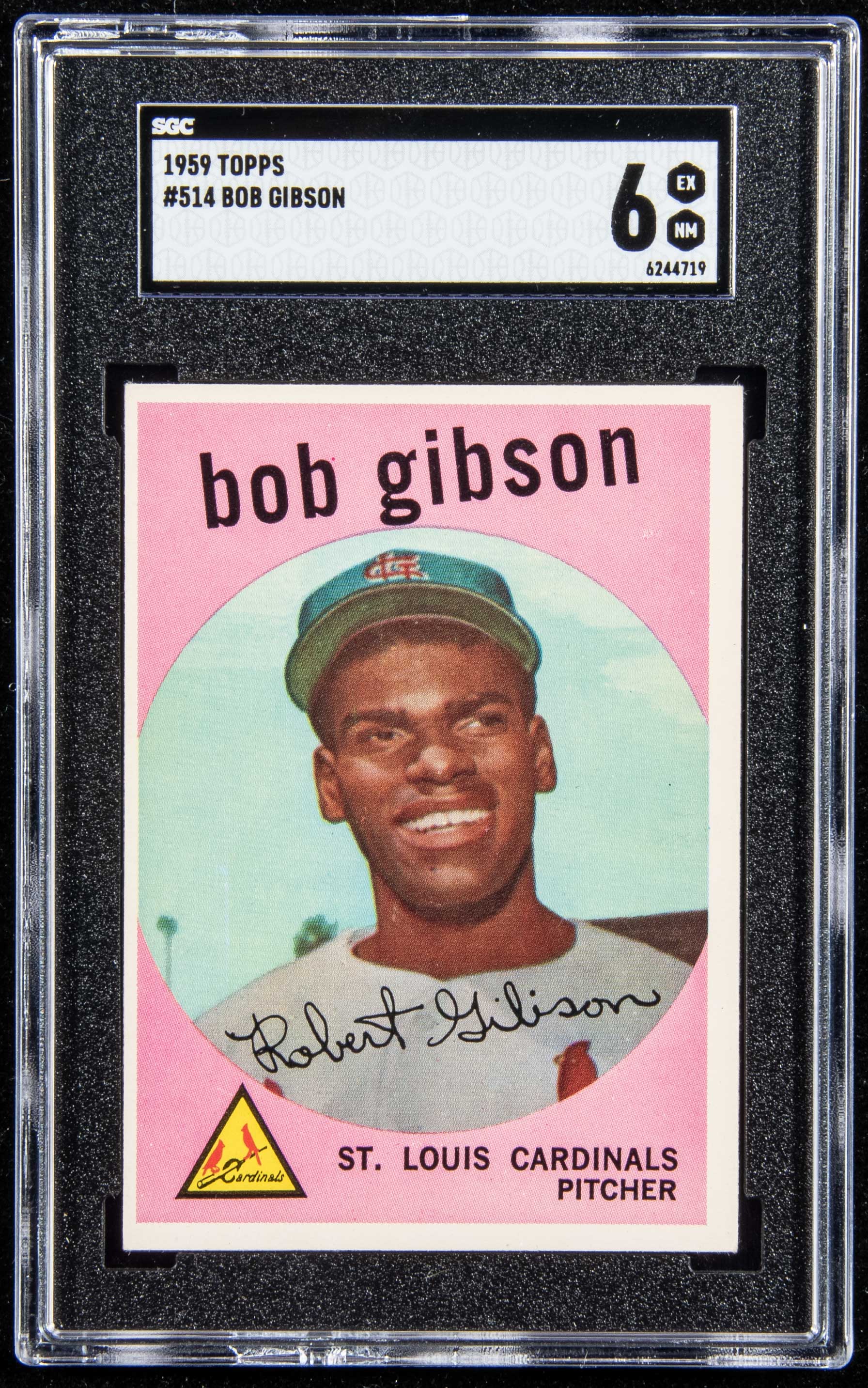 1959 Topps #514 Bob Gibson Rookie (SGC 6 EX-NM). Key Rookie card is in outstanding condition with centering that accounts for technical downgrade of an otherwise superior example" SGC 6 EX NM