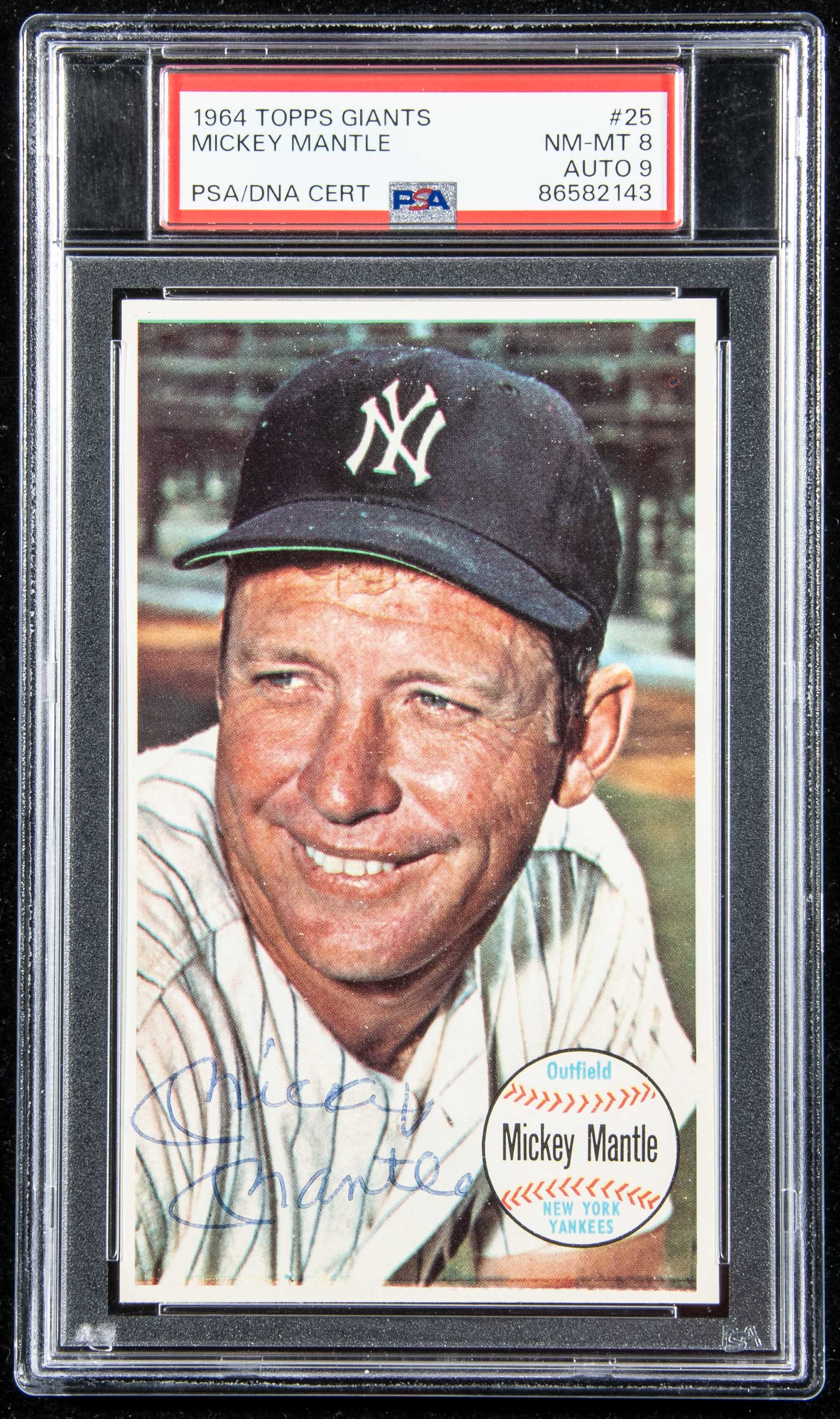 Description:1964 Topps Giants #25 Mickey Mantle autographed card (Highest graded with PSA/DNA Mint 9 autograph). Very sharp card has been graded NM-MT 8 by PSA. Signed "Mickey Mantle" on the front ink with the autograph graded a "9." There are no signed examples graded higher on the PSA population report: PSA NM-MT 8 with "9" autograph
