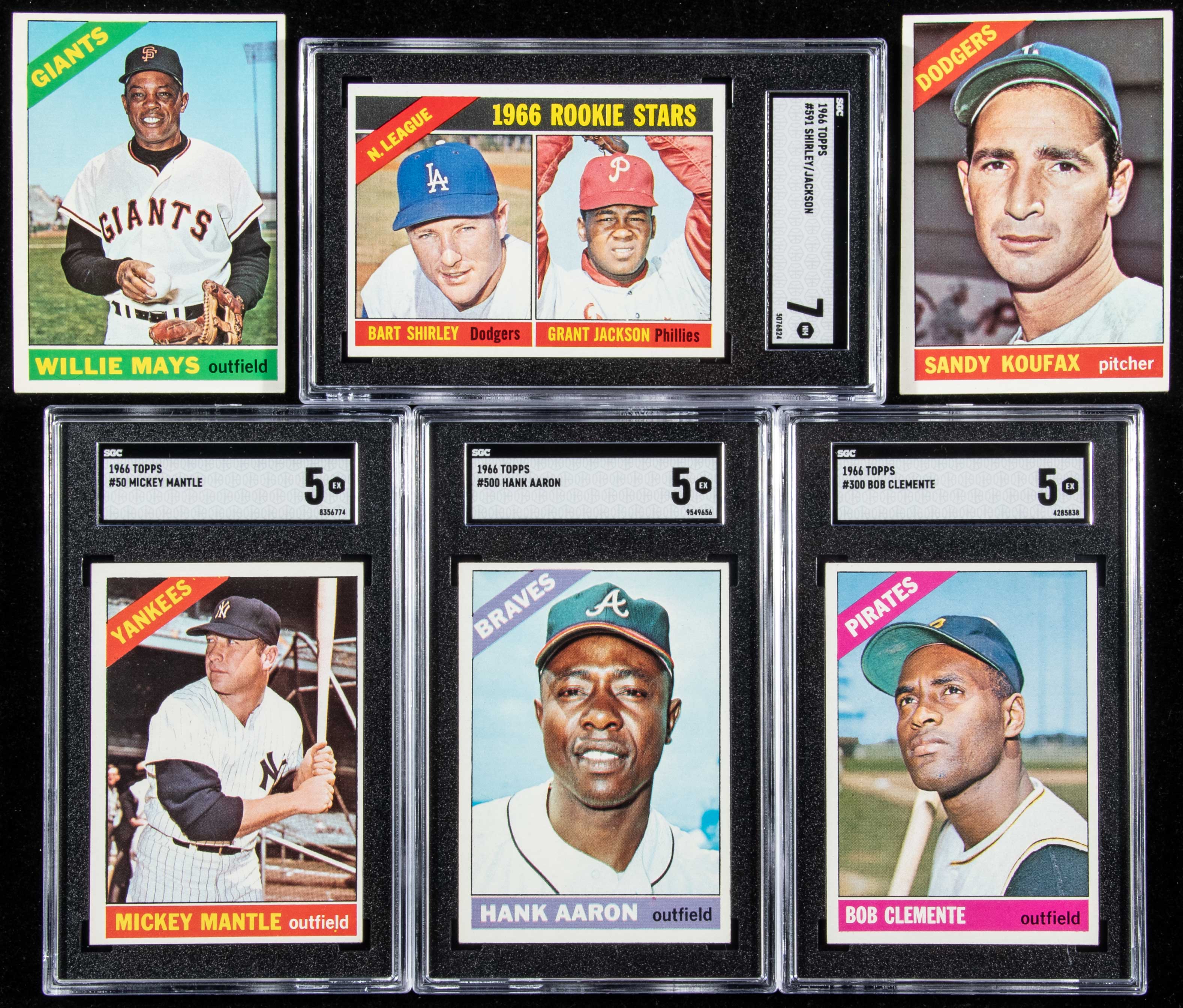 Description:Very nice 1966 Topps Baseball complete set (598 cards) plus (9) variations (607 total). Strong mid-grade set with most cards around EX and there are many better throughout. A small portion grade VG and there are some lesser. Keys: #1 Mays (VG/EX), 30 Rose (EX/MT-NM minor print defect), 50 Mantle (SGC 5 EX), 70 Yastrzemski (EX/MT), 100 Koufax (EX slightly diamond cut), 110 Banks (VG), 126 Palmer (EX), 254 Jenkins (EX), 288 Sutton (VG/EX-EX), 300 Clemente (SGC 5 EX), 310 Robinson (EX/MT-NM), 320 Gibson (EX), 365 Maris (EX-EX/MT), 390 Robinson (EX/MT OC), 410 Kaline (VG-VG/EX), 500 Aaron (SGC 5 EX), 540 McLain (EX-EX/MT), 547 Clarke (EX-EX/MT), 550 McCovey (GD/VG-VG), 580 Williams (NM OC), 583 Tigers (EX/MT-NM OC), 591 Jackson (SGC7 NM), and 598 Perry (EX/MT). Includes variations of cards #62, 91, 101, 103, 104, 183, 279, 444, and 517: Avg. EX