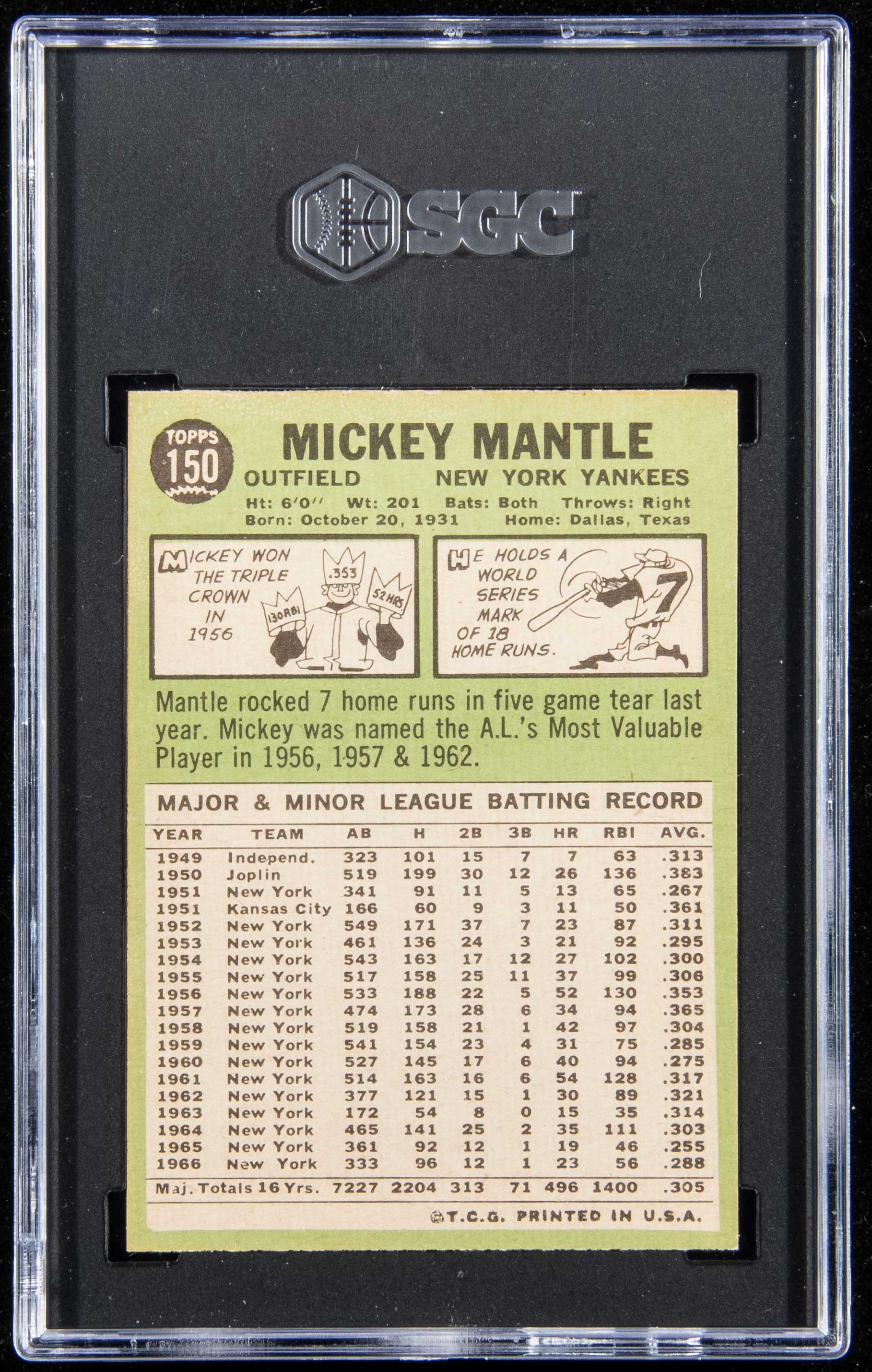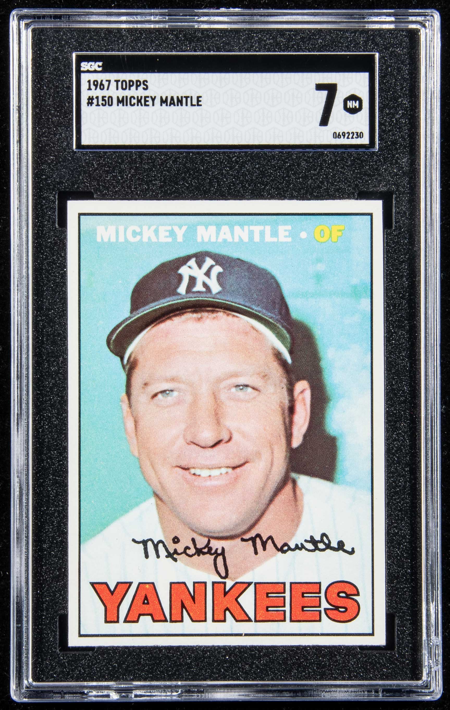1967 Topps #150 Mickey Mantle (SGC 7 NM). High grade card is well centered with virtually no mentionable wear: SGC 7 NM