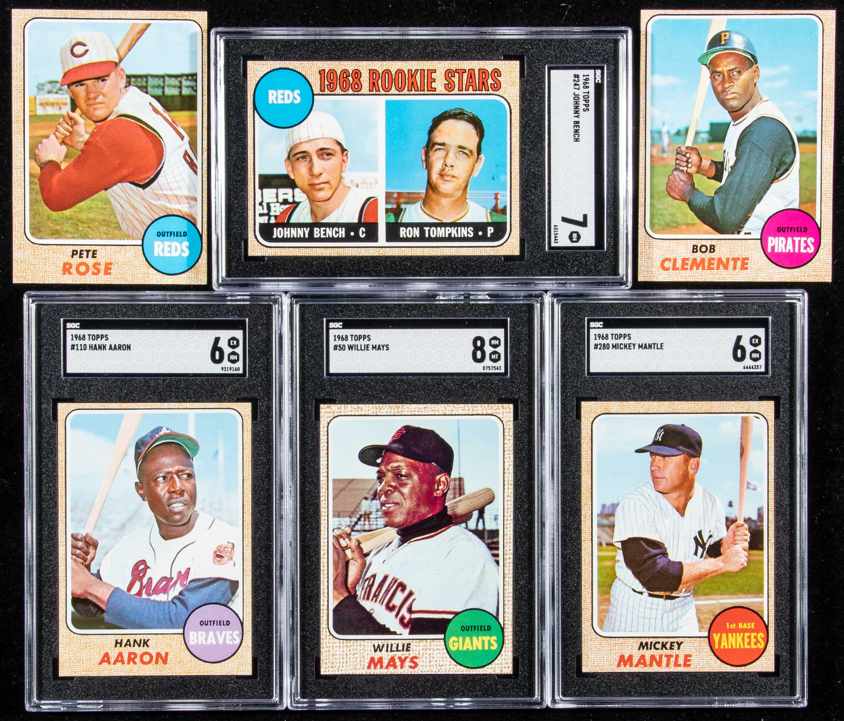 Very sharp 1968 Topps Baseball near complete set (597 of 598 cards). Solid start to a high grade set with average card EX/MT and there are many better. Centering can be an issue. Keys: #45 Seaver (EX/MT), 50 Mays (SGC 8 NM MT), 80 Carew (EX/MT-NM), 110 Aaron (SGC 6 EX NM), 150 Clemente (EX/MT-NM OC), 230 Rose (NM OC), 240 Kaline (NM OC), 247 Bench (SGC 7 NM), 280 Mantle (SGC 6 EX NM), 330 Maris (NM slightly OC), 355 Banks (VG), 370 Aaron (NM OC), 374 Clemente (NM stray print line), 480 Managers Dream (NM/MT OC), 490 Superstars (EX-EX/MT), 500 Robinson (NM OC), and 575 Palmer (NM/MT OC). Missing #177 Ryan: Avg. EX/MT
