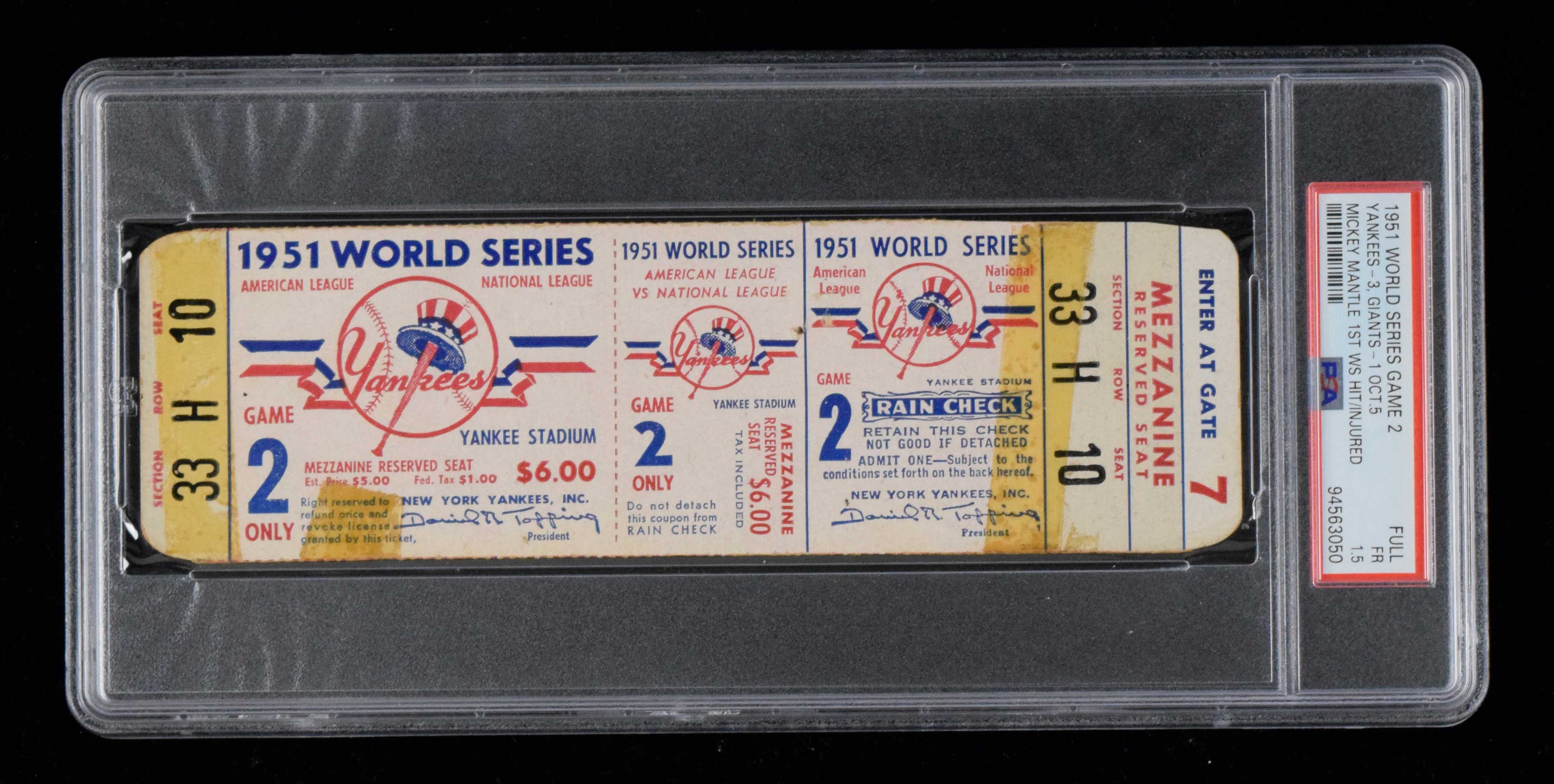 Description:1951 World Series Game 2 full ticket graded PSA 1.5 FR - Mantle 1st World Series hit & key injury (highest graded). Yankee Stadium full ticket for Game 2 in which the New York Yankees defeated the New York Giants by a score of 3-1. Mickey Mantle led off with a bunt single for his 1st hit in World Series play, but later severely injured his right knee while chasing down a fly ball and catching his spikes on a drain cover. PSA population report shows that no full tickets have been graded higher: PSA 1.5 FR