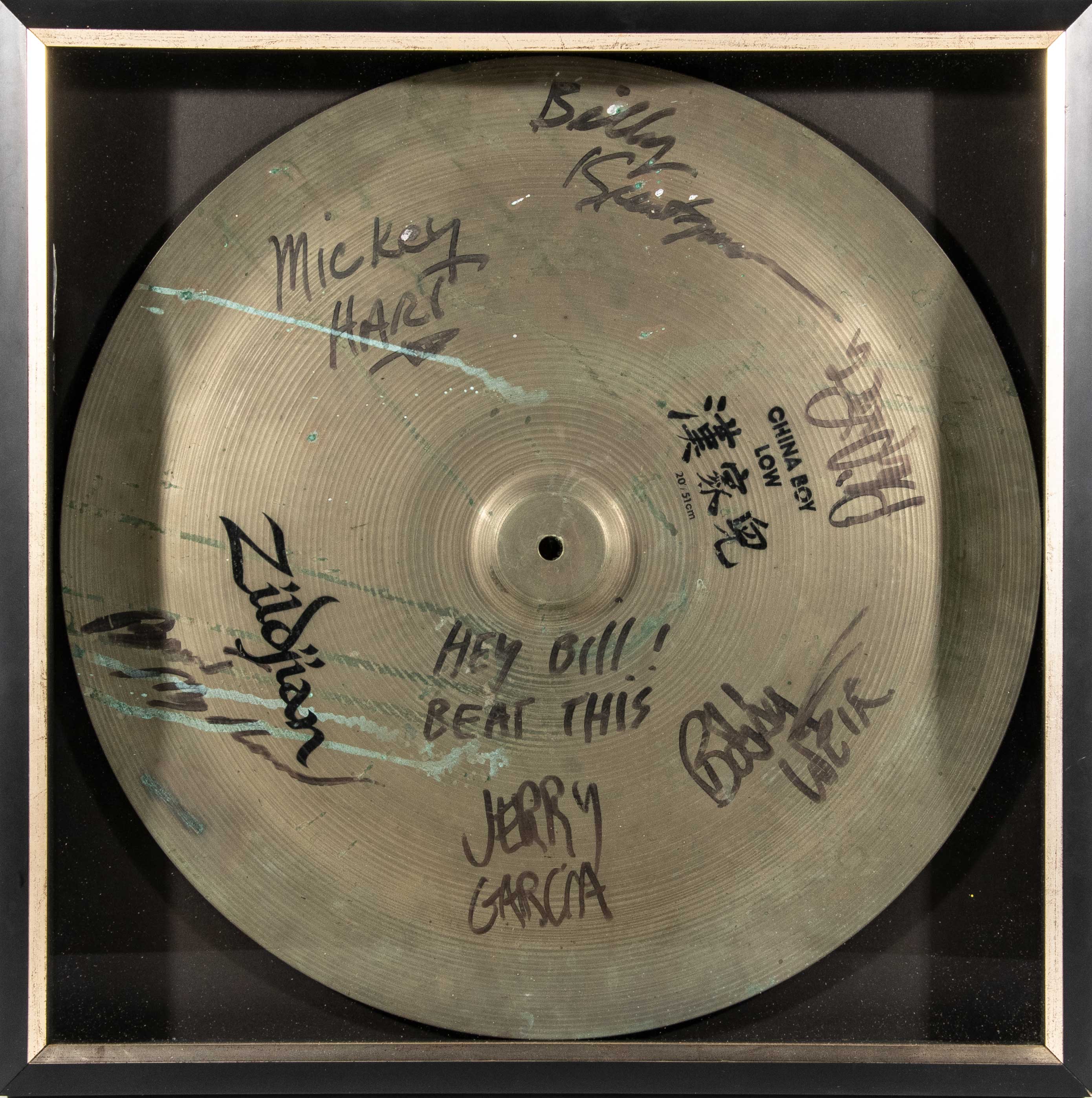 Description:Grateful Dead autographed stage used Zildjian cymbal inscribed to Bill Walton. Zildjian "China Boy Low" (20") cymbal has been signed by Jerry Garcia (inscribed "Hey Bill! Beat This"), Mickey Hart, Bill Kreutzmann, Phil Lesh, Bob Weir, and Brent Mydland. Marker signatures rate 7-7/8 out of 10. Housed in a tasteful 22"x22" shadowbox as displayed in the Walton home and there is some visible use and age related wear (including several streaks of oxidation). The frame has been opened to inspect that back and we can relay that there is a handwritten 'Walton" marker notation and it is mounted with adhesive that could likely be removed if so desired. Walton's ties to the noted band are legendary and after attending his first show in 1971 he became a prominent fixture on their circuit and would go to hundreds in all (upwards of 850 by his own account). His close personal friendships with Jerry Garcia and Company are well known. Substantive pieces of this nature should be considered extremely rare and there are relatively few known in comparison to more commonly seen (albeit still scarce) band signed photographs, programs, and other flat items. One of the premier music related pieces within the Walton Collection and one which presented to him by the band themselves. Includes full LOA from JSA and letter of provenance from the Walton Family: Overall EX