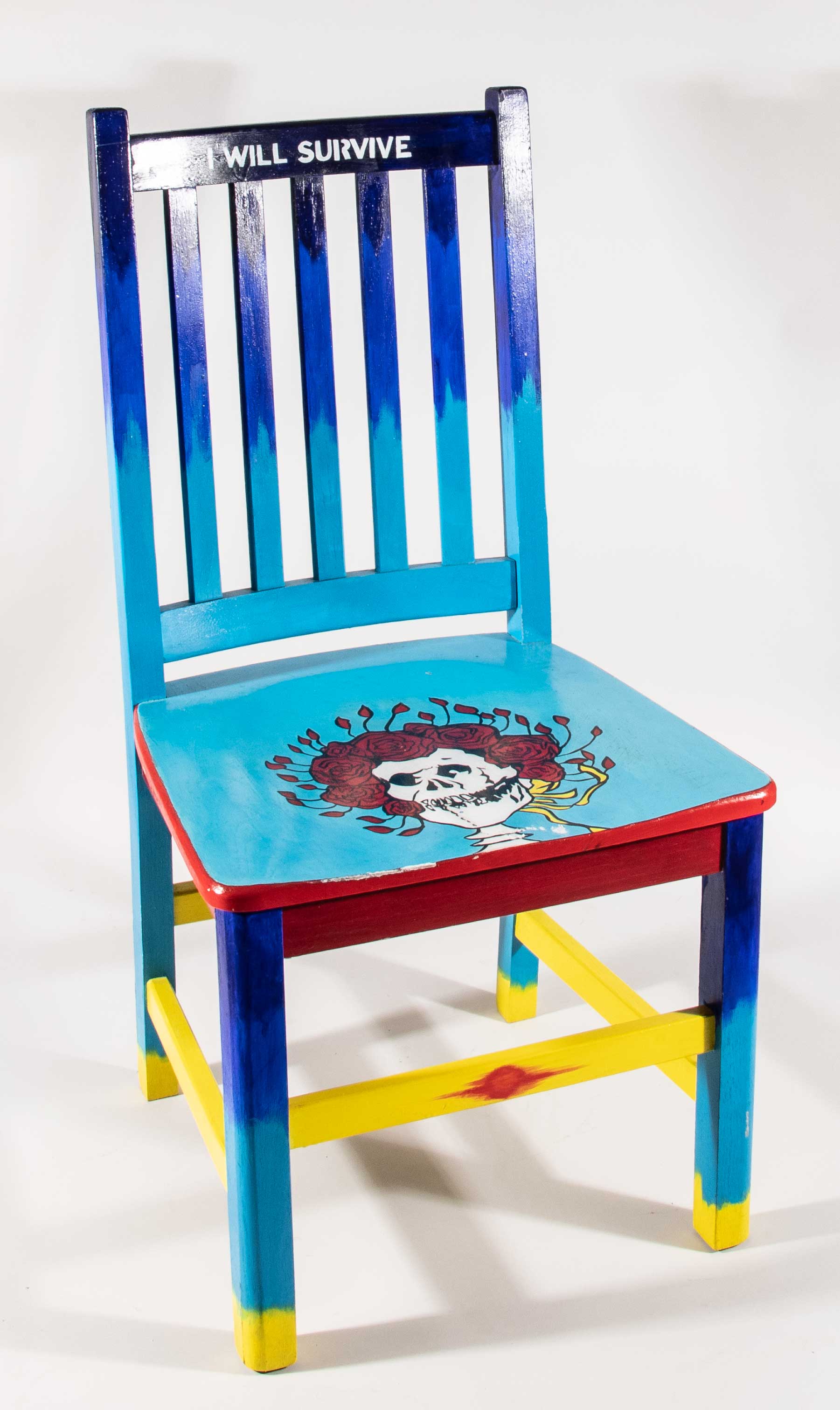 Description:Bill Walton's Grateful Dead decorated hand painted chair. Wooden chair is creatively painted in several different colors with "I Will Survive" lettered around the upper slat. On the seat is a skull and roses design which has become synonymous with the Grateful Dead. Signed on the underside, we presume by the artist "Brandt", and there is some light general wear. Includes certificate of provenance from the Walton Family: EX