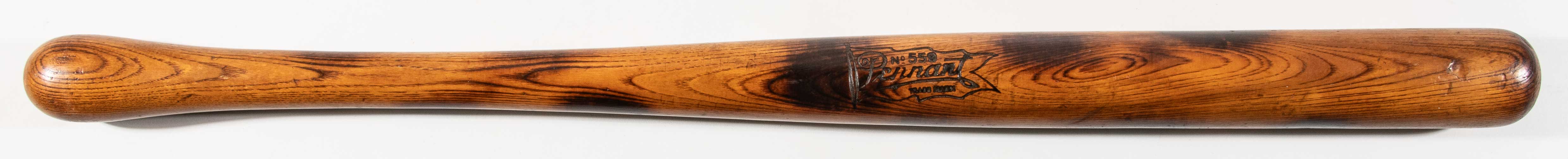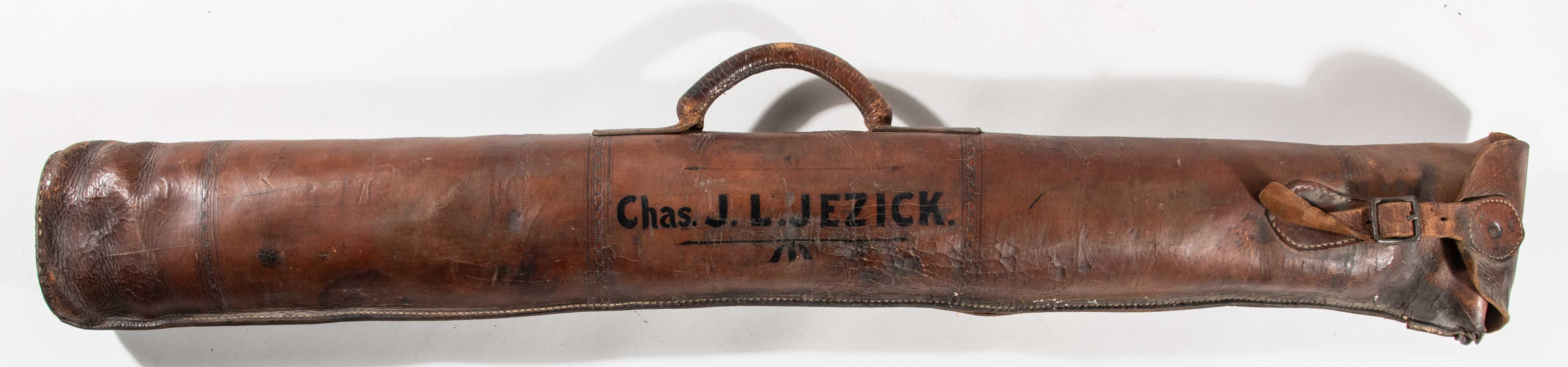 Description:Pennant brand baseball bat with period leather carrying casec.1910-15. Hand turned 35" wooden knob has a bold and well pronounced "Pennant" mark at the center with model number "No.559." Beautiful original surfaces are decorated with a series of darker areas and it shows some light general use. Includes a period leather carrying case which has former owner name lettered on the side. Use and some minor general age related wear. Very nice pairing for display: Bat EX/MT, Case VG-EX