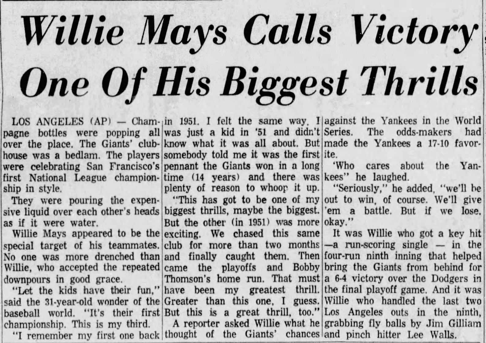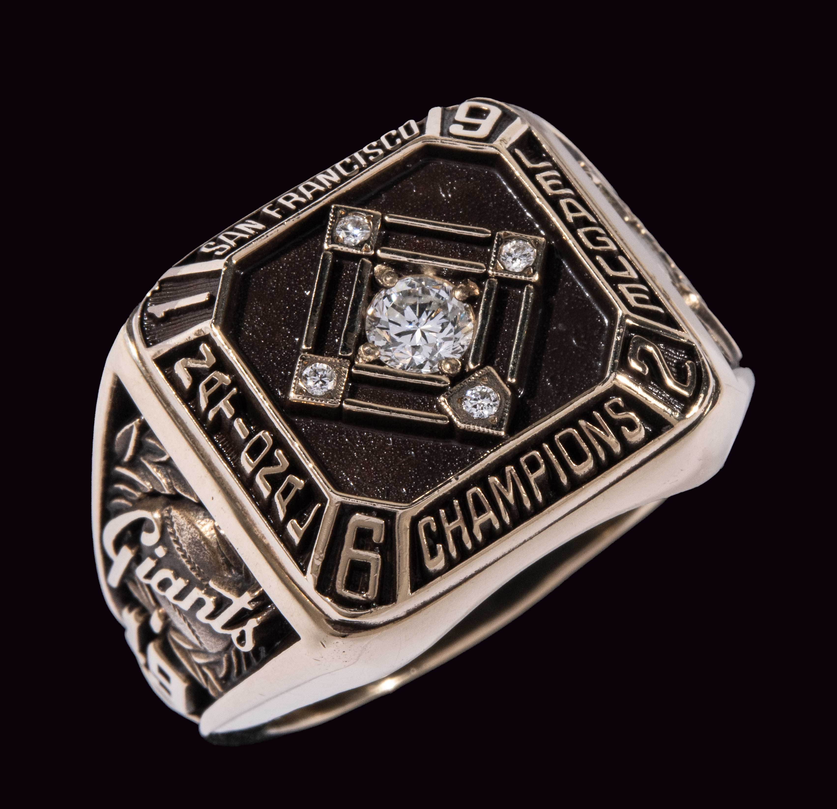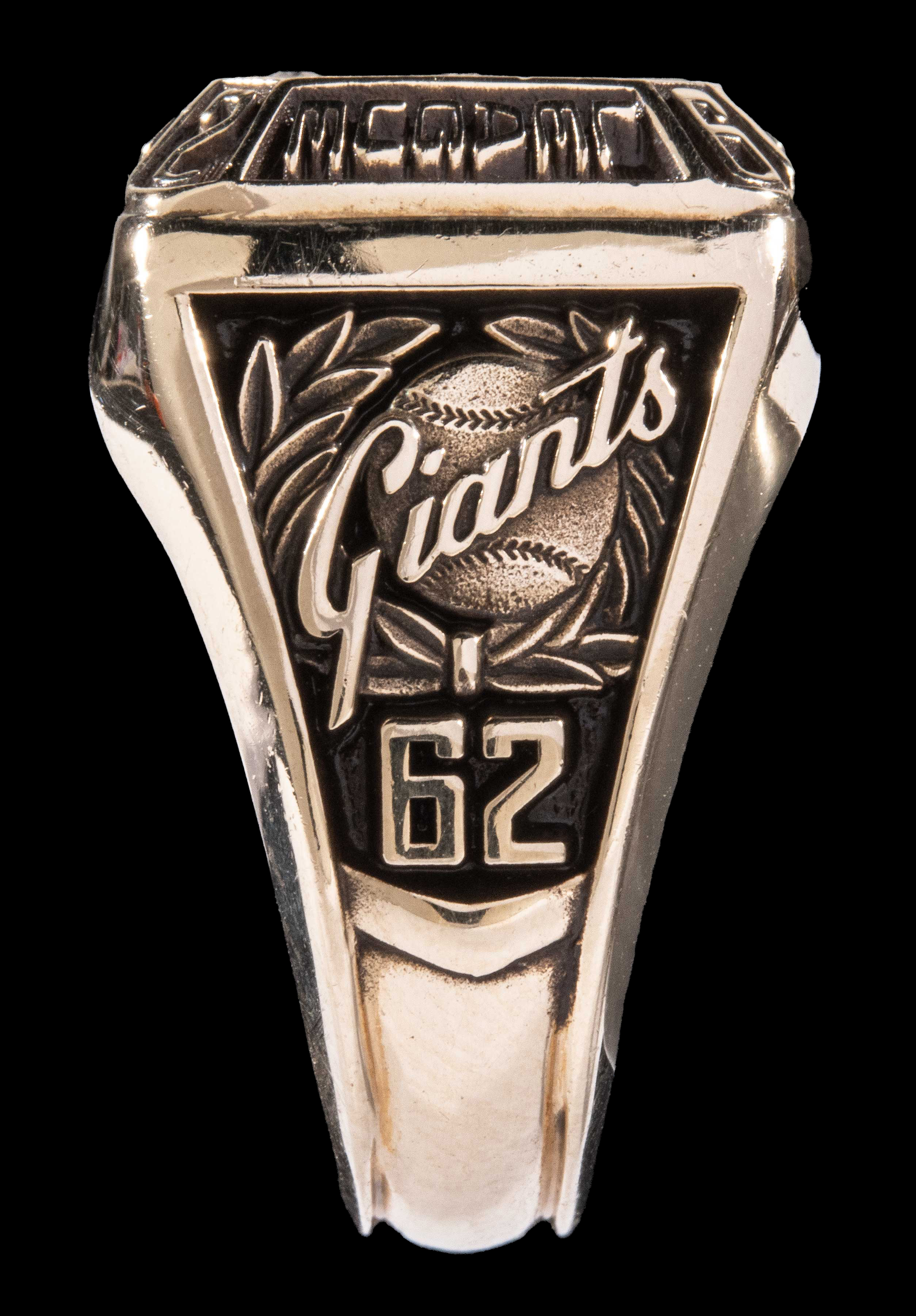 Description:1962 Willie Mays San Francisco Giants National League Championship ring. Scarce ring type is only the second of any type related to the 1962 Giants we have ever offered and it is one of only a handful to have entered the market. The face has a baseball field design with a .20 carat diamond solitaire where the pitcher would stand and smaller stones at each base position. “1962 San Francisco National League Champions” is lettered around the beveled edge. The Giants logo appears on either side with one reading “19” and the other “62.” The interior band is marked “LGB 10K.” Size is 11.5 with a weight of 0.9 ounces (28g) showing very light general wear. This particular ring was made for Mays at a later date than the 1962 season. We have only encountered one period 1962 Giants ring (Ed Bailey) as most Giants players were given gold money clips for their NL Championship. The 1962 Giants ended the season in a head-to-head tie with their cross-bay rival Los Angeles Dodgers. A tense three game playoff series ensued and the Giants claimed (2) of (3) to snag the National League title. Includes certificate of provenance from the Willie Mays Collection: NM