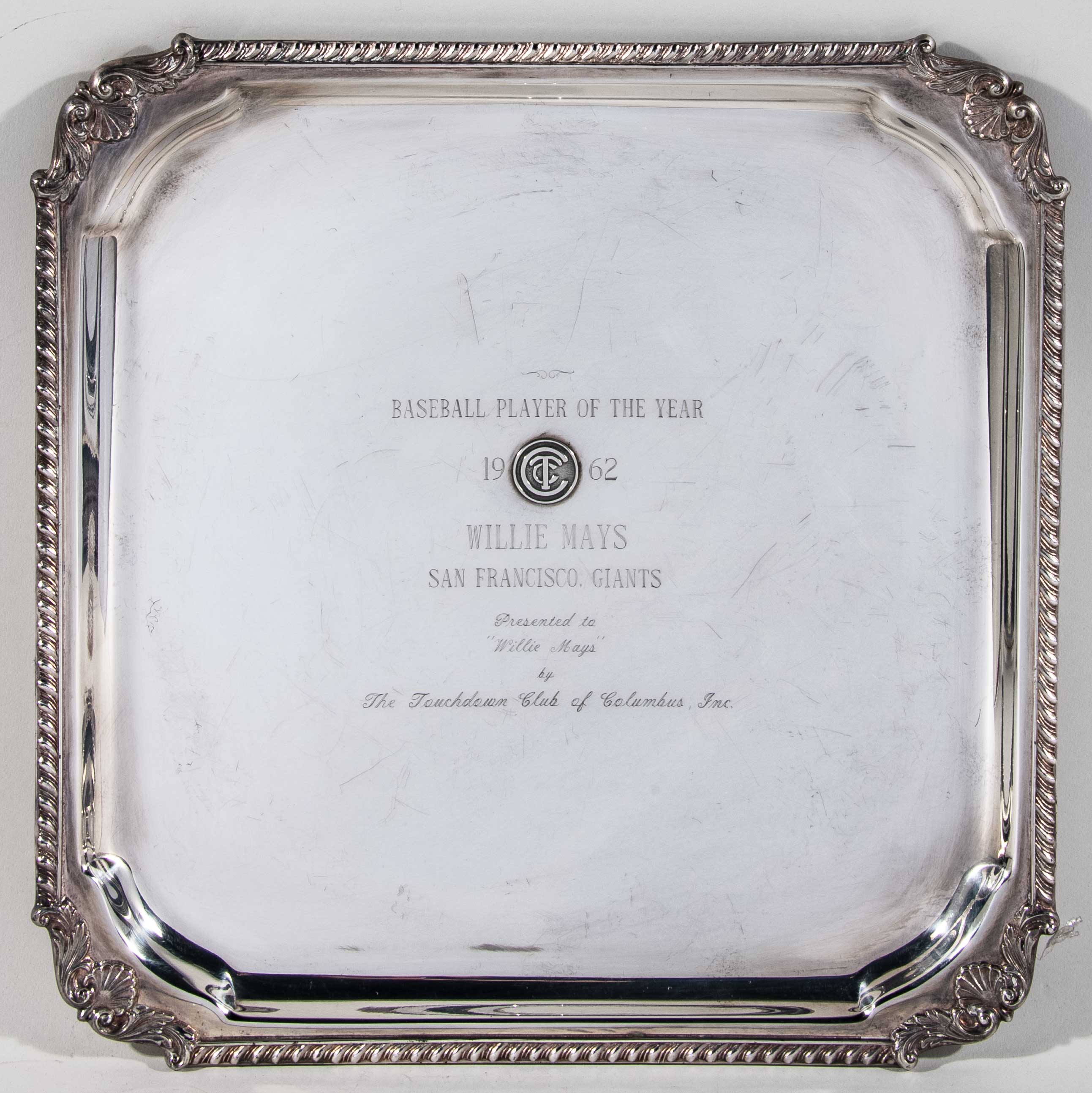 Description:1962 Willie Mays Baseball Player of the Year Award. Excellent quality silver plate presentational tray as awarded to Willie Mays by the Touchdown Club in honor of Mays being named Baseball Player of the Year for 1962. Inscribed to Mays at center of the tray along with embossed Touchdown Club insignia. 14" square marked with F.B. Rogers Silversmith hallmarks on reverse. Typical light to moderate surface scratching on the surface. Includes certificate of provenance from Willie Mays Collection: EX