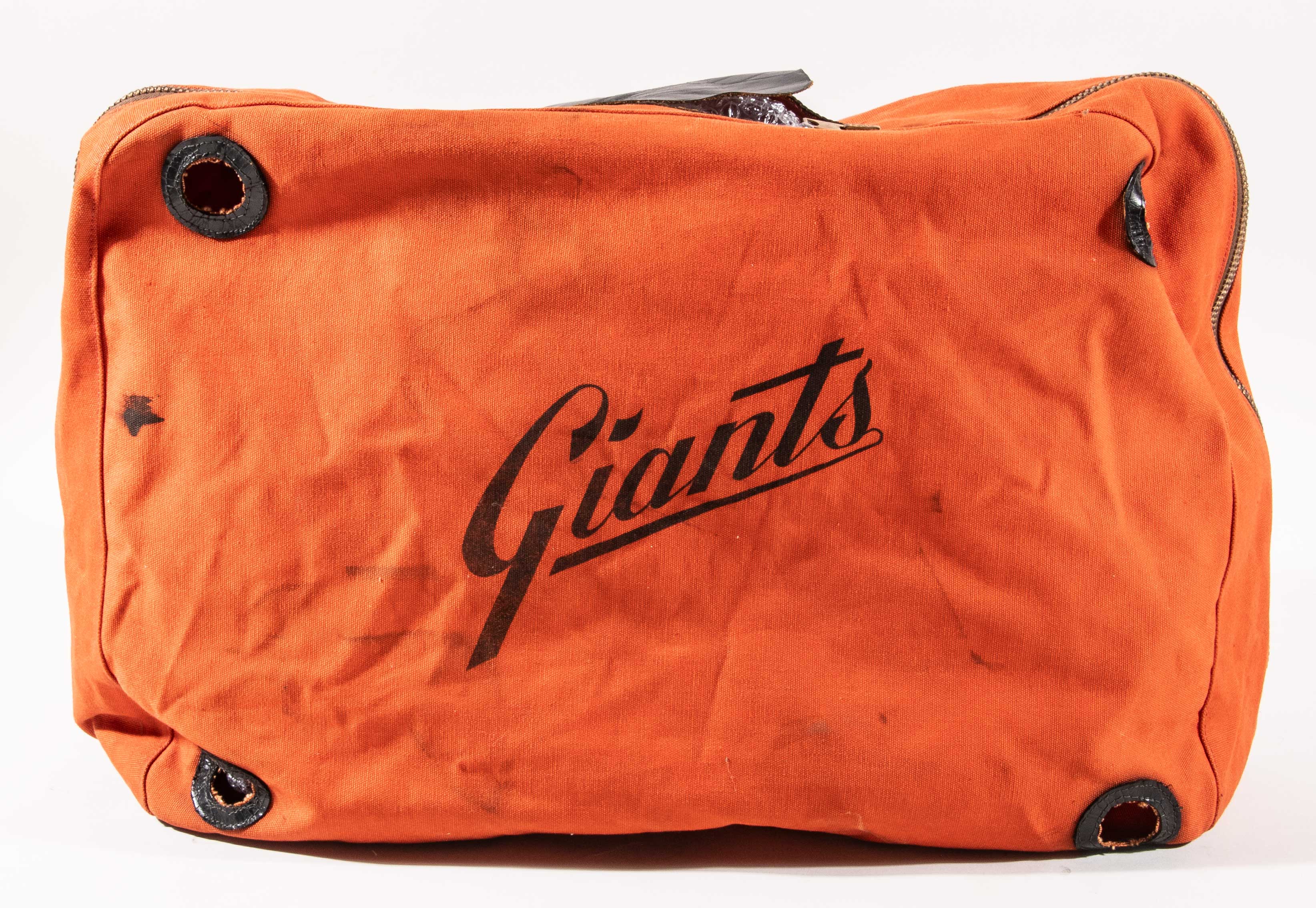 Description:Rare Willie Mays San Francisco Giants Equipment Bag c.1960s. Highly desirable playing career era orange canvas equipment bag having "Giants" team name in black on one side panel and "Willie Mays" in black on the other side panel. Black leather appointments remain intact with four open areas at bottom corners which appear to have been for roller wheels of some type. Heavy evident use with some areas of soiling while generally presenting in fine original condition. Includes LOA from Hunt Auctions and certificate of provenance from the Willie Mays Collection: VG