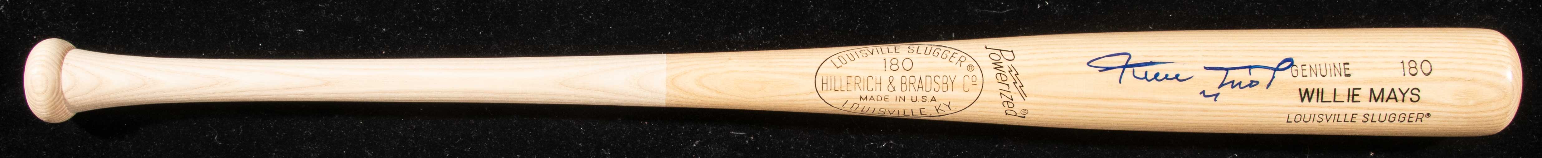 Description:Willie Mays autographed baseball bat. Louisville Slugger Willie Mays model bat signed in blue sharpie across the barrel rating 8 out of 10 with small underline under the last name. Tri-Star authentication hologram affixed to knob end and includes certificate of provenance from the Willie Mays Collection: NM-NM/MT