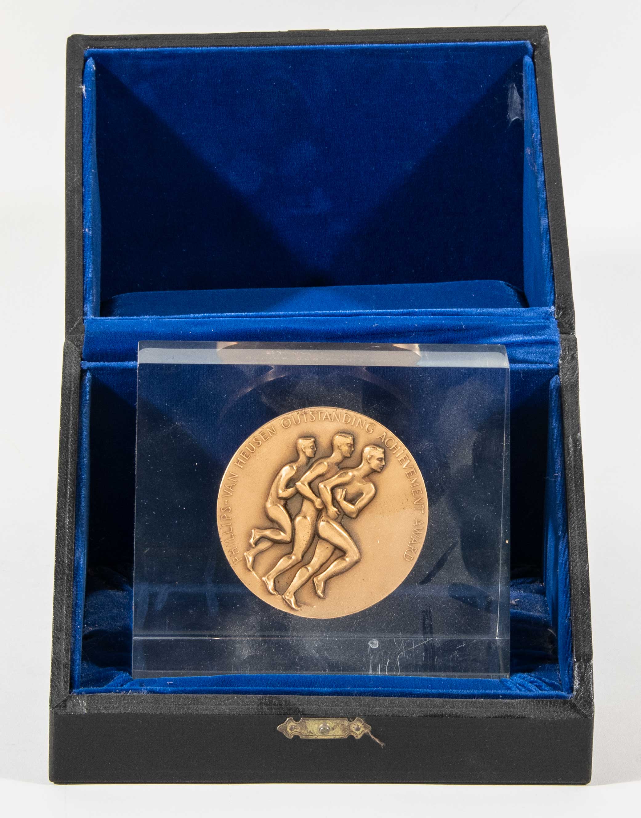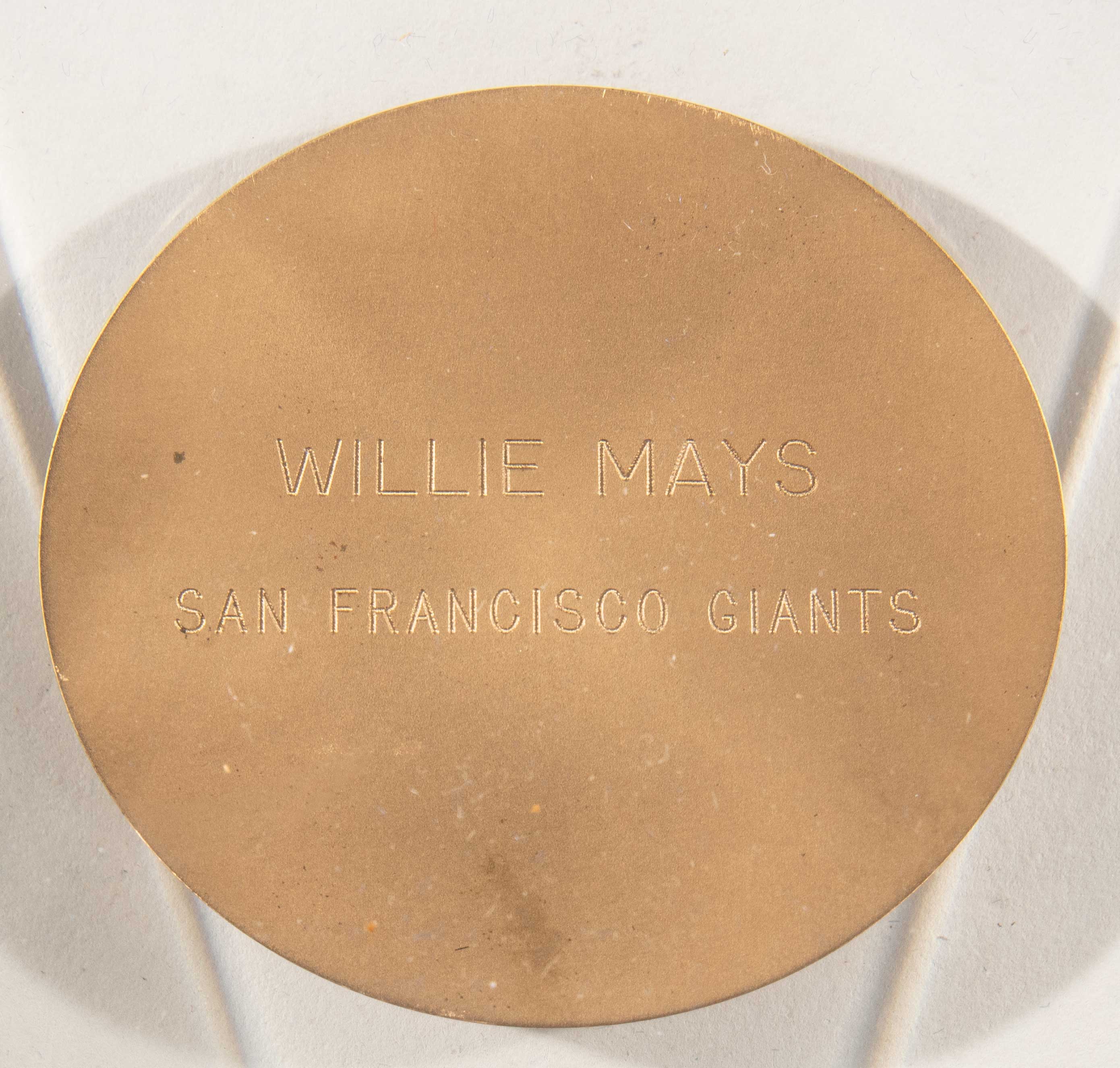 Description:Willie Mays Outstanding Athlete Award c.1960s. Bronze medal encased within an acrylic display as given to Mays by the Philips-Van Heusen organization. Medal features raised décor and titling on front with "Willie Mays San Francisco Giants" lettering on the back. Medal is 3" in diameter encased within 5 1/2" acrylic display and retains is original blue velvet lined hinged lid case. Scattered surface scratching to the acrylic display. Includes certificate of provenance from Willie Mays Collection: EX