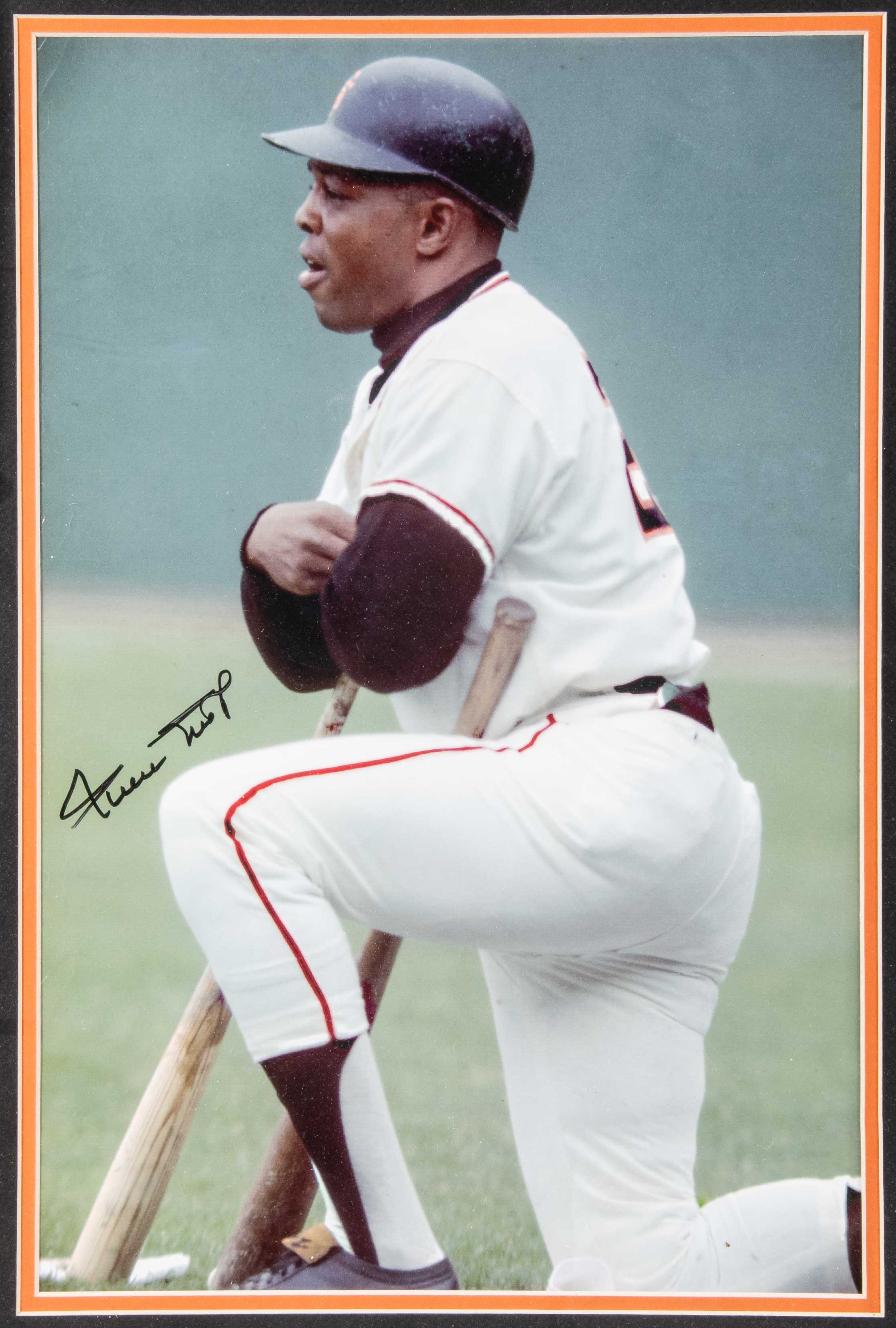 Description:Willie Mays autographed large format photograph. Matted and framed 12"x18" color photograph of Mays kneeling with bat in Giants home uniform signed in black sharpie across the front. Signature is very bold rating 9 out of 10. Includes auction LOA from JSA (autograph) and certificate of provenance from the Willie Mays Collection: Range NM-MT