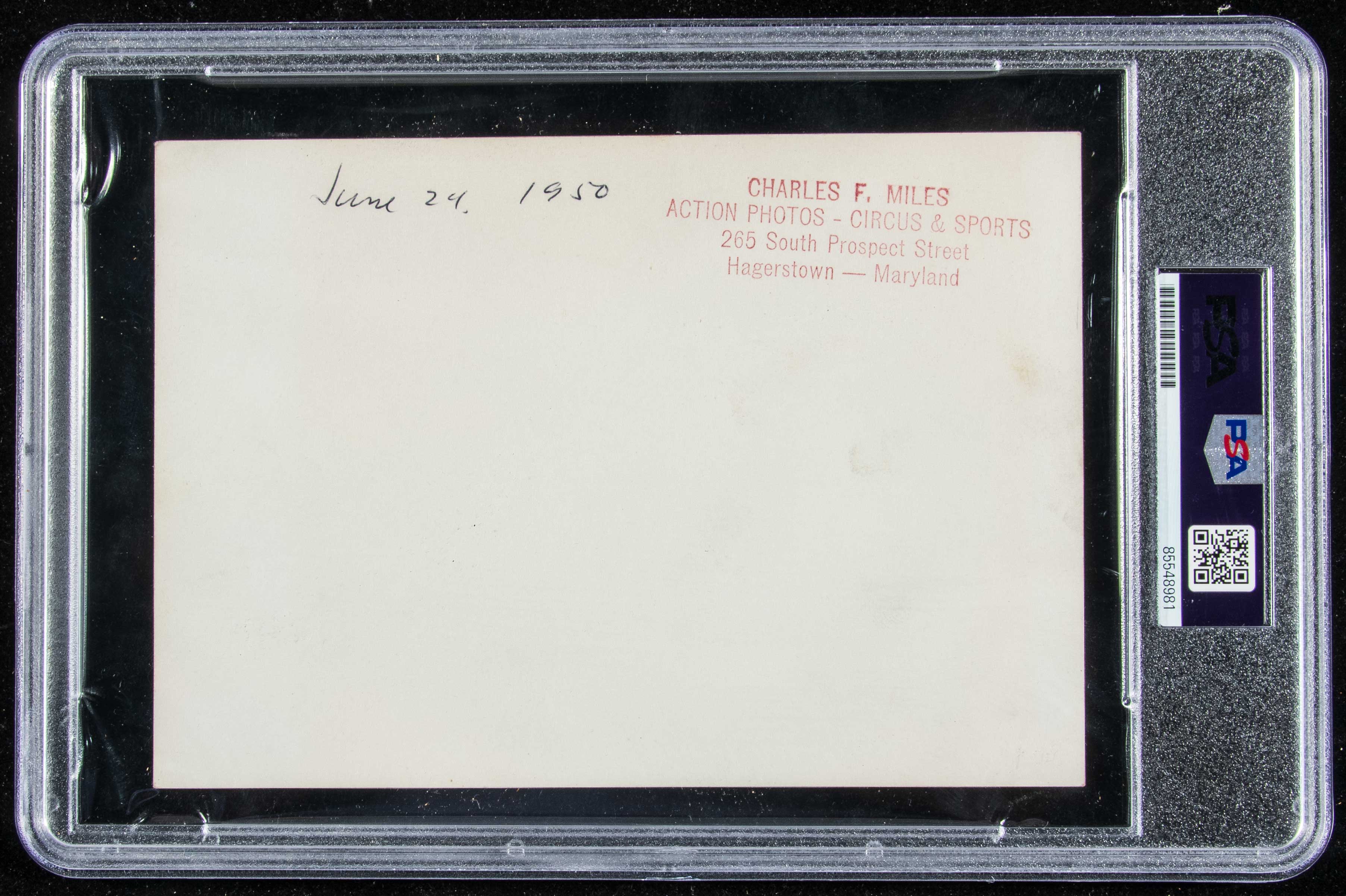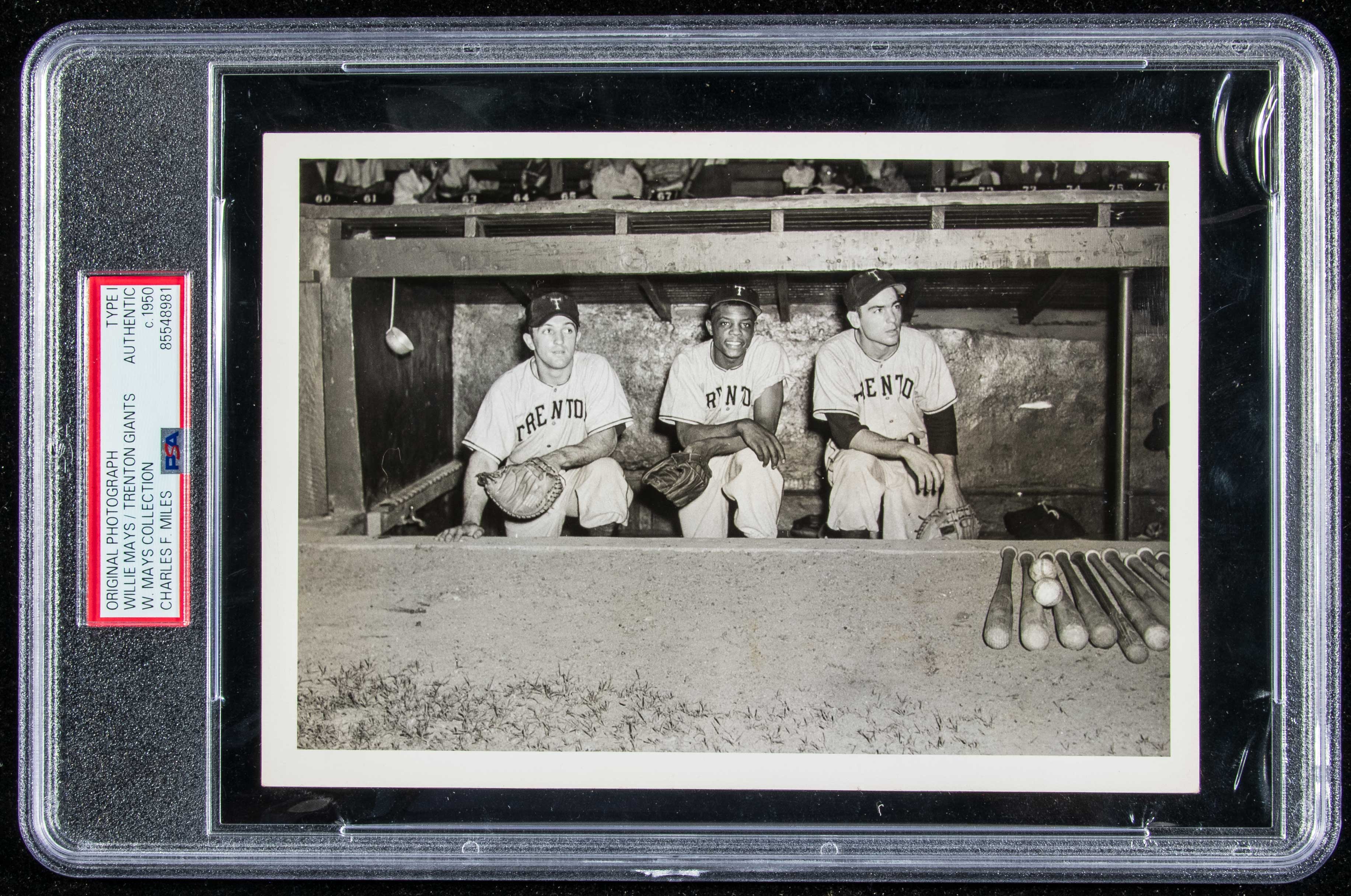 Description:Exceptional and Likely Unique Willie Mays Trenton photograph attributed to June 24, 1950 MLB Affiliated Debut: Earliest Type I photo of Mays authenticated by PSA/DNA (PSA/DNA Type I). Original 5"x7" black and white candid image picturing a notably youthful Willie Howard Mays Jr. posed in the dugout with two other players. The image displays superlative clarity and registration capturing an undoubtedly jubilant young Mays preparing to begin his Major League Baseball career. The back of the photo is stamped by Charles Miles photographer of Hagerstown, MD importantly with a handwritten date of "June 24, 1950". This date corresponds to Mays' first appearance as a Trenton player as played in Hagerstown, MD. Overall condition is outstanding with minimal visible wear. We are not able to document the existence of another copy of this image and is noted by PSA/DNA to be the earliest Type I image of Mays authenticated to date. The importance of the offered image cannot be overstated with the additional emphasis as having been carefully preserved within Willie Mays personal collection. Encapsulated by PSA/DNA (Type I) with special "W.Mays Collection" pedigree labeling: NM-MT
