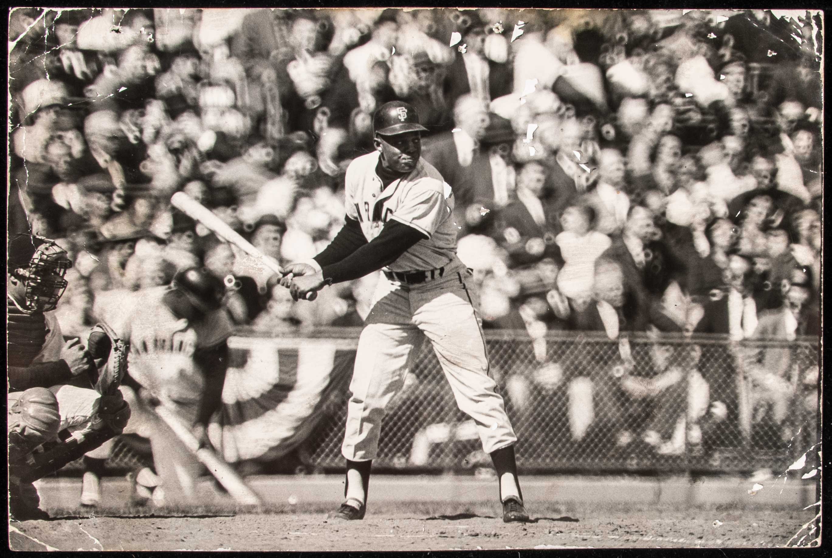 Description:Fine Willie Mays large format photograph for Life Magazine c.1960s. Stirring 9"x13" black and white image of Mays in full batting stance with superb depth of field use having the crowd in the background blurred to form a perfect backdrop. Stamped by Life Magazine on the back with photographer name having faded. Some surface creasing to the front along with scattered small areas of flaking to the surface emulsion. Allowing for the aforementioned condition points, one of the finest original images within the Mays Collection. Includes certificate of provenance from the Willie Mays Collection: VG