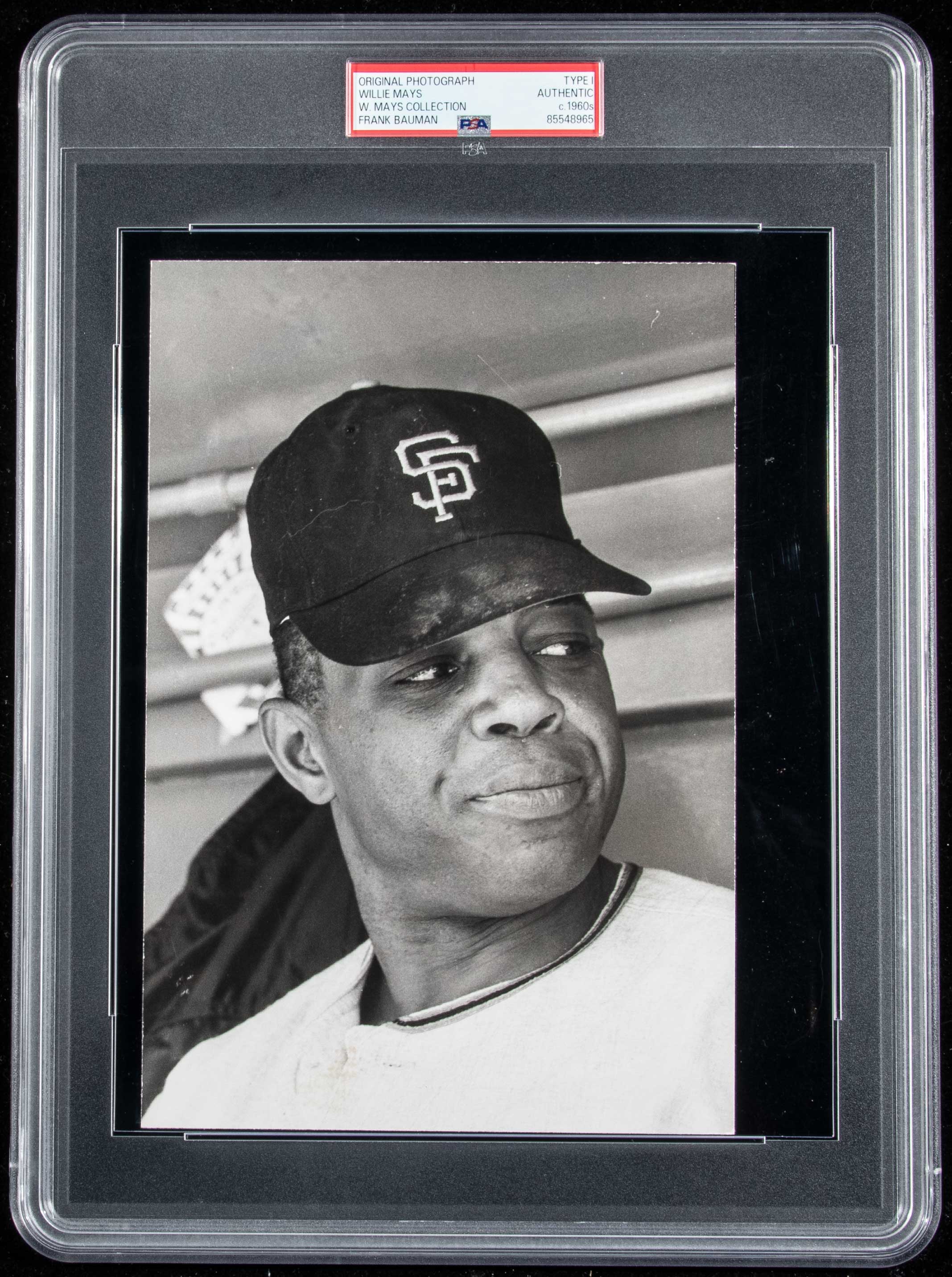 Description:Willie Mays photograph by Frank Bauman for LOOK Magazine c.1960s (PSA/DNA Type I). Fine candid black and white 6"x9" image picturing Mays posed in Giants uniform inside of a dugout with his hat propped forward with an intriguing facial expression. Stamped by photographer Frank Bauman for LOOK Magazine on the back of each. Encapsulated by PSA/DNA (Type I) with special "W.Mays Collection" pedigree labeling: EX-MT