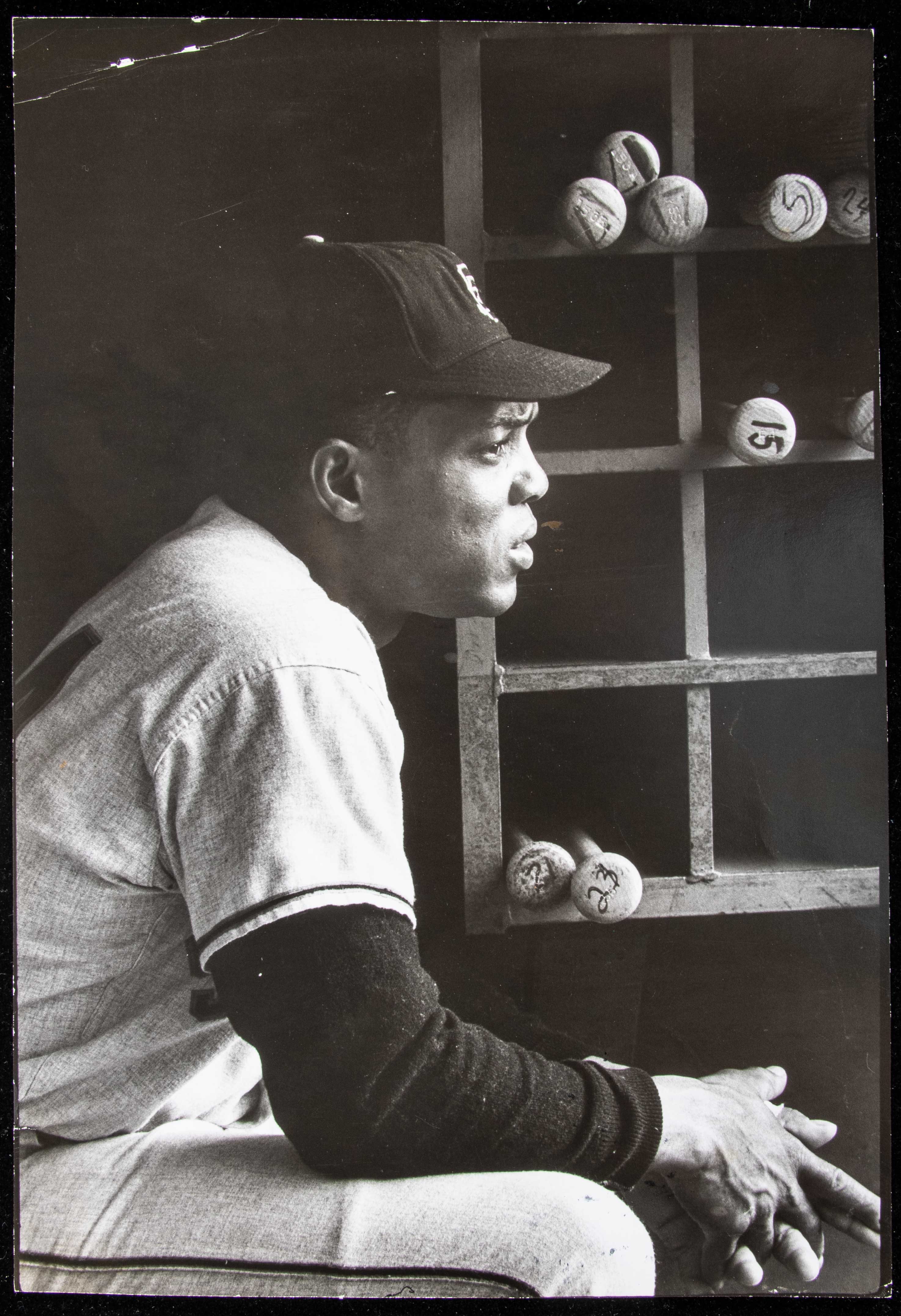 Description:Exceptional 1968 Willie Mays photograph by Tony Triolo for Time Magazine (PSA/DNA Type I). Black and white 9.25"x13.5" photograph showing Willie Mays seated in the dugout with a pensive gaze. Overall composition is exceptional and the image offers a striking art-like quality. "T.Triolo" credit is handwritten on the back and there are "Time/Life" and "Sep 19 1968" stamps along with some other markings. In fine overall condition with some light general wear, a few more pronounced creases to upper left, and a handful of flecks of surface reside. Includes full LOA from PSA/DNA (Type I): VG-EX