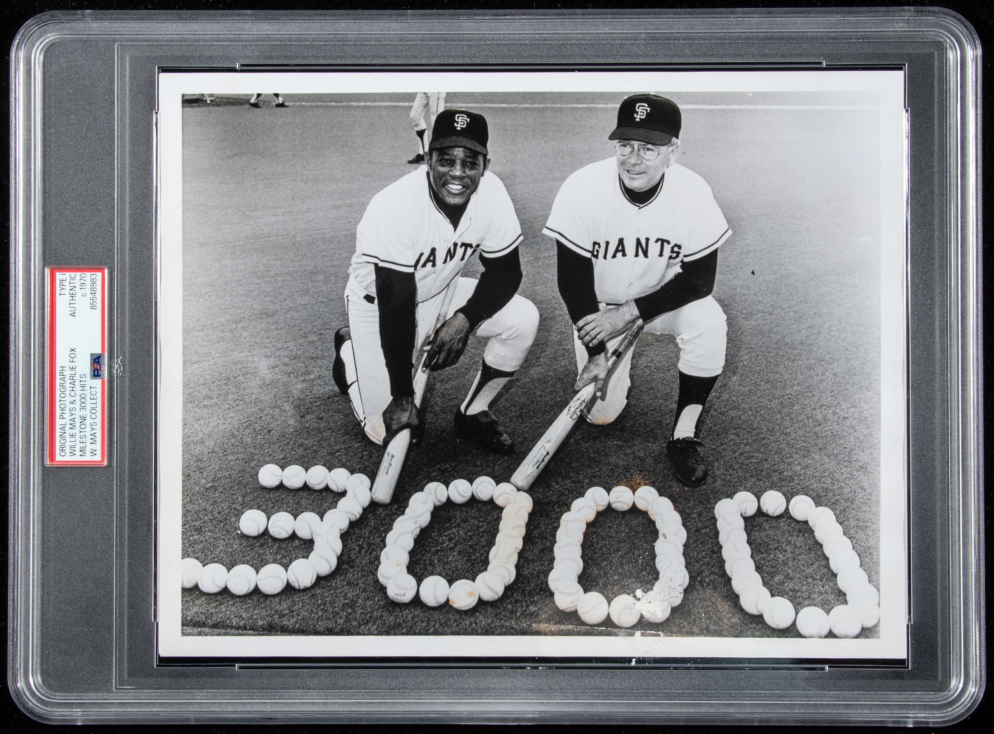 Description:Willie Mays 3,000th Hit photograph c.1970 (PSA/DNA Type I). Black and white image picturing Willie Mays kneeling aside "3000" spelled out in baseballs to commemorate his 3,000th career milestone base hit. Giants' manager Charlie Fox is posed alongside of Mays with a small area of abrasion at bottom edge. Black back. Encapsulated by PSA/DNA (Type I) with special "W.Mays Collection" pedigree labeling: EX