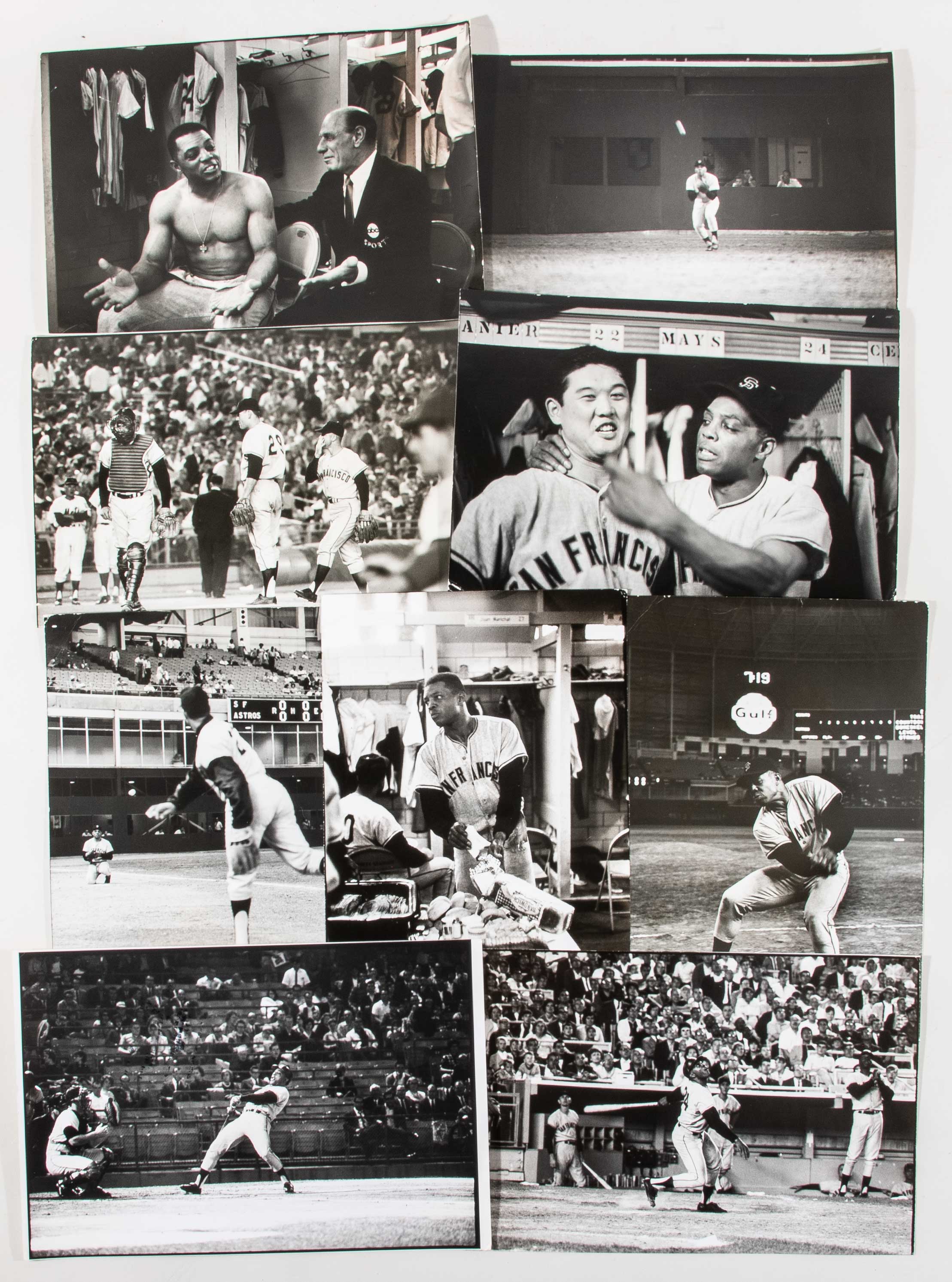 Description:Cache of (41) Willie Mays and San Francisco Giants related large format photographs c.1965. Series of 9"x13" oversized black and white professional images as taken for Time Inc. depicting Willie Mays and other San Francisco Giants subject matter. Includes a number of very fine action images, photo of Mays and Leo Durocher, and several candid images of Mays in locker room. Photos are all stamped on the back by Time Inc. for Life Magazine and Sports Illustrated. with photographers marked as well including Herb Scharfman and Bob Gomel. Light overall wear. Really fine grouping with excellent breakdown value. Includes certificate of provenance from the Willie Mays Collection: Range EX-NM