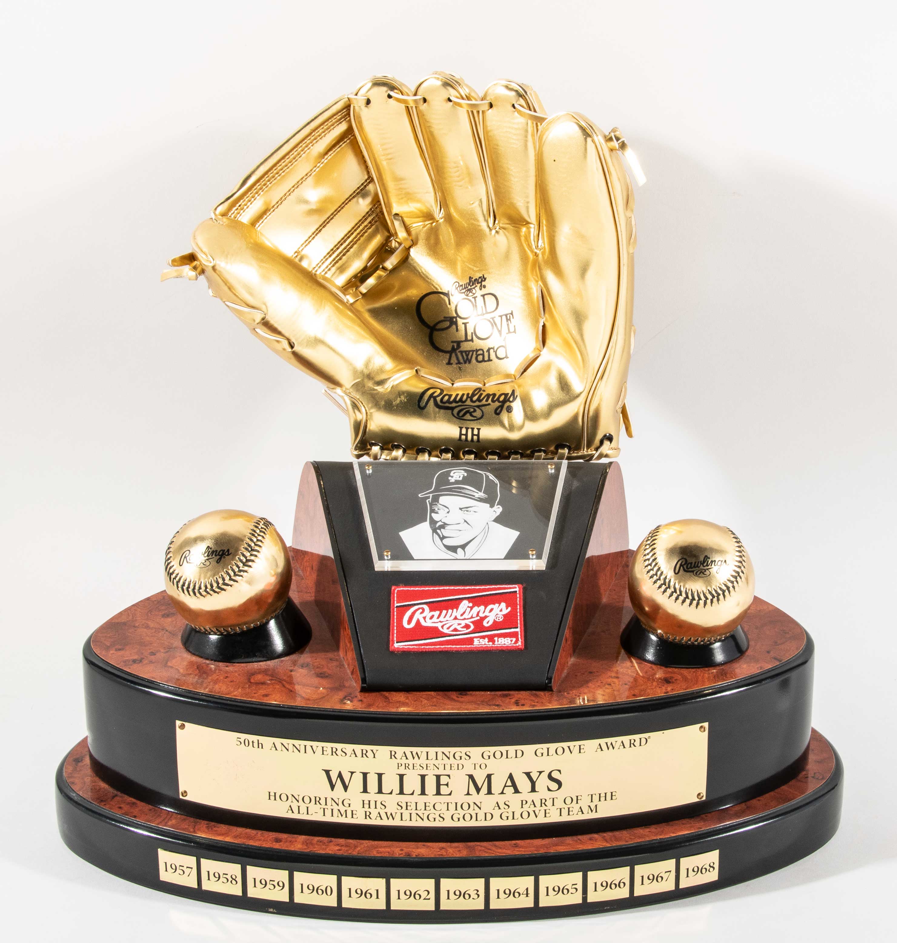 Description:2007 Willie Mays Rawlings Gold Glove 50th Anniversary All-Time Team award. Important presentational award given to Willie Mays in recognition of being named to Rawlings Gold Glove 50th Anniversary All-Time team with a career total of twelve National League Gold Glove Awards. Substantive weighted base with mahogany style veneer coating displaying two gilt decorated Rawlings baseballs and a fielder’s glove with inset engraved acrylic image of Mays. Applied brass placards on front of the base engraved to Willie Mays and also denoting the years in which he won the NL Gold Glove award. This career award was given to Mays as the leading honoree to name an All-Time team of Gold Glove recipients in celebration of the 50th anniversary of the award. Notable career related award with special affiliation to the player who many believe to be the greatest defensive talent in the history of the game. Includes certificate of provenance from Willie Mays Collection: EX-MT