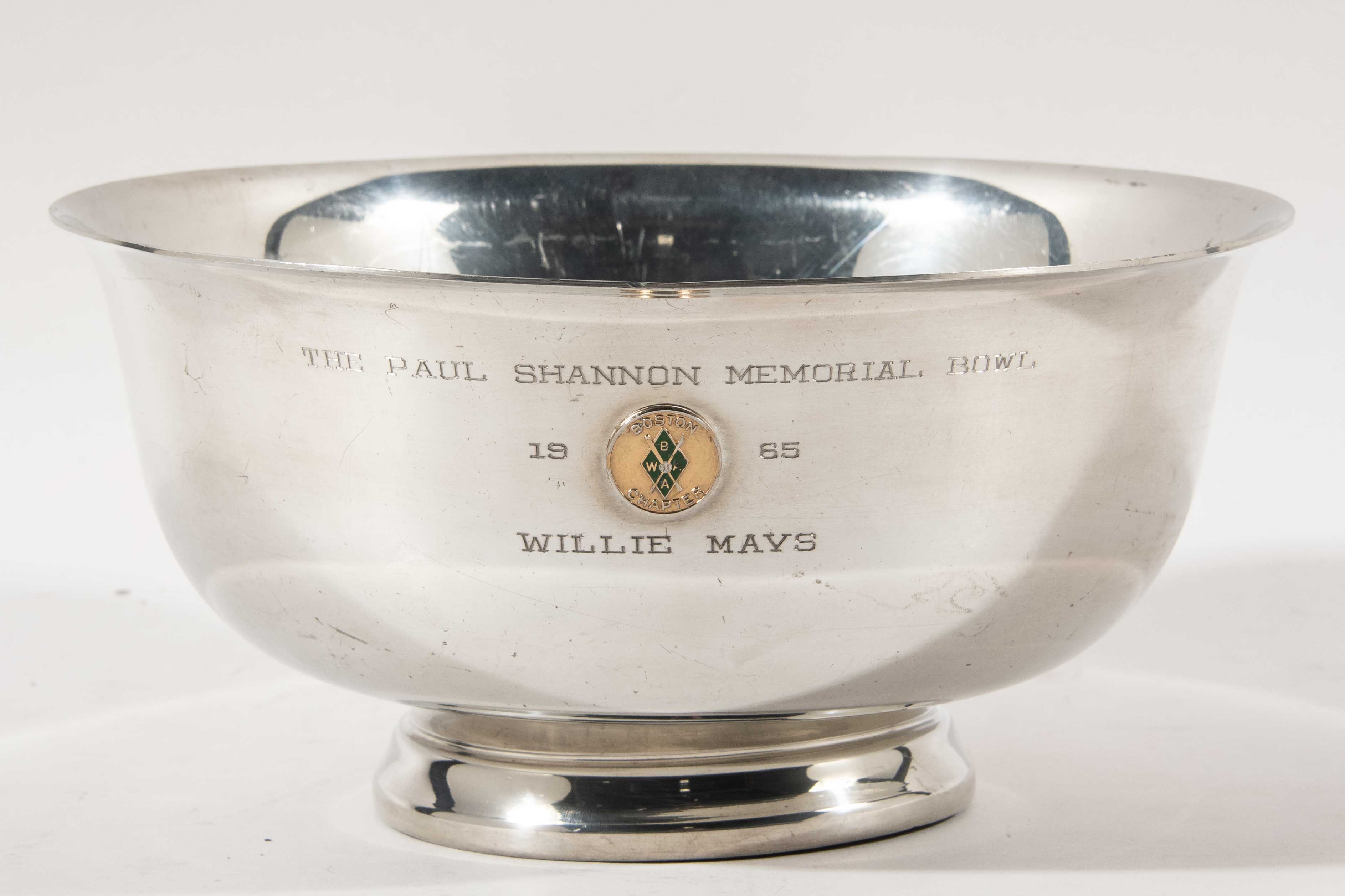 Description:1965 Willie Mays "Paul Shannon Memorial Award" (NL MVP Season)(NL Championship Season). Silverplated pewter award bowl as presented to Mays by the Boston Chapter of the BWAA titled across the front to Mays with embossed insignia of the presenting chapter. Marked Paul Revere hallmark under the base. 10" diameter with light surface wear. Includes certificate of provenance from the Willie Mays Collection: EX-MT