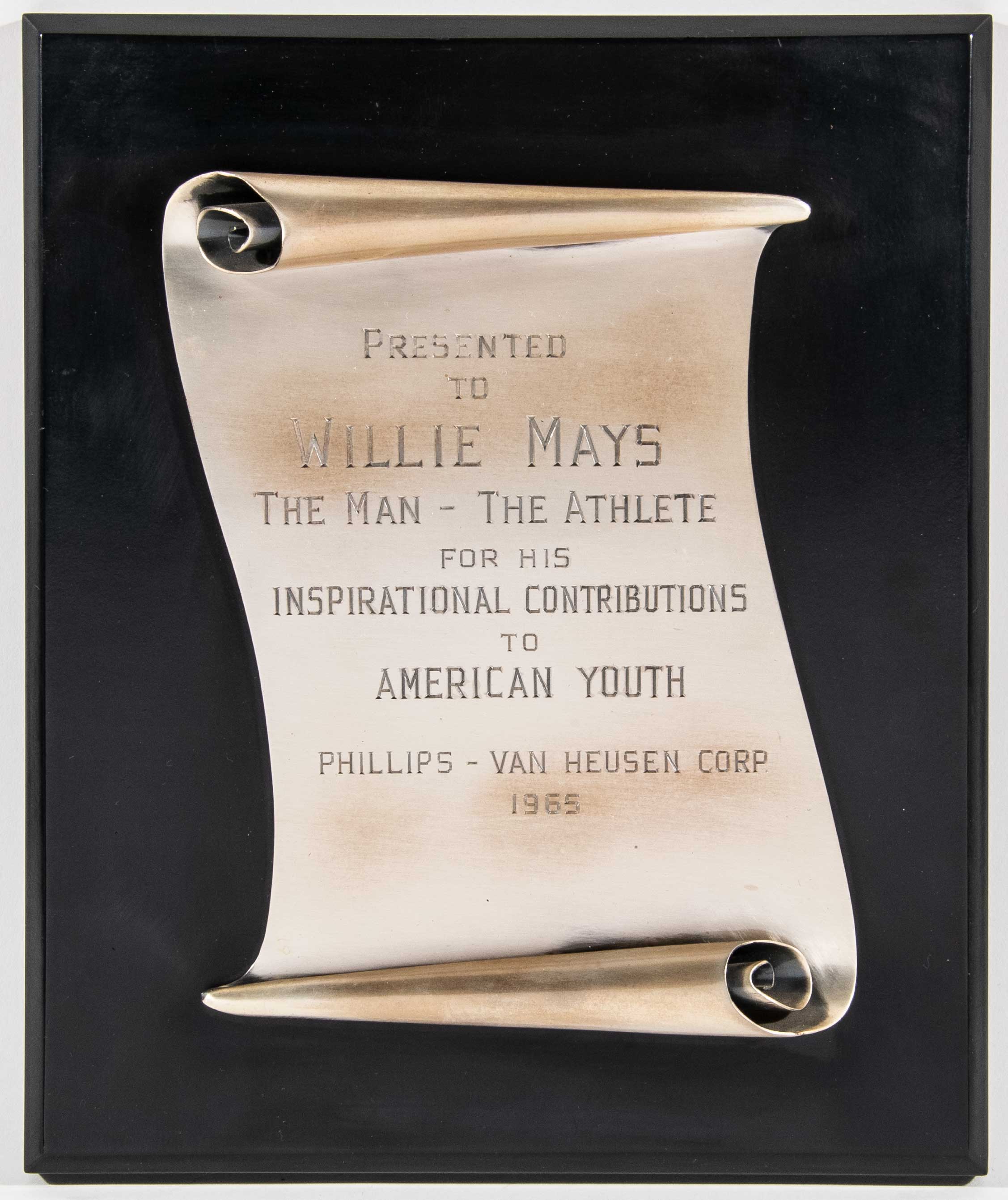 Description:1965 Willie Mays presentational award plaque by Phillips-Van Heusen Co. Ebonized black wooden plaque with affixed figural silverplate placard inscribed to Mays in recognition of "The Man-The Athlete" for his contributions to American Youth. Dated 1964 and retains its original Dieges & Clust manufacturer's label on the back. 9"x11" with light surface wear. Includes certificate of provenance from Willie Mays Collection: EX-MT