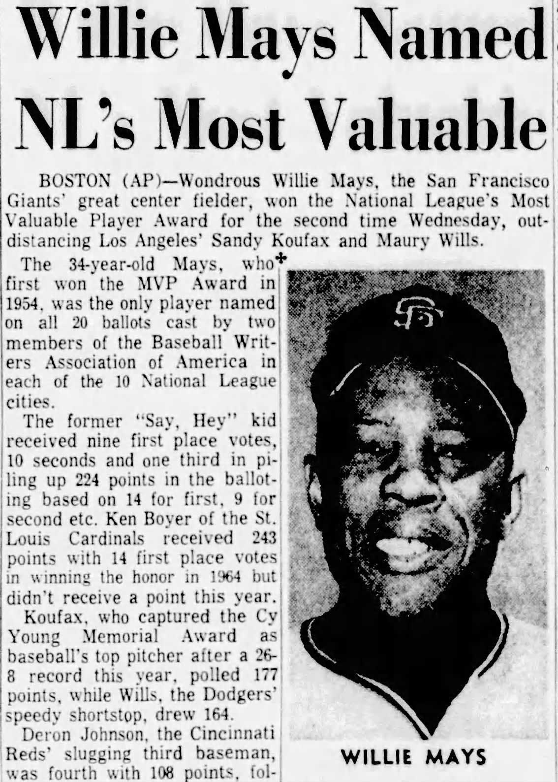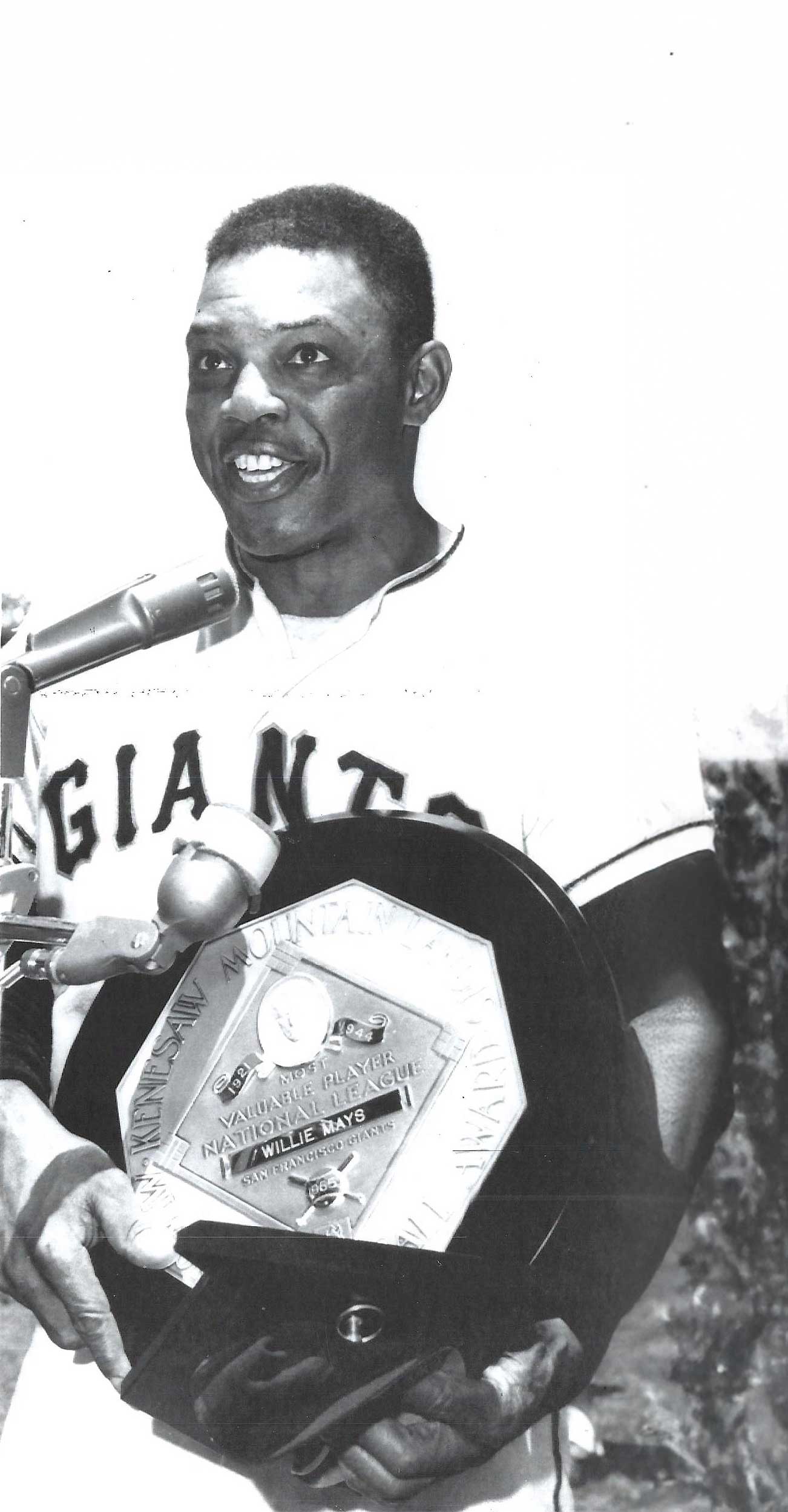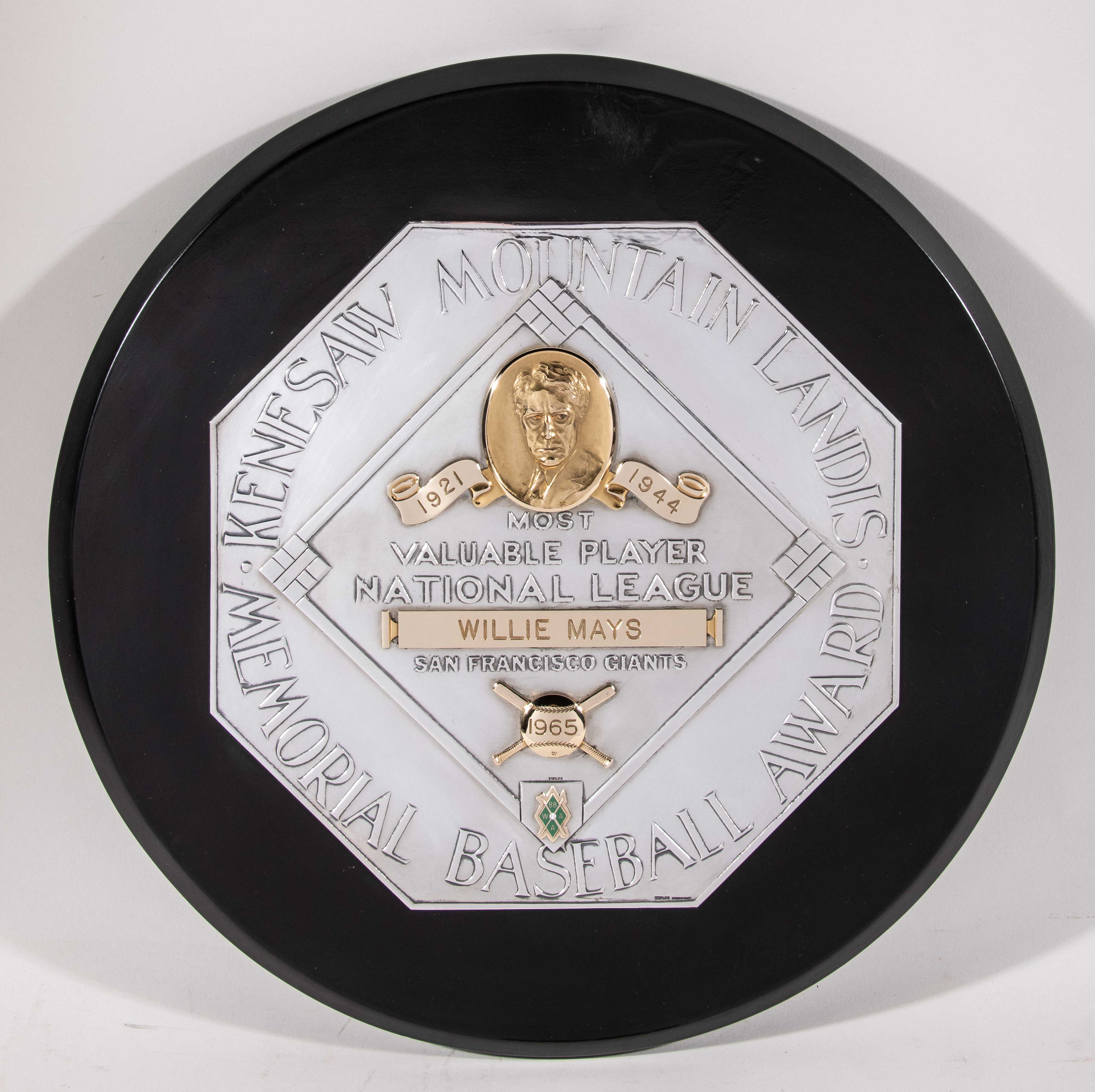 Description:1965 Willie Mays National League Most Valuable Player Award. Black painted wooden plaque measuring 16” across display with its original octagonal sterling silver placard mounted on front. A 10K gold bust of Kennesaw M. Landis with cartouche is positioned above “Most Valuable Player National League” and “San Francisco Giants” titling in relief. Gold nameplate with engraved “Willie Mays” name is positioned above an additional date of “1965” incorporated into a 10K gold crossed bat and ball design. The larger silver placard is stamped “Sterling Dieges & Clust” at lower right. Black painted wooden plaque remains fairly clean with a few areas of surface wear noticeable upon close inspection under a secondary coat of black paint add many years ago. The black paint currently on the wooden plaque has been repainted at some point many years ago which now masks some of the aforementioned condition points. Original Dieges & Clust manufacturer’s foil label is affixed to the back but mostly masked by the black paint. While Mays’ 1954 NL MVP season properly remains one of the most legendary of his career his 1965 season is arguably the most impressive of that same tenure. Mays led the senior circuit with 52 Home Runs, .645 Slugging %, 1.043 OPS, and a fantasy-like 11/2 WAR number. Although Mays’ Giants would fall short of the 1965 NL pennant his performance was so dominant that he soundly beat out Sandy Koufax for the NL MVP even though the Dodgers’ pitcher went 26-8 with a 2.04 ERA and threw 27 complete games. Along with its sister from 1954, the offered MVP award occupied a place of prominence within the Mays household for decades noted as a particular point of pride for Willie Mays himself. One of the crowning achievements from Willie Mays’ period of excellence. Includes modern image of Mays receiving the award and a certificate of provenance from the Willie Mays Collection: EX