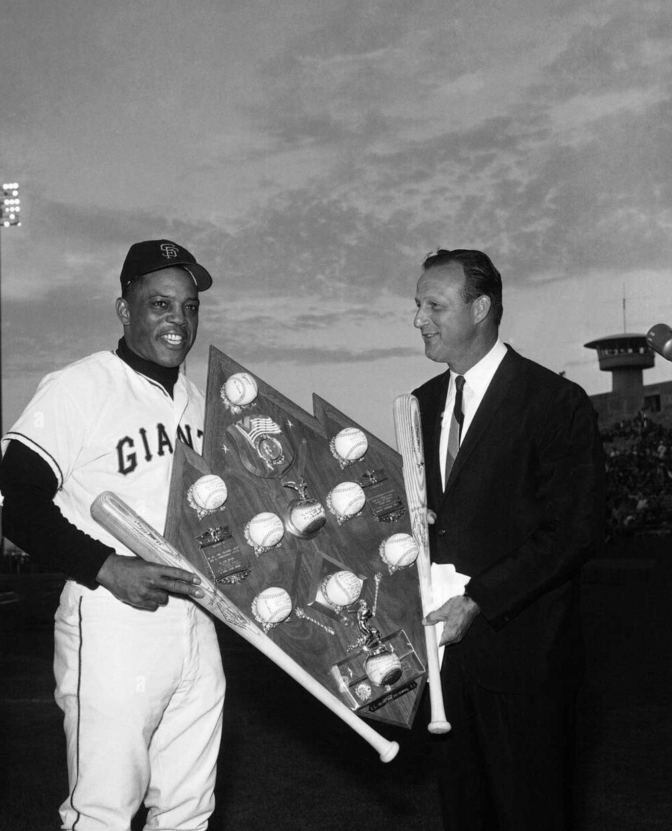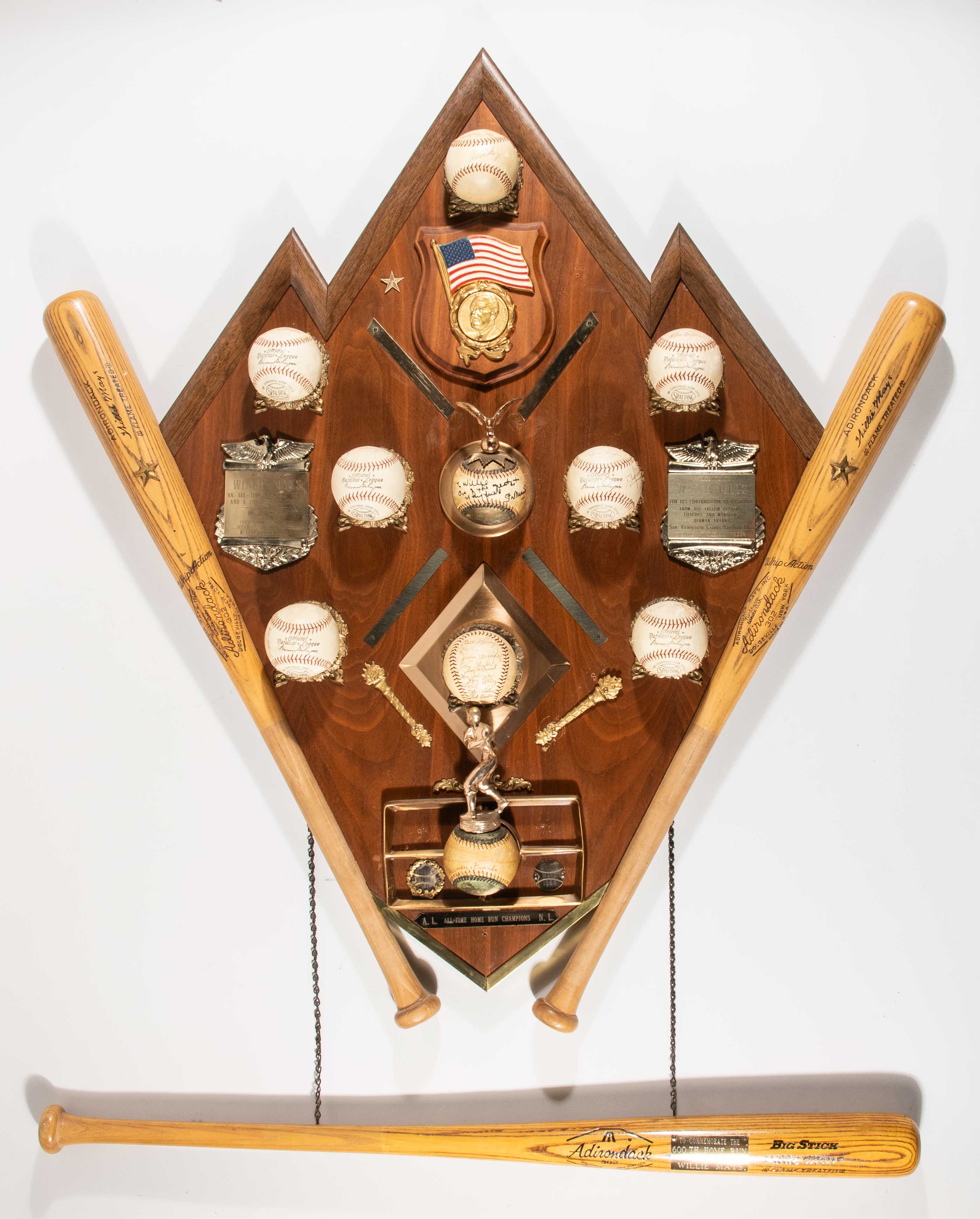 Description:1966 Willie Mays 534th Home Run presentational display (Mays Collection photo match). Large and ornate presentational display given to Willie Mays in celebration of his historic 534th career home run tying Jimmie Foxx in 1966. The display was a gift of Louis Lewyn and commissioned by Stan Musial on behalf of President Lyndon B.Johnson and the San Francisco Giants both of which are memorialized on engraved brass placards. General display consists of wooden backboard that showcases two Willie Mays Adirondack model baseball bats fat left and right borders. Selection of ten baseballs are mounted throughout the display many of which having been signed by San Francisco Giants teammates and one with Mays on the sweet spot. Central baseball is inscribed to Mays from his friend and fellow All-Star Stan Musial who was also related to the presentation itself. Additional decorative placards with Babe Ruth and Willie Mays affixed to the bottom along with inscribed brass plate denoting the All Time Home Run kings in the AL and NL as of 1966. Additional Willie Mays Adirondack bat is suspended from the main display by a chain link as added later by Mays having inscribed brass placard affixed to the front "To Commemorate the 600th Home Run of Willie Mays". General light to moderate age/handling wear is evident including a few loose brass decor items. The award occupied a prominent space within the Mays home and later offices for many years as an important testimonial to the milestone home run that placed him at the pinnacle of National League home run hitters. Includes period image of the award in Mays home and Includes certificate of provenance from Willie Mays Collection: EX