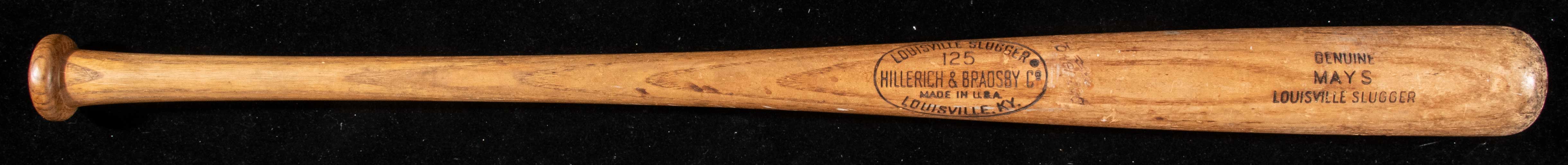 Description:Willie Mays professional model baseball bat c.1968 (PSA/DNA GU8). Louisville Slugger 125 model bat measures 35” long and weighs 34.6 ounces. The bat remains showing fine evidence of moderate use including ball marks, blue bat rack streaks, and grain swelling. Strong eye appeal with noted condition points of a small professionally repaired knob chip and several bruises visible on and around the barrel area. Model number D2 stamped on knob end with “Mays” impressed in block lettering on the barrel. This bat is the one of only three game bats within the Mays Collection and the only non All-Star Game related variant. Includes LOA from PSA/DNA (GU 8) and certificate of provenance from the Willie Mays Collection : EX