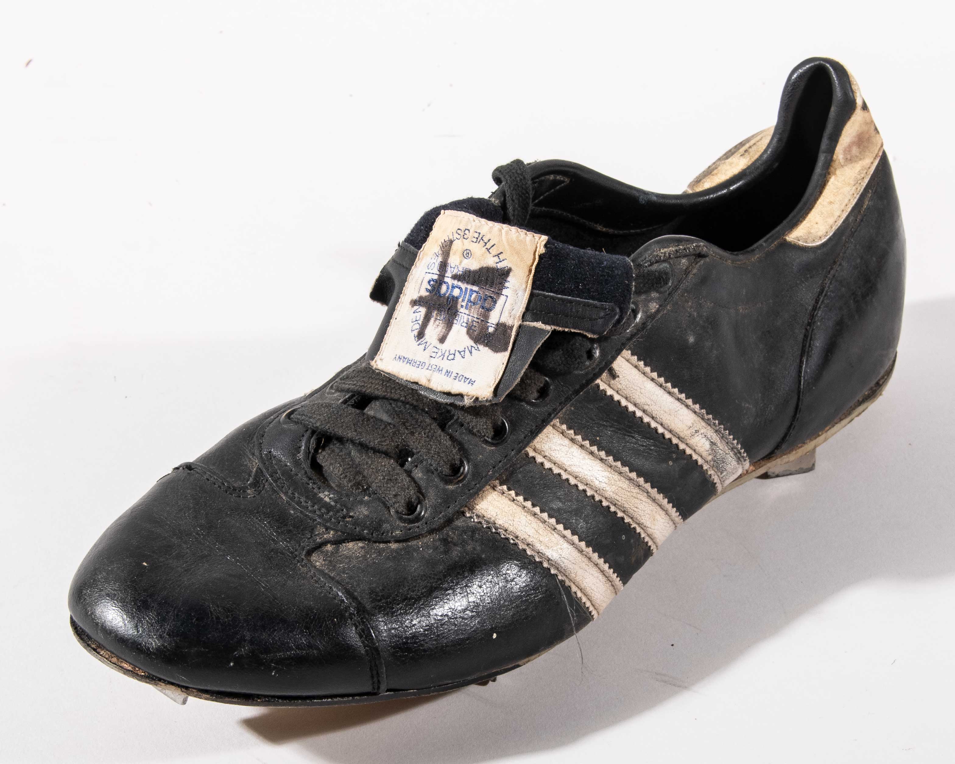 Description:Willie Mays San Francisco Giants professional model baseball cleat c.1960-70s. Black leather baseball cleat exhibits heavy use with soil residue on the bottom of the cleat plate area. Vintage Adidas manufacturer's label affixed to the tongue with "24" in black marker. Includes certificate of provenance from the Willie Mays Collection: VG-EX