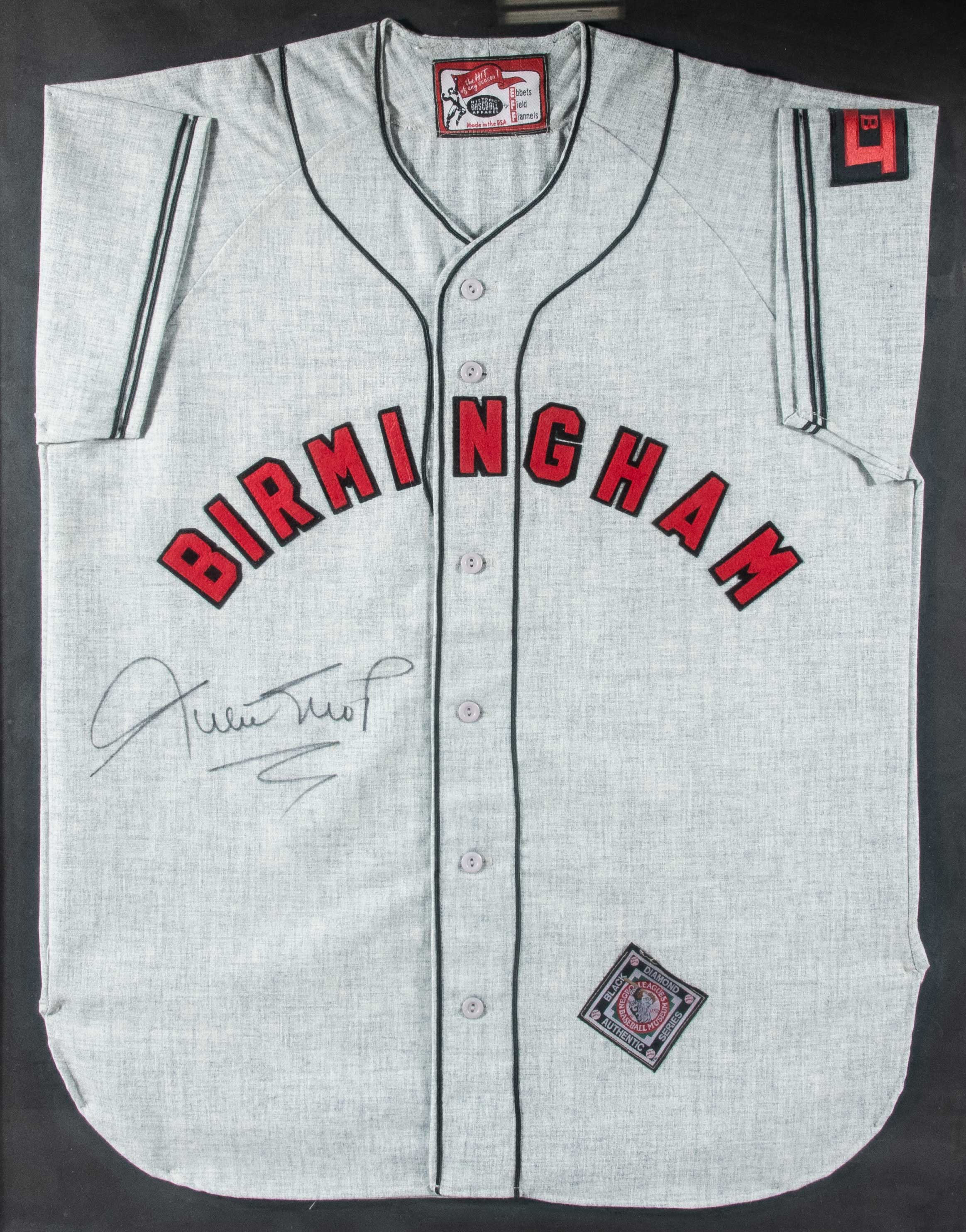 Description:Willie Mays autographed Birmingham Black Barons jersey display. Grey flannel Birmingham Black Barons Willie Mays replica jersey signed by Mays in black sharpie across the front. Signature is very large and rates 8/9 out of 10. Ebbets Field Flannels manufacturer's tag inside the collar area with the jersey having been framed for display purposes. Includes full LOA from JSA and certificate of provenance from the Willie Mays Collection: NM-MT