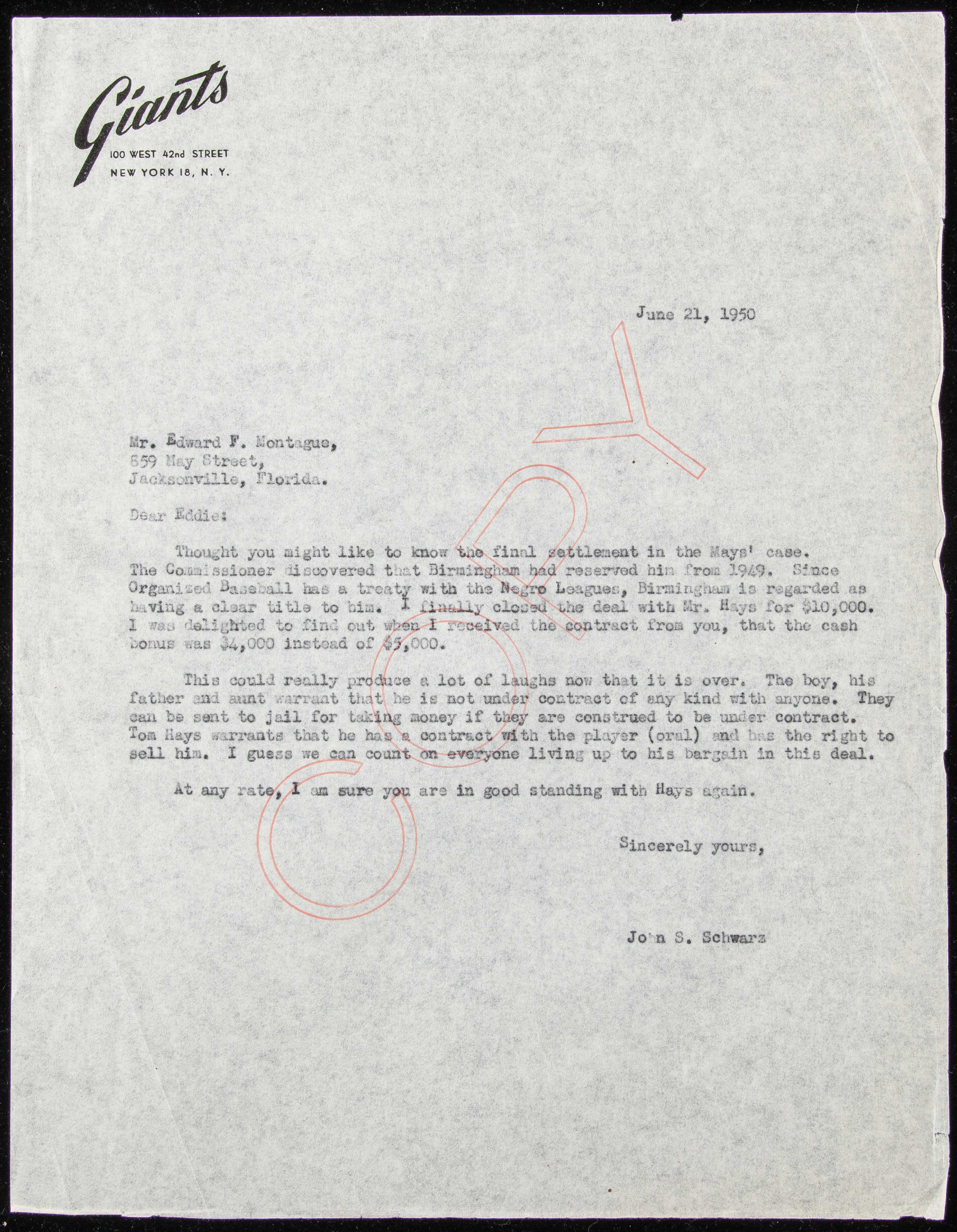 Description:June 21, 1950 Willie Mays San Francisco Giants Purchase Agreement Document from Birmingham Black Barons. Willie Mays personal file copy of the document letter written on June 21, 1950 from John Schwarz of the New York Giants to Edward Montague of the with content regarding the agreement to purchase the rights to Willie Mays from the Birmingham Black Barons for $10,000. The document is on New York Giants letterhead with fascinating content regarding the details of the contract negotiations between the Giants, Birmingham Black Barons, and Mays' family. It reads, in part, "Since organized baseball has a treaty with the Negro Leagues, Birmingham is regarded as having a clear title to him. I finally closed the deal with Mr. Hays for $10,000." This agreement also further corroborates that Schwarz rather than Montague, as believed for some time, was formally behind Mays' signing and Montague was simply given the documents to execute. Unsigned file copy paper with some minor edge wear and unsigned by Schwarz. Interesting and significant document with relation to Mays' earliest days of his professional career. Includes certificate of provenance from the Willie Mays Collection: EX