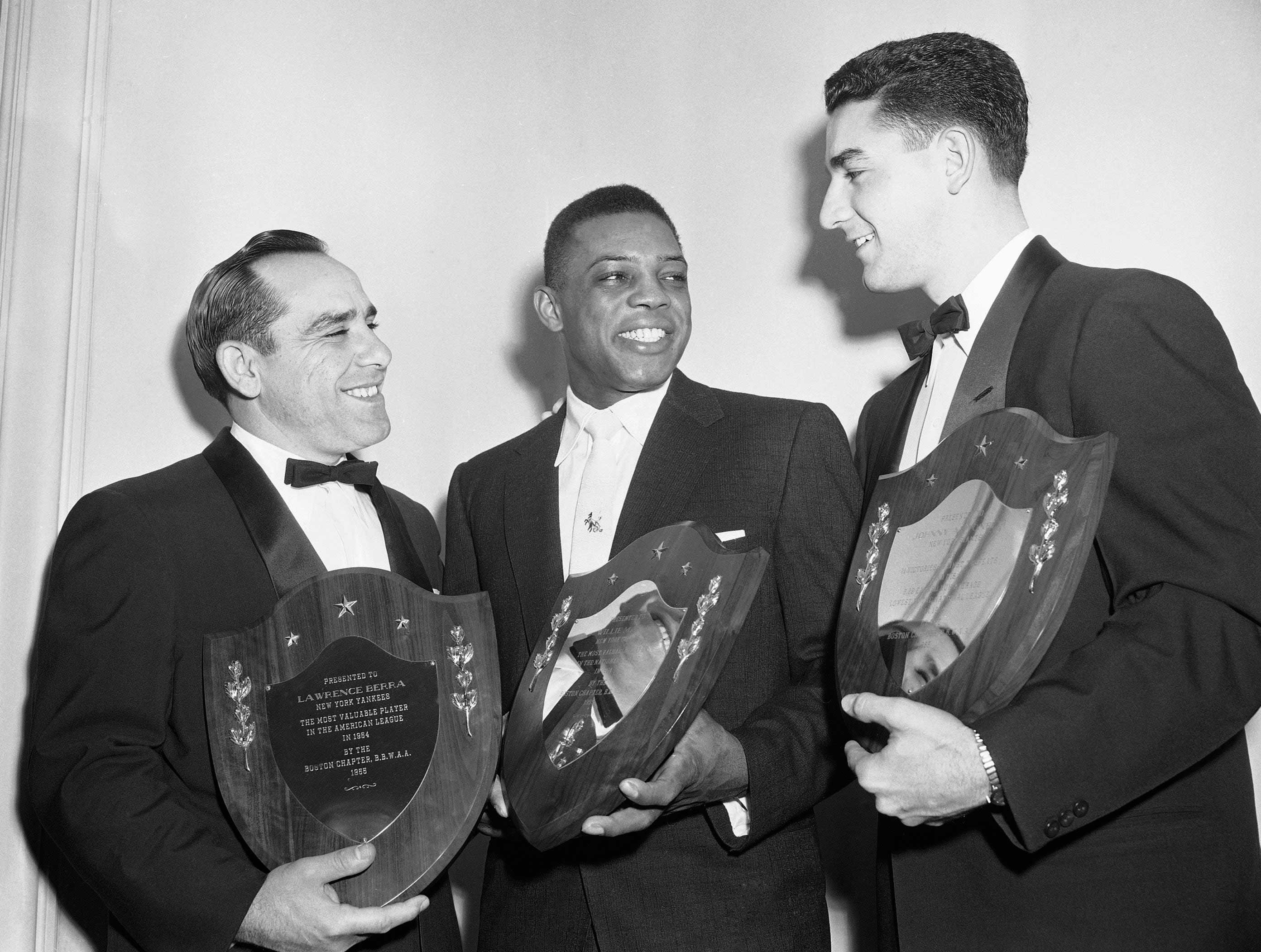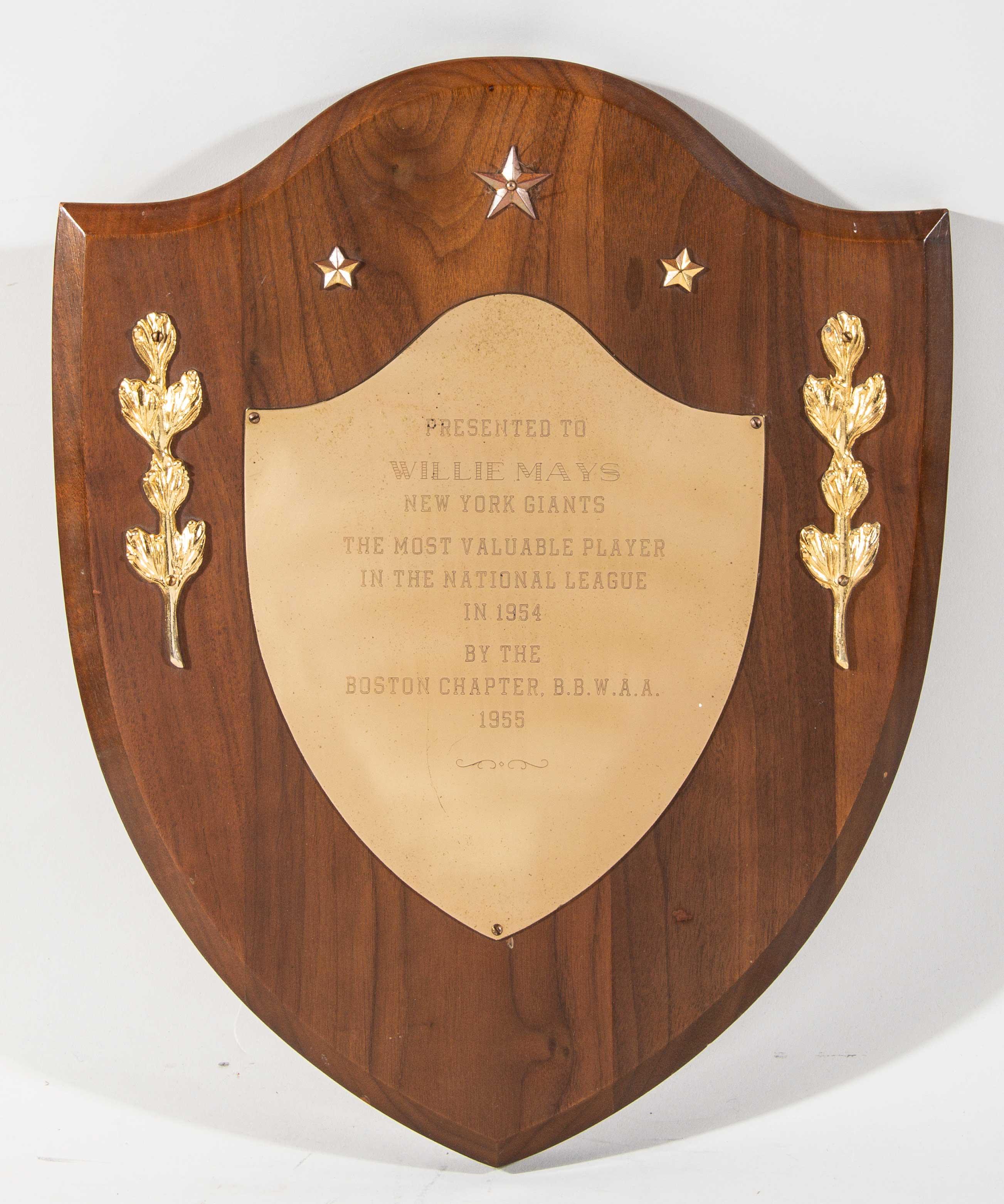 Description:1954 Willie Mays Most Valuable Player Award presentational plaque from Boston Chapter of BBWAA (NL MVP Season)(World Championship Season). Shield shaped walnut wooden plaque with applied brass placard given to Mays by the Boston Chapter of the BBWAA in recognition of his 1954 NL Most Valuable Player Award. Engraved to Mays on the front placard with presentation date of 1955. Light to moderate general surface wear. 15" tall. Notable award from one of the most prestigious baseball writer's chapters in the country. Includes certificate of provenance from the Willie Mays Collection: EX