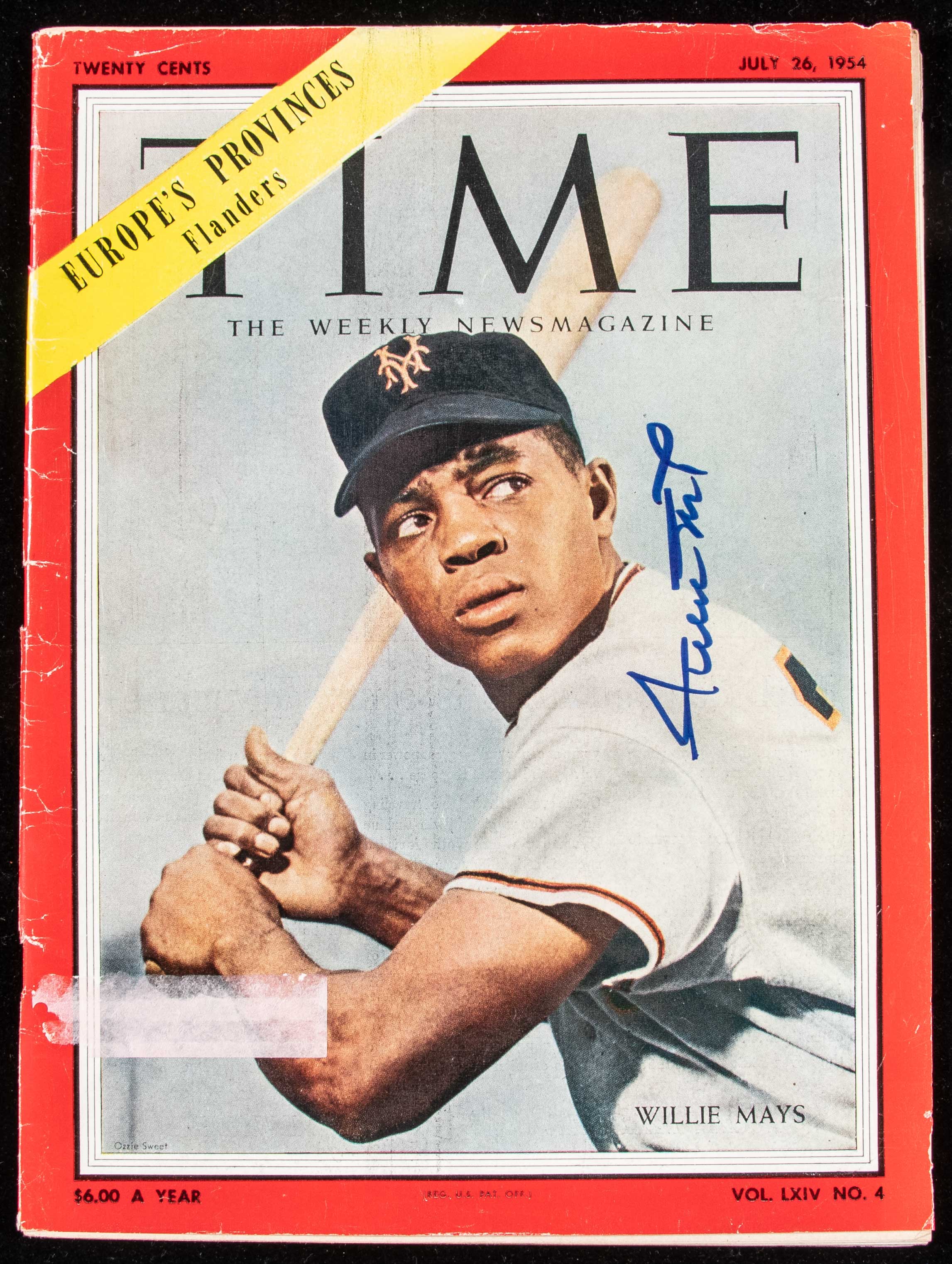 Description:Willie Mays autographed 1954 Time Magazine. Original July 26, 1954 issue of Time Magazine featuring Willie Mays on the front cover signed in blue sharpie. Signature rates 9 out of 10 with the magazine itself showing moderate handling wear and address label surface residue. Includes auction LOA from JSA (autograph) and certificate of provenance from the Willie Mays Collection: Magazine: VG, Signature: NM-MT