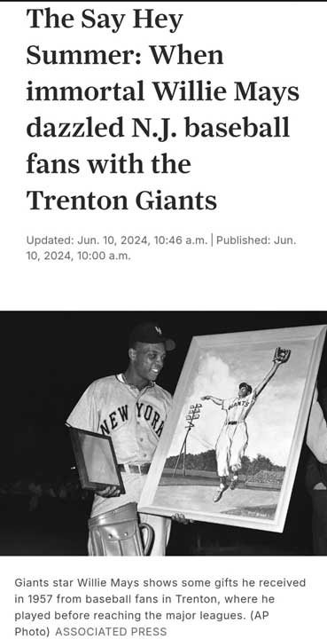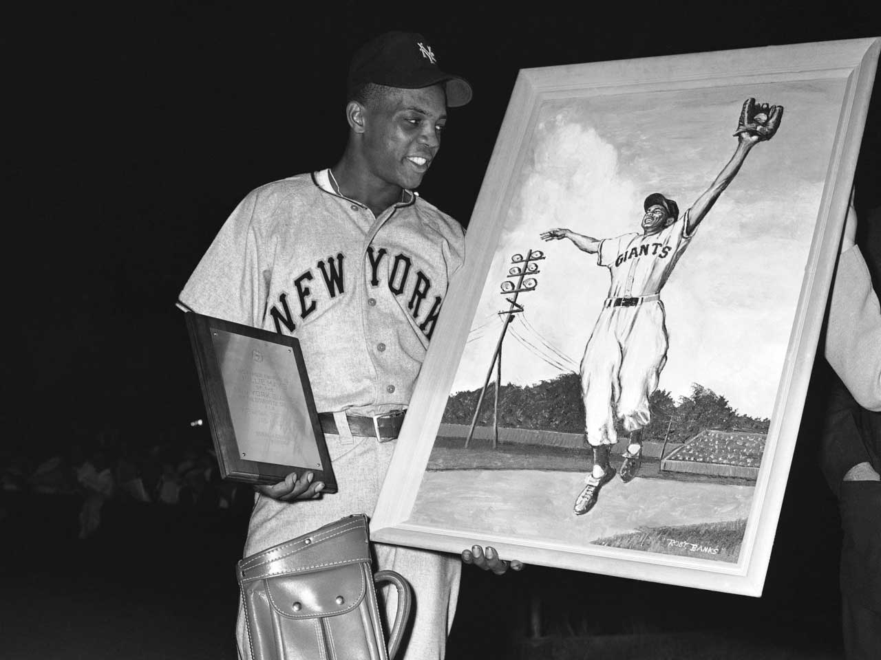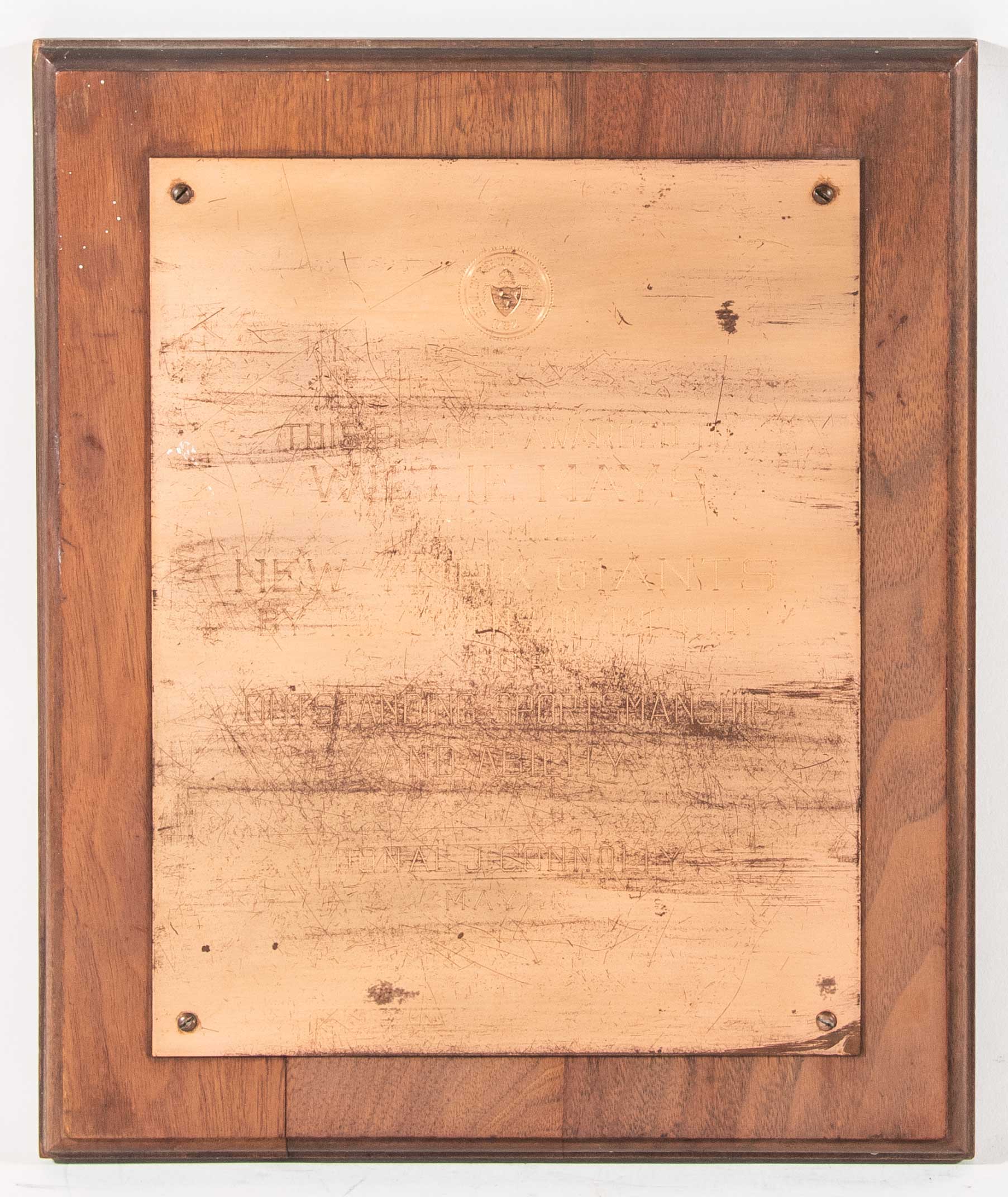 Description:Willie Mays City of Trenton Award plaque c.1950s (Mays Collection Photomatch). Walnut wooden plaque with applied copper façade engraved to Mays from the City of Trenton, NJ for his "Outstanding Sportsmanship and Ability" by the Mayor Donald J. Connolly. Moderate surface wear throughout including some scratching. Includes certificate of provenance from the Willie Mays Collection: VG