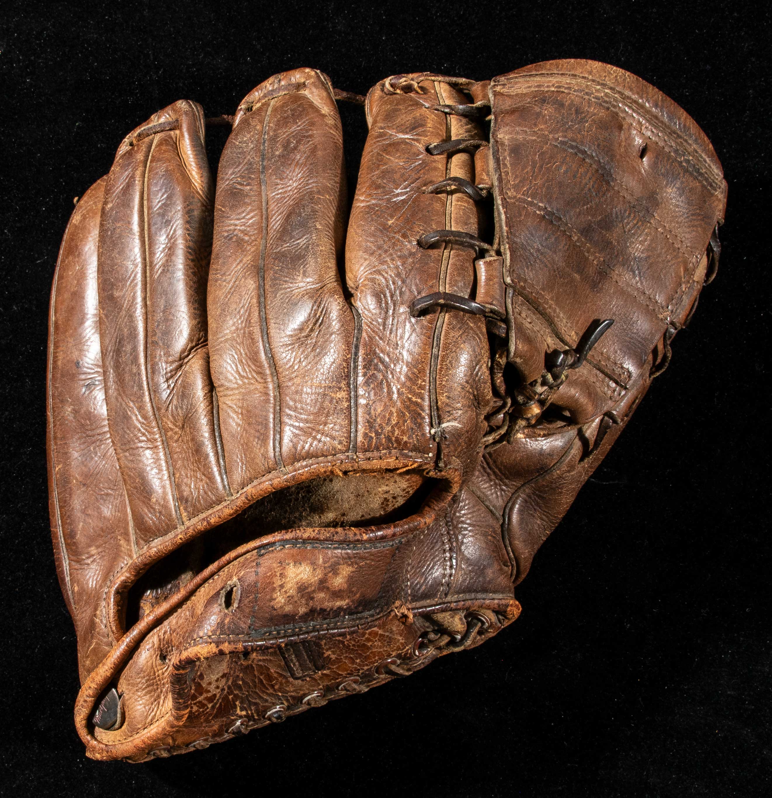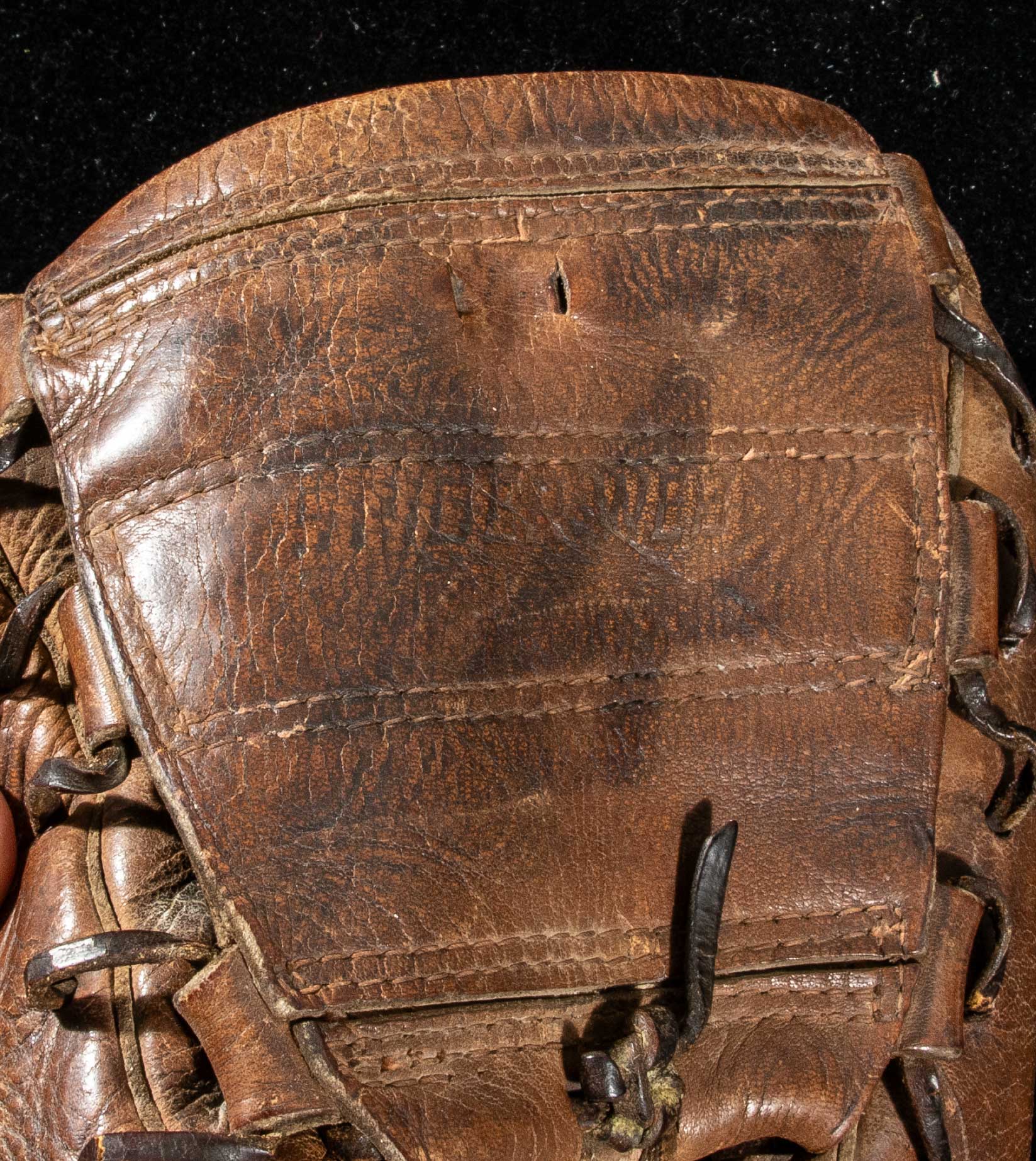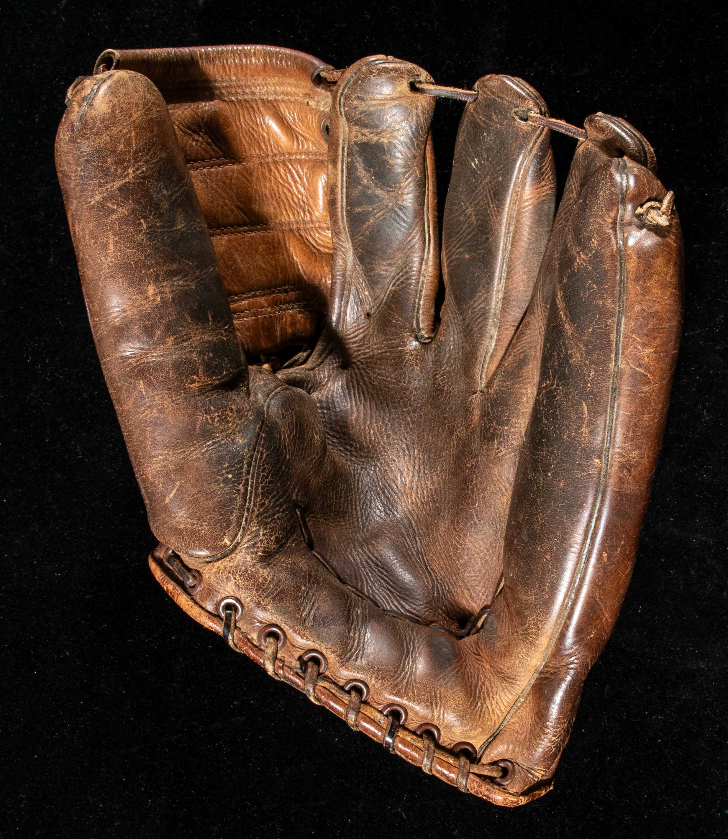 Description:**Rare Willie Mays professional model baseball glove c.1955 (PSA/DNA)(Style Photomatch). MacGregor G101 professional model glove of the highest quality the style of which was used by Willie Mays during the era in which he achieved his greatest personal and team accomplishments. The glove displays in a rich brown color retaining its original surface patination with exceptional evidence of use throughout including to the pocket area. That very use likely contributed to a portion of the original web lacings having been replaced and the MacGregor black manufacturer's label which was once affixed to the wrist area was lost to an undoubted number of dives for baseballs in the grass outfields. Some faint vestiges of faded black marker are visible around the wrist labeling area which may well have been "24" but are no longer visible to any degree of surety. Most notably, Willie Mays uniform number "24" is written in period black marker across the back of the one piece web measuring 2" square. The "24" has lightly faded appropriate to evident use and exposure to sunlight over time. Importantly, this trait of documented Mays game used glove with the uniform number written on the back of the web is corroborated by photographic evidence. Accompanying the PSA/DNA letter is a color image of Mays in New York Giants home uniform wearing the identical model glove with an oversized "24" written in black marker across the back of the web. This image was later used on the 1964 Auravision record set with the "NY" altered to "SF" for product use. While the offered glove is not an exact photo match to the aforementioned image it does succinctly corroborate the glove model and specific placement of the "24" uniform number as a matter of practice. Early career Mays game gloves are of very notable scarcity with only a handful of examples of quality having ever been offered to the public. Outstanding exemplar dating to the prime of Mays generational defensive prowess. Includes LOA from PSA/DNA and certificate of provenance from the Willie Mays Collection: EX