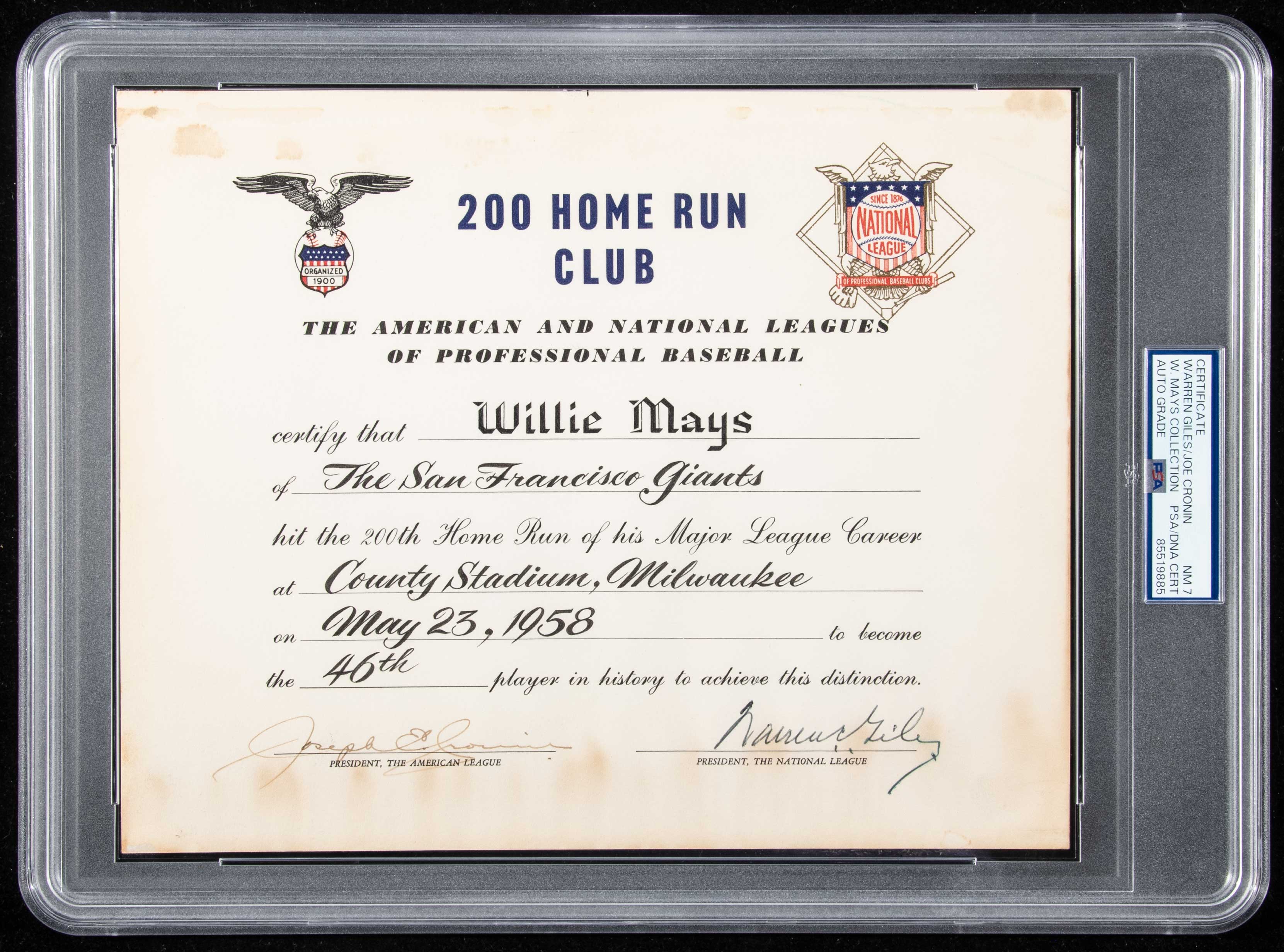 Description:1958 Willie Mays "200 Home Run Club" Award Certificate (PSA/DNA 7 NM). Presentational certificate as awarded to Mays after hitting his 200th career home run in the May 23, 1958 game played against the Milwaukee Braves at County Stadium. Signed in period ink by League Presidents Joe Cronin (6 out of 10) and Warren Giles (8 out of 10). Light to moderate age 'foxing' to the perimeter edges. Encapsulated by PSA/DNA (7 NM) with special "W.Mays Collection pedigree labeling: Certificate: VG-EX, Signatures: NM