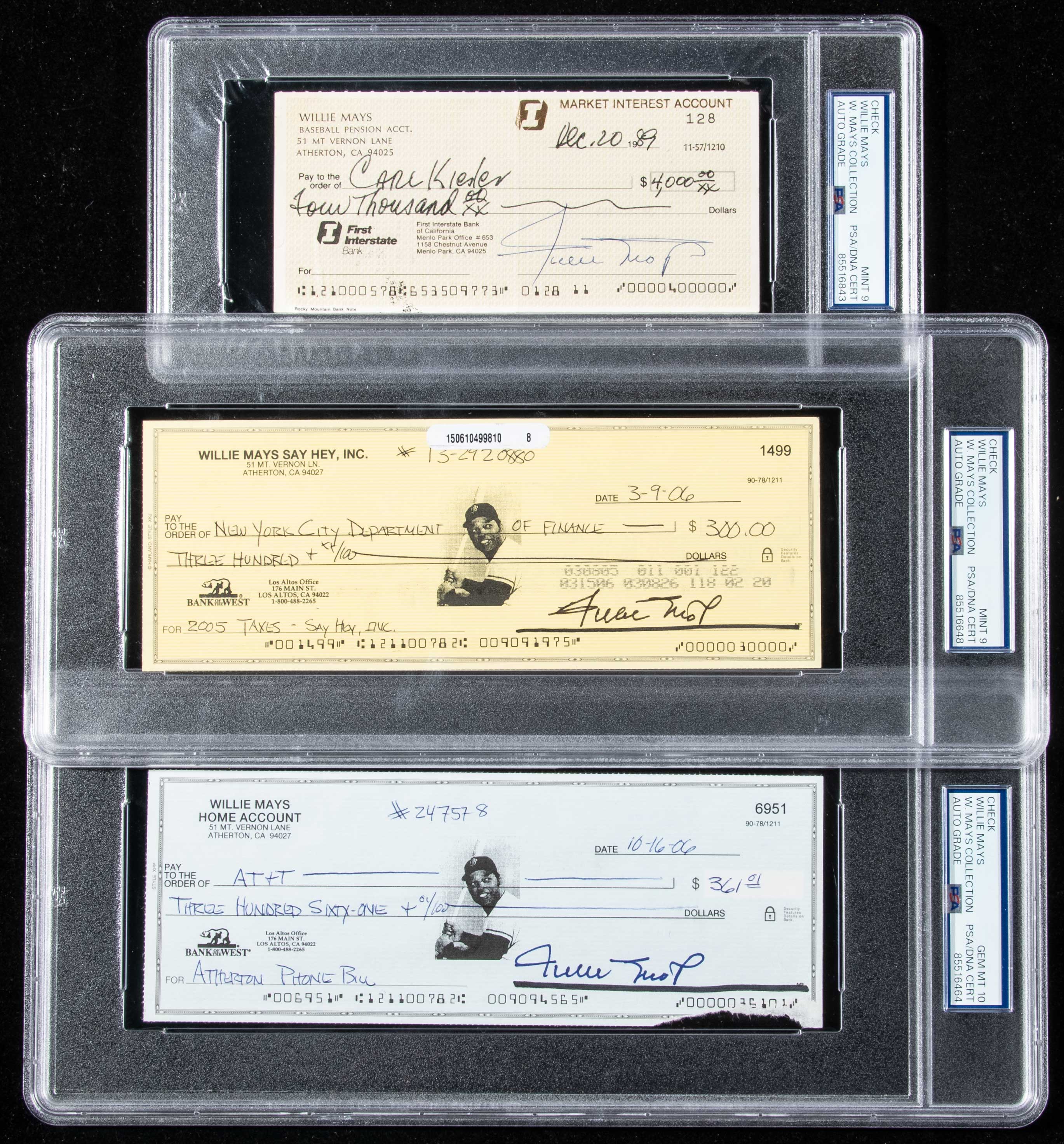 Description:Lot of (3) Willie Mays autographed checks (PSA/DNA 9 Mint and 10 Gem Mint). Nice lot of 1989-2006 dated checks, each signed "Willie Mays" at lower right. All autographs are graded by PSA (2 - 9 Mint; 1 - 10 Gem Mint) and there are varying degrees of typical handling and bank cancellation wear (a touch more pronounced in some cases and one has chip missing from corner/edge). Each is authenticated and encapsulated by PSA with "W.Mays Collection" noted on the label: Mint and Gem Mint