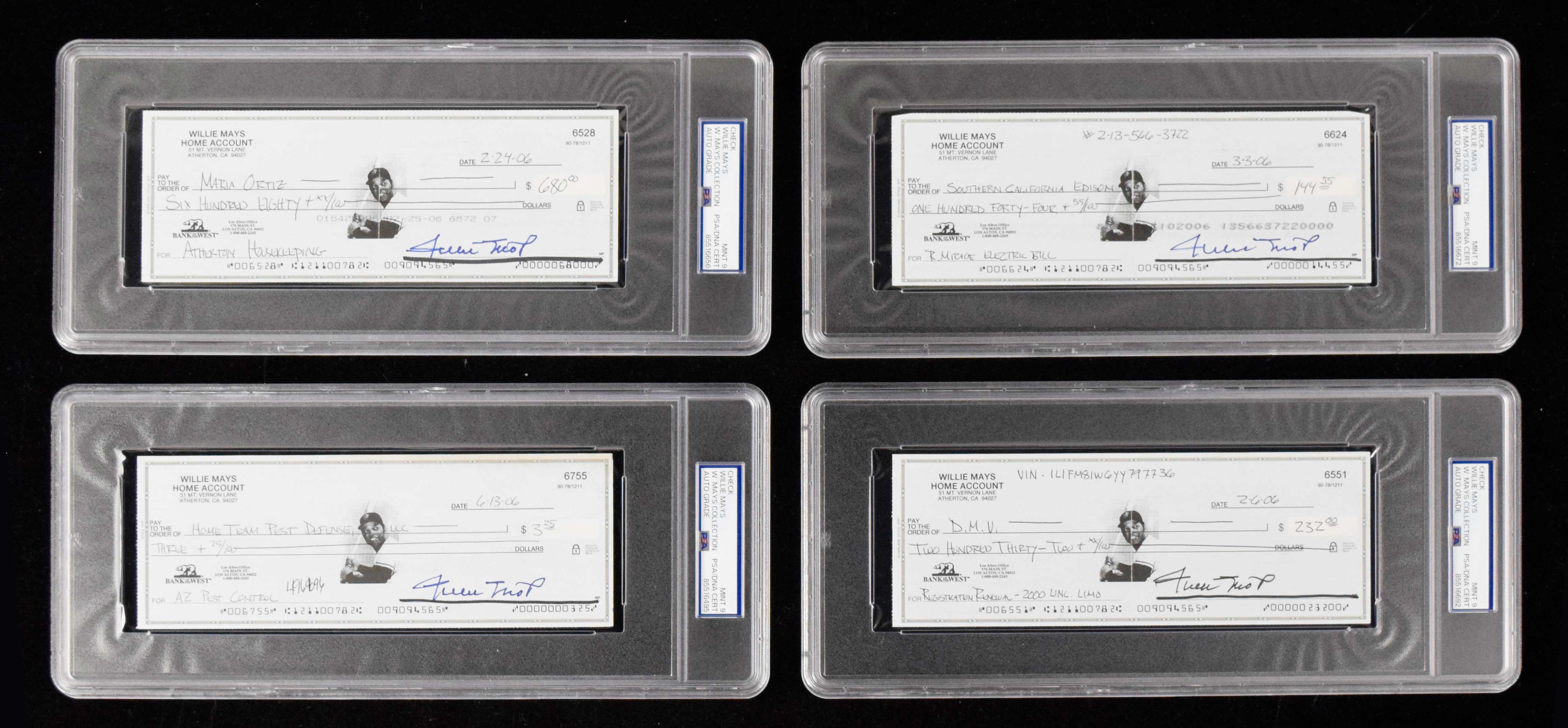 Description:Lot of (10) Willie Mays autographed checks (PSA/DNA 9 Mint). Nice lot of 2006 dated checks, each signed "Willie Mays" at lower right. All autographs are graded "9 Mint" by PSA and there are varying degrees of typical handling and bank cancellation wear (a touch more pronounced in some cases). Each is authenticated and encapsulated by PSA with "W.Mays Collection" noted on the label: Mint