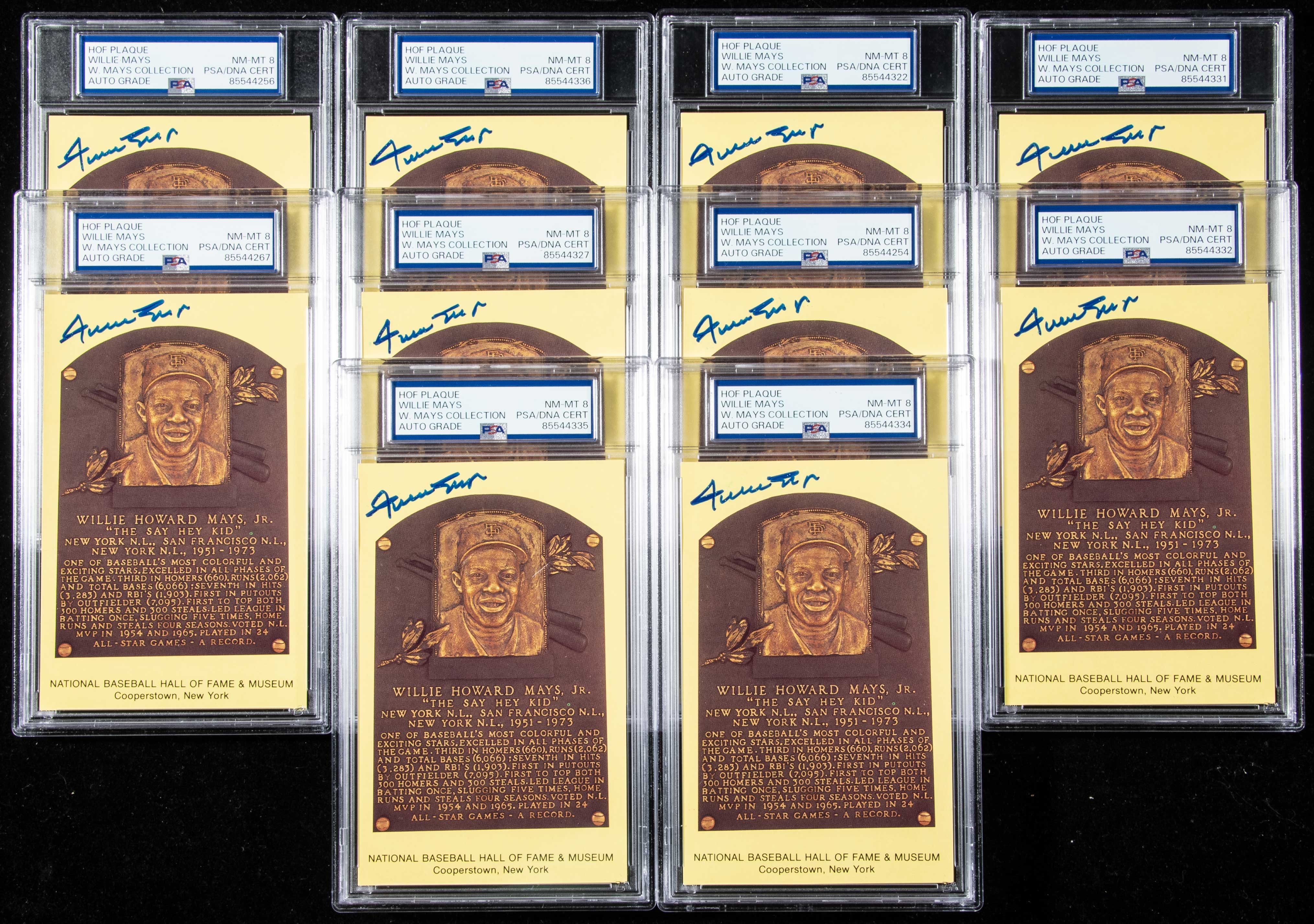 Description:Lot of (10) Willie Mays autographed Hall of Fame Plaque postcards (PSA/DNA 8 NM-MT). Group of ten yellow Hall of Fame plaque postcards each signed by Willie Mays in blue sharpie at the top margin. Signatures rate 8 out of 10. Encapsulated by PSA/DNA (8 NM-MT) with special "W.Mays Collection" pedigree labeling: NM-MT